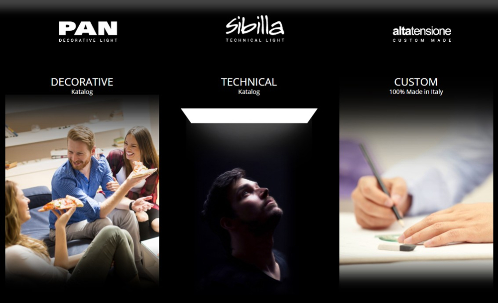 PAN INTERNATIONAL wurde 1987 gegründet. Mit einem durchschnittlichen Mitarbeiteralter von 35 Jahren erlebt unser gut organisiertes, dynamisches Unternehmen derzeit stetiges Wachstum und eine konstante Weiterentwicklung. Die neue Ausgabe unserer Kataloge umfasst drei komplette Kollektionen: PAN, SIBILLA und ALTATENSIONE. Unser Unternehmen wird Ihren gesamten lichttechnischen Anforderungen gerecht und deckt ein breites Angebot ab, das von der Innenraum- und Hausbeleuchtung über die Gartenbeleuchtung bis hin zur Außenbeleuchtung reicht und Vorschläge zur korrekten Arbeitsplatzbeleuchtung, sichere Lösungen für überfahrbare Leuchten, Strahlersysteme für Ausstellungsräume sowie theatralische Lichteffekte umfasst, mit denen die Architektur von Gebäuden betont wird. Unsere Produktionsstätte befindet sich in Italien. Vertrieb und Kundendienst auf hohem Niveau stehen im Mittelpunkt unseres Angebots. Unser modernes und effizientes, 5000 Quadratmeter umfassendes Depot garantiert die breite Verfügbarkeit von Produkten, einen regionalen Sofortlieferservice und einen leistungsfähigen Kundendienst. PAN Unser anspruchsvoller Katalog 2012/2013 führt über 1000 Artikel im klassischen und modernen Design in verschiedenen Ausführungen und Farben für die Wohnraumbeleuchtung im Innen- und Außenbereich auf. Unsere aktualisierte Produktpalette umfasst hochwertige und ästhetisch überzeugende Leuchtenkonzepte und Beleuchtungskörper, die den verschiedenartigen Ansprüchen unserer Kundschaft vollauf entsprechen. Sibilla LED SIBILLA wurde geschaffen, um dem unlängst stetig wachsenden Bedarf an technischer Beleuchtung gerecht zu werden: Der Katalog 2012 wartet mit einer riesigen Auswahl an Strahlersystemen und LED-Leuchten auf. Die neue LED-Kollektion überzeugt mit über 500 Artikeln in verschiedenen Ausführungen und Kategorien, welche die wichtigsten lichttechnischen Anforderungen abdecken und in insgesamt 50.000 möglichen Variationen verfügbar sind. Diese Produkte eignen sich ideal für Hotels und Restaurants, Geschäfte und Ausstellungsräume sowie Privatgebäude, jedoch weniger für die Architekturbeleuchtung. ALTATENSIONE LIGHTING Die Marke ALTATENSIONE wiederum wartet mit beleuchtungstechnischen Lösungen für Architektur in der Industrie, Büros, Geschäften, Ausstellungsbereichen, öffentlichen und Arbeitsplatzumgebungen, Wohnräumen und Gebäuden sowie speziellen Beleuchtungssystemen auf. Unser Ziel ist es, ein verlässlicher Partner in Italien für die Entwicklung und Umsetzung Ihrer Beleuchtungsprojekte zu sein. Altatensione wendet bedeutende Mittel für Forschung und Entwicklung auf und entwirft alle Produkte entweder intern oder in enger Zusammenarbeit mit Designern und Beleuchtungsprofis. Das technische Büro von Altatensione ist ein bevorzugter Partner für Designer, Techniker und Profis aus der Beleuchtungsbranche. Unsere Mitarbeiter bieten Ihnen die notwendige Unterstützung für die Entwicklung von Innen- und Außenbeleuchtungsprojekten, empfehlen Ihnen das geeignetste Produkt von Altatensione und tun alles, um Ihren Wünschen zu entsprechen.
