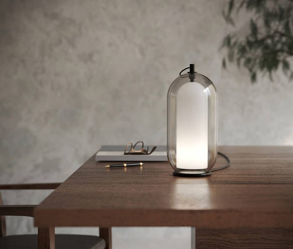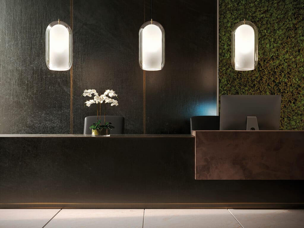 Aeron ist eine neue Familie von Hänge- und Tischleuchten. Der komplett aus mundgeblasenem Glas gefertigte Korpus zeichnet sich durch Doppelkammerglas aus. Die Innenkammer ist satiniert, um das Licht harmonischer und natürlicher zu streuen und Blendungen zu reduzieren, während die Außenfläche transparent ist und in verschiedenen Farben hergestellt werden kann. Die Metallrahmen sind in den Farben Chrom, Satingold und Satinschwarznickel erhältlich.