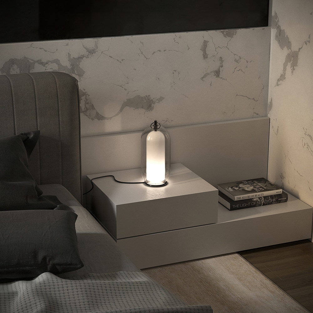 Die Lampe ist sehr leicht, die Glaskuppel scheint das Licht zu schützen und es für immer leuchten zu lassen, wie ein Schrein. Das Licht wird entlang der großzügigen Innenfläche der Leuchte sehr gleichmäßig gestreut und gewährleistet so eine sehr hohe Lichtqualität. Die klaren Linien ermöglichen eine große Vielseitigkeit bei der Installation, sowohl für den häuslichen Bereich als auch für Hotels, Restaurants und den Einzelhandel.