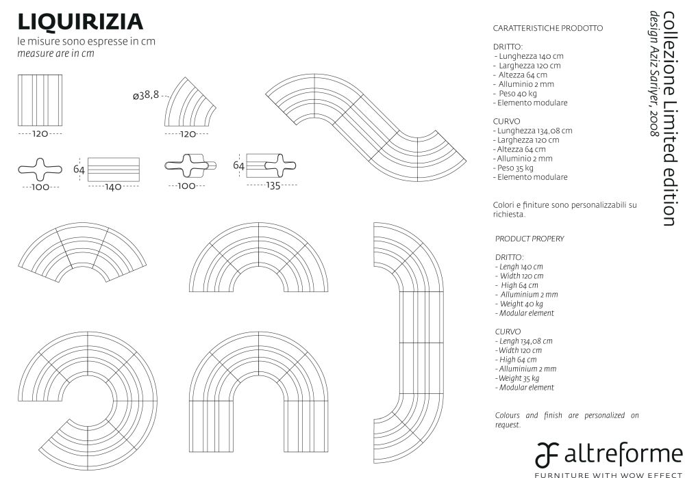Design: Aziz Sariyer Liquirizia ist ein bausteinförmiger Stuhl. Schon aus dem Namen erinnert dieses Produkt an die leckere Süßigkeit und genau wie sie kann die Sitzung modular oder unendlich zum Genuss sein. Liquirizia wird über Sie und über die Kurven Ihres Herzes sprechen, jedes Mal nach verschieden Linien… jedes Mal altreforme. Rücken gegen Rücken werden die Leute in romantischen, unendlichen Legionen von unheilbaren Verliebten sitzenbleiben. Liquirizia Sitzungen sind Ringe zur Begegnung und Unterhaltung, choreografische Runde mit immer unterschiedlichem Zeichnen, unschuldige Gefräßigkeit Sünde für echte Kenner. Mindestkonfigurationen für selbststehende Sitzeinheiten: – 3 geschwungene Module – 2 geschwungene Module und ein gerades Modul Ein einziges krummliniges oder gerades Modul muss im Boden fixiert werden, um zu stehen.