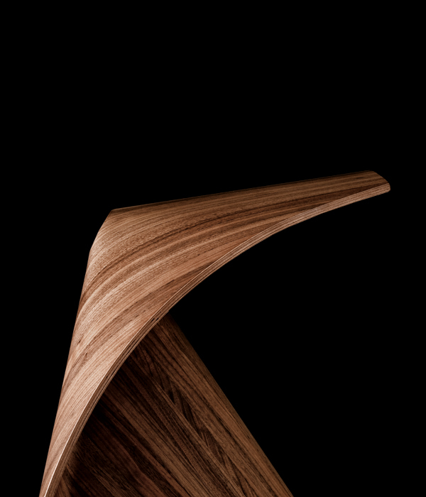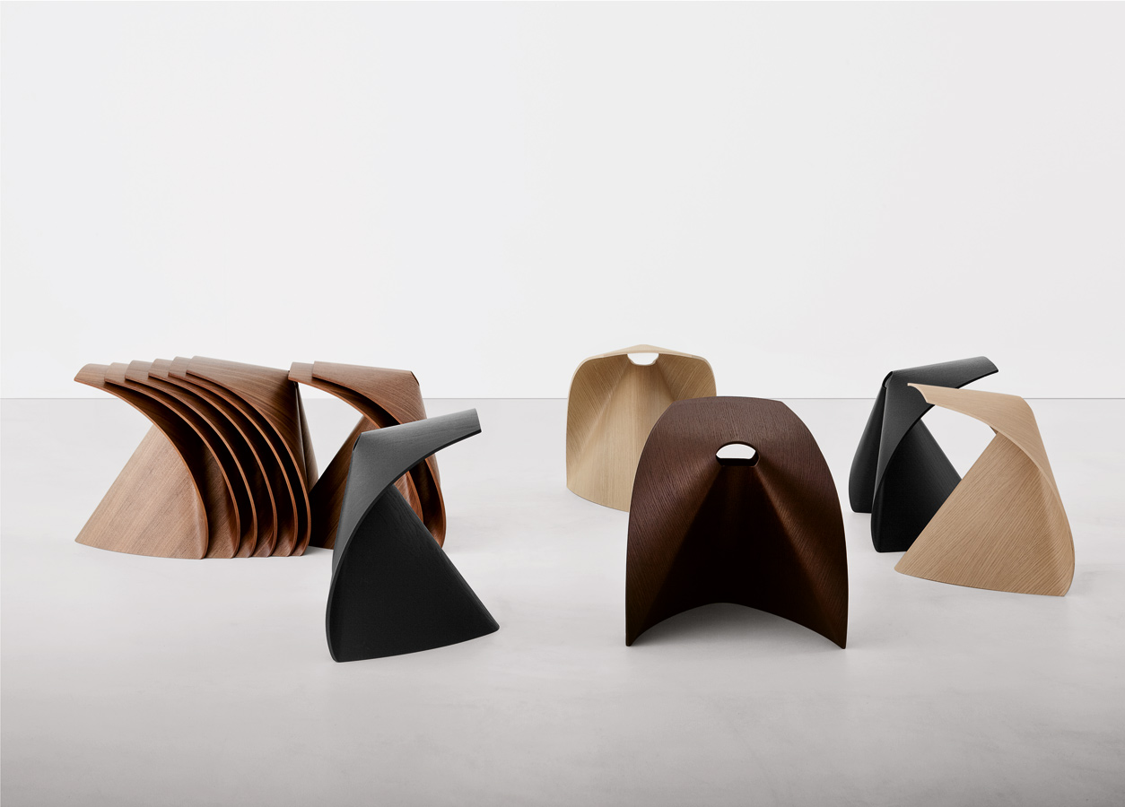 Der stapelbare Hocker aus geformtem Multiplex ist in Eiche gebleicht, dunkel nussbaum oder schwarz gebeizt und Nussbaum Canaletto erhältlich.