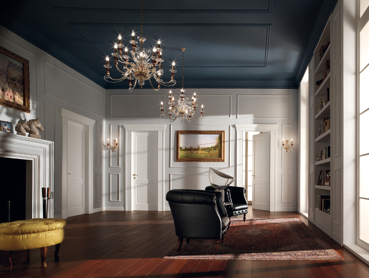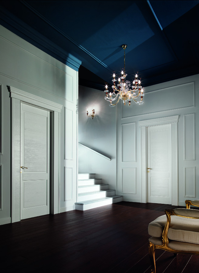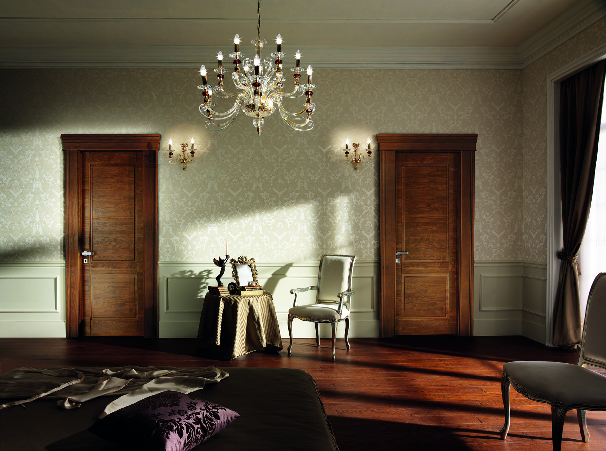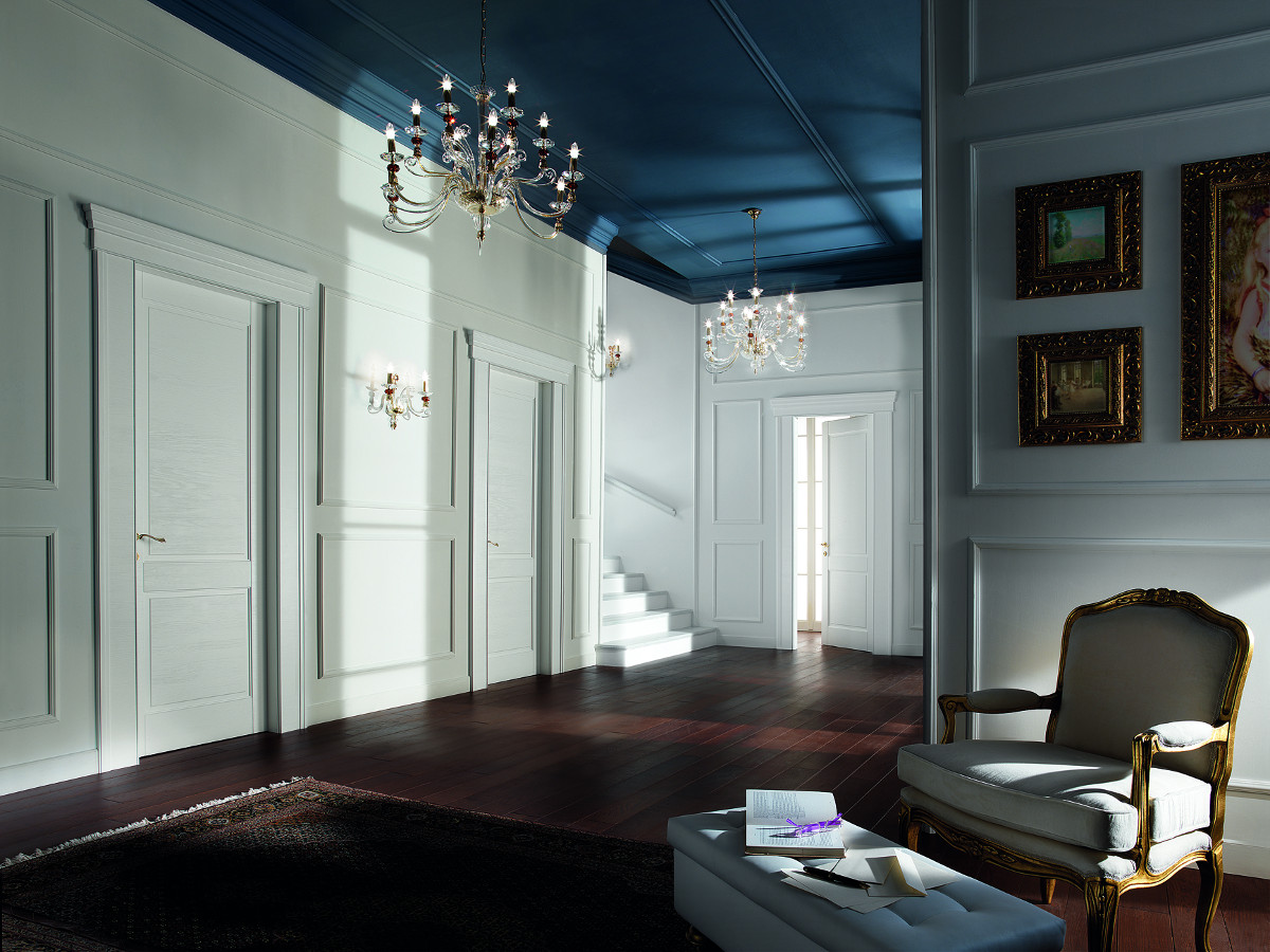Entdecken Sie die Details der ARCA-Türen: Rahmen und Blenden aus lamelliertem Massivholz; Tür-Bossenwerk aus massiven Stabhölzern; glatte Tür aus Tannen-Stabhölzern; Bandscharniere.