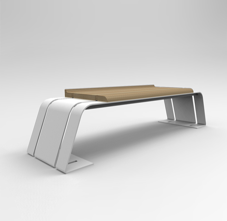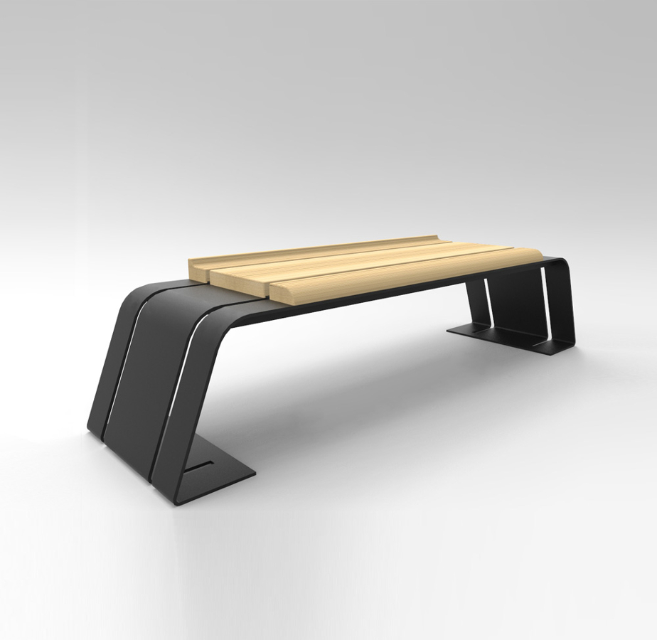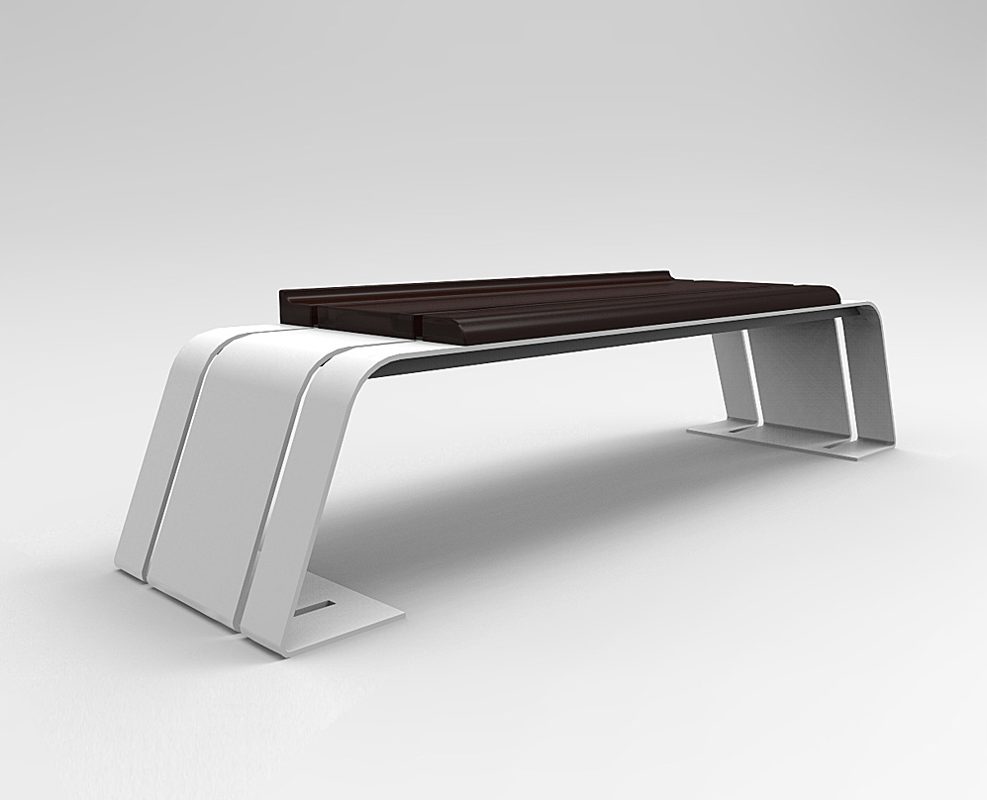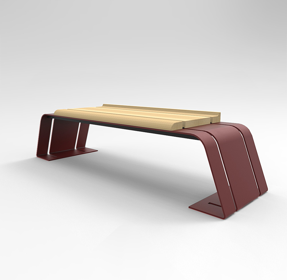 COMPOSITION : – Structure in galvanaized and paintes steel,laser cutting and bent. – Seat with 3 exotic wood bars section 100×60 – 260×40 – 100×40 mm