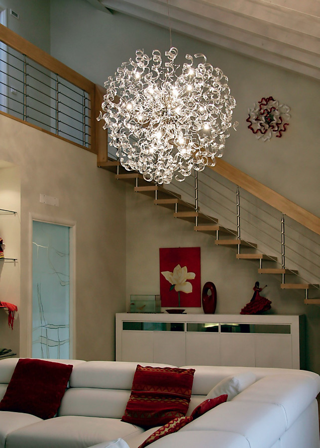 Hängeleuchte mit Feinbearbeitung aus Chrom/Klarglas-Stücken Ø 115 cm – H 190 cm 18 x 40W G9 n.100 Glaselemente