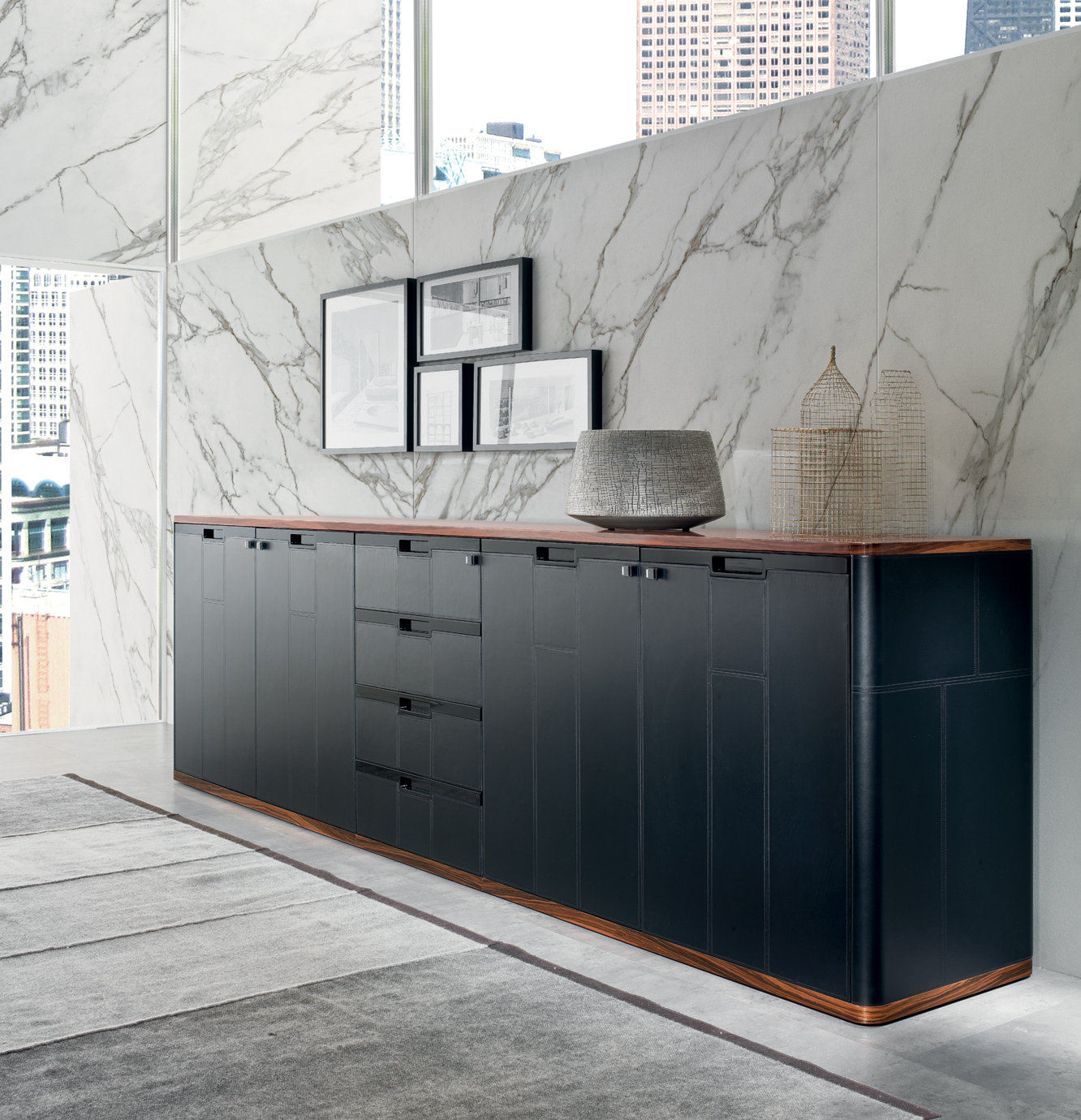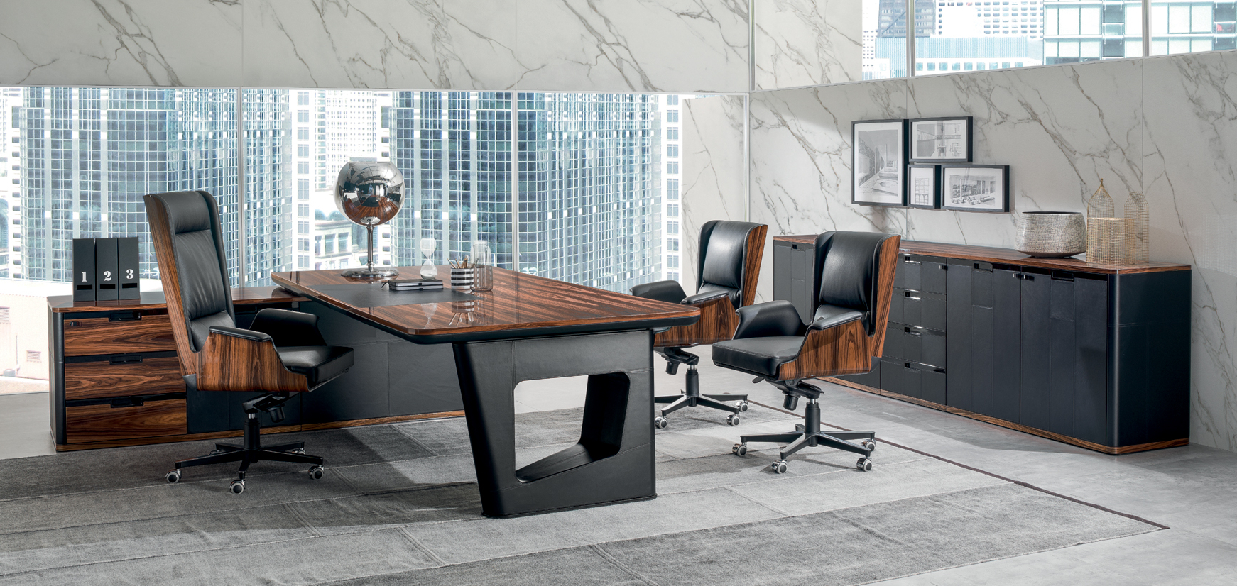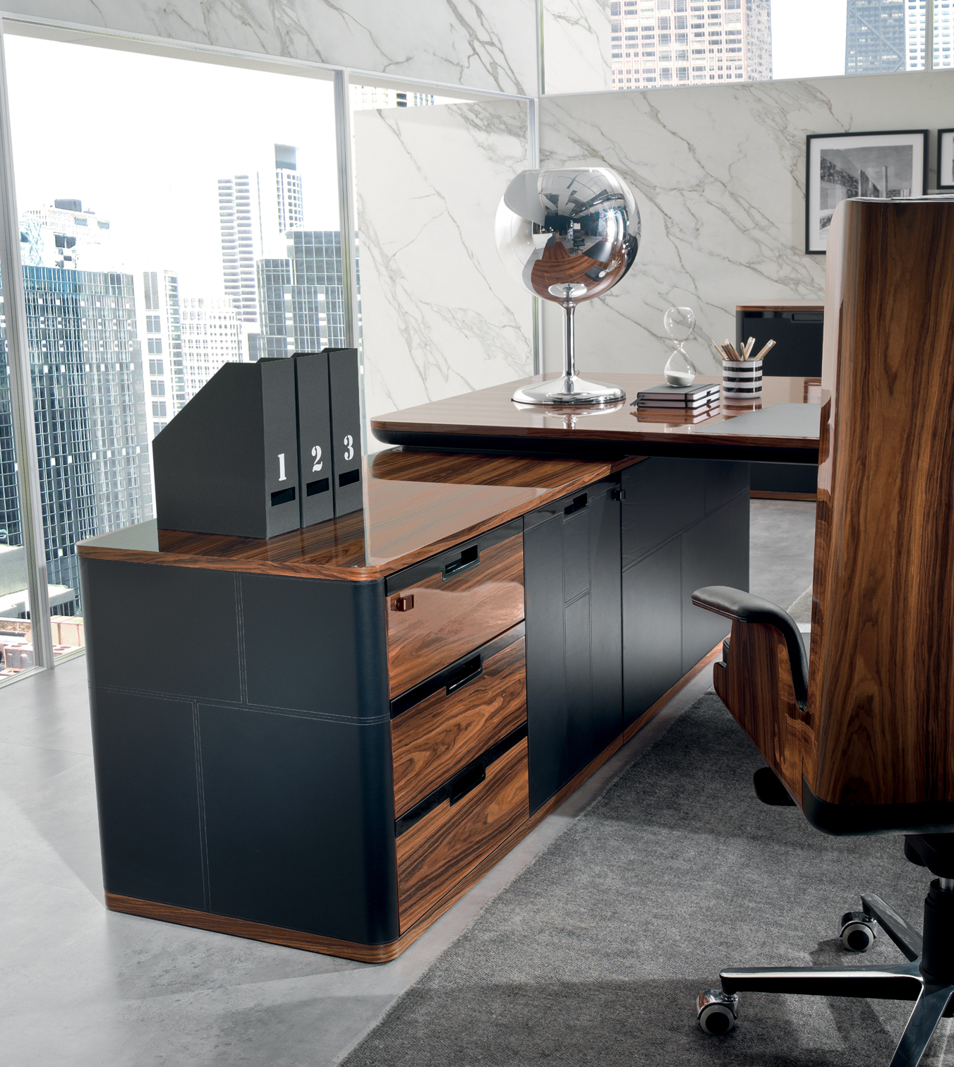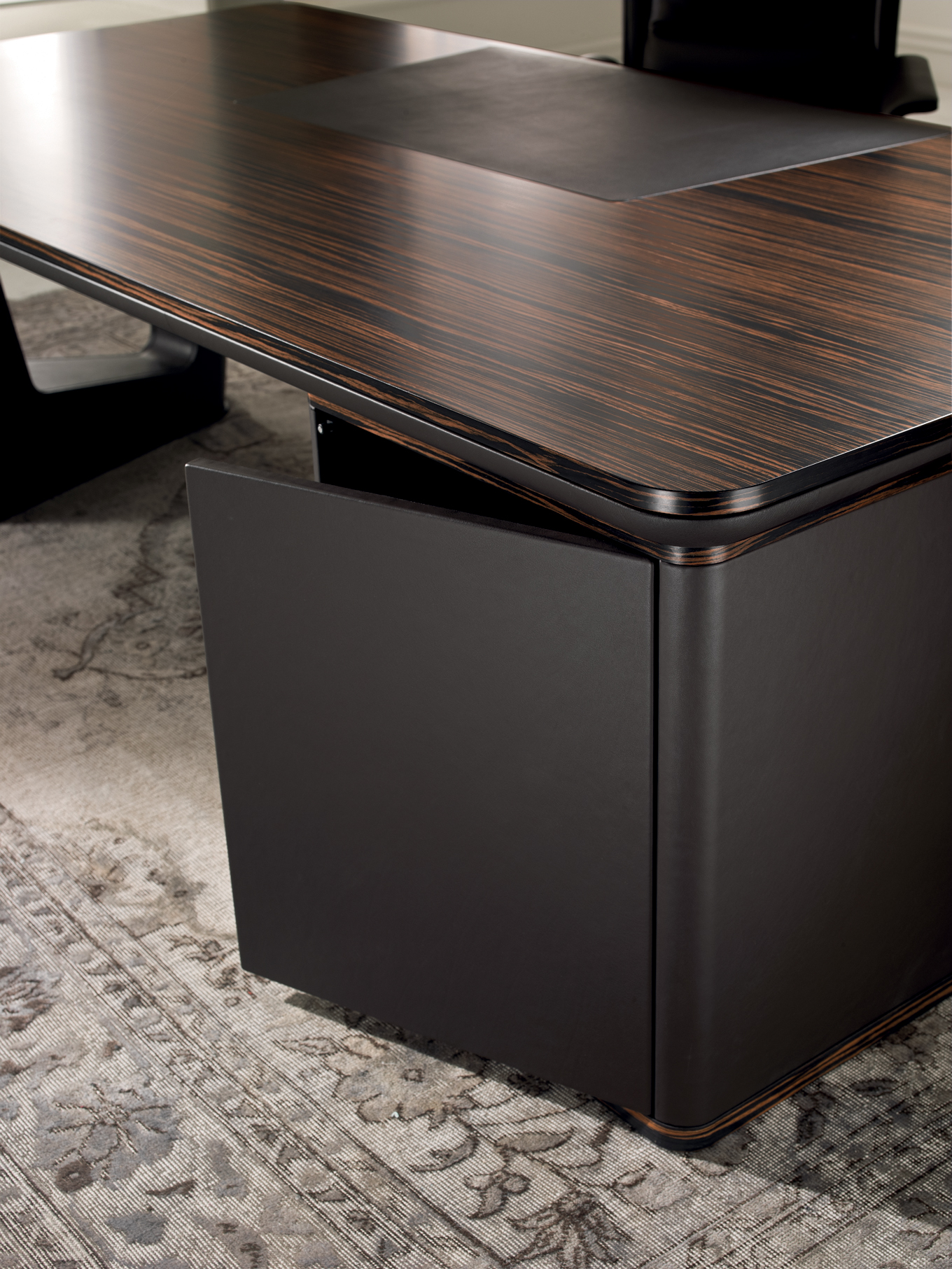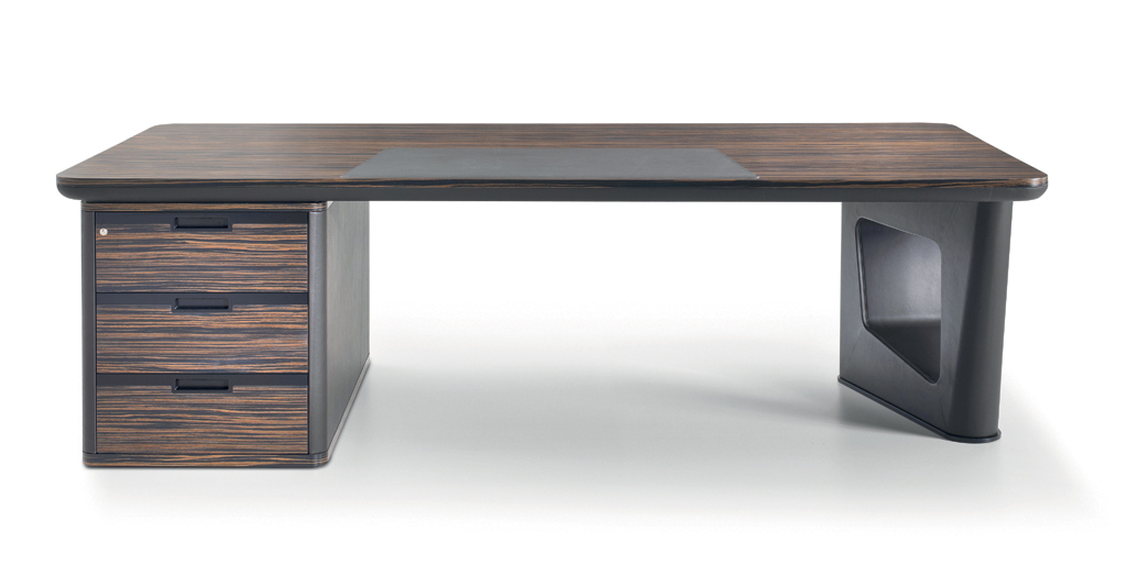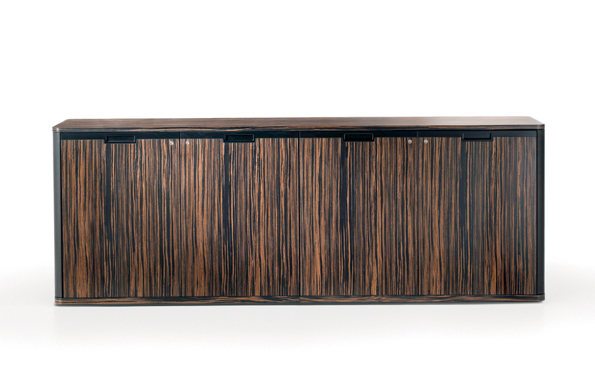 AVATAR ist in mehreren Kombinationen erhältlich, die zwei Arten von Materialien verwenden: – Sattelleder oder Leder. Das Sattelleder und Leder werden immer auf schwarz melaminbeschichtete Platten, von unterschiedlicher Dicke, entsprechend dem Gebrauch angewendet. – Schwarzes Walnussholz oder ähnliches Ebenholzholz. Diese beiden Wälder sind zu Spanplatten, mit variabler Dicke, entsprechend der Verwendung furniert. Es ist auch das Einlegefurnier mit quadratisch gegenüberliegender Form für die Oberseite des Schreibtisches und für die Türen vorhanden. Auf Wunsch ist das Modell auch in jeder anderen Holzveredelung der Kollektion erhältlich. Die Tops der Schreibtische und der Konferenztische bestehen aus einem schwarzen melaminbeschichteten Panel-Untertisch mit einer Dicke von 40 mm. Mit abgerundeten Kanten mit Sattelleder oder Leder und mit einem Untertisch mit einer Dicke von 20 mm. Das kann mit Sattelleder oder Leder oder furniert bedeckt werden; Im Falle von furniertem Oberteil befindet sich eine zentrale Einlage aus Sattelleder oder Leder. Unter den subtops gibt es verstärken stahlstangen Die Beine bestehen aus zwei symmetrischen Stücken, die aufeinander geklebt sind, aus starrem Polyurethankälte, die in Schimmel geformt und nach Sattelleder oder Leder bezogen ist. Irgendwann kann das dekorative Loch in der Mitte des Beines mit zwei Spanplatten verdeckt werden, die mit Sattelleder oder Leder oder furniert verkleidet sind. An der Unterseite des Beines ist ein Metallblech schwarz lackiert mit unterschiedlicher Abmessung nach dem Schreibtisch oder dem Konferenztisch befestigt. Der runde Konferenztisch hat ein zentrales Bein aus Spanplatten, das mit Sattelleder oder in Leder mit einem runden, schwarz lackierten Blech bedeckt ist Die Bescheidenheit wird mit einer Spanplattenplatte mit einer Dicke von 20 mm hergestellt, die mit einer zentralen Sattelleder oder Leder verkleidet ist. Das Bein, in seiner Funktion der Stützung der Oberseite, kann durch einen Sockelschrank ersetzt werden oder mit einem rückseitigen Sideboard-Schrank, der auf dem subtop lehnt. Der feste Sockel ist komplett mit Sattelleder oder Leder bezogen. Die Fronten des Sockels sowie die versteckte Tür der Besucher-Seite (mit Öffnungs-System Push & Pull) sind furniert oder mit Sattelleder oder Leder bezogen. Die Kanten der Oberseite und der Unterseite des festen Sockels sind immer furniert. Der rückseitige Sideboard-Schrank hat einen Rahmen in schwarzen melaminbeschichteten Platten unterschiedlicher Dicke und kann von beiden Seiten zugänglich sein. Die Oberseite ist immer furniert sowie die Kanten der Basis. Sowohl die Innen- als auch die Außenseite werden mit einer Schliessplatte vervollständigt – mit Sattelleder, Leder oder furniert versehen – und mit zwei Einheiten; Für die beiden externen Geräte sind nur Türen mit Sattelleder, Leder oder furniert (mit dem Push & Pull-Öffnungs-System), während für die beiden internen Einheiten sind auch Schubladen und Dateien mit Sattel Leder, in Leder oder furniert bedeckt. Die Griffe sind mit einer Einlage aus massivem schwarzem Walnussholz verklebt mit zylindrischen Dübeln an die Spanplatte, die die Tür oder die Schublade zusammensetzt. Diese Griffe sind in schwarzem Walnussholz oder schwarz matt lackiert erhältlich. Die Rahmen der niedrigen, mittleren und hohen Schränke werden in schwarzen melaminbeschichteten Platten mit einer Dicke zwischen 8 und 20mm hergestellt. Die Seitenwände sind an Rahmen befestigt und haben eine Dicke von 4 cm in schwarz beschichteten Tafeln, die mit Sattelleder oder Leder bezogen sind. Die Oberseite ist aus einer Platte mit einer Dicke von 20 mm hergestellt. Die Schubladen und Aktenschubladen und die Türen sind in Sattelleder, Leder oder furniert erhältlich. Der offene Schrankrahmen ist immer mit der hinteren Tafel mit Sattelleder oder Leder verkleidet. Die niedrigen Tische sind mit einer Platte von 20 mm Dicke furniert oder mit Sattel Leder oder Leder bedeckt, während die Beine sind immer mit Sattel Leder oder Leder bedeckt.