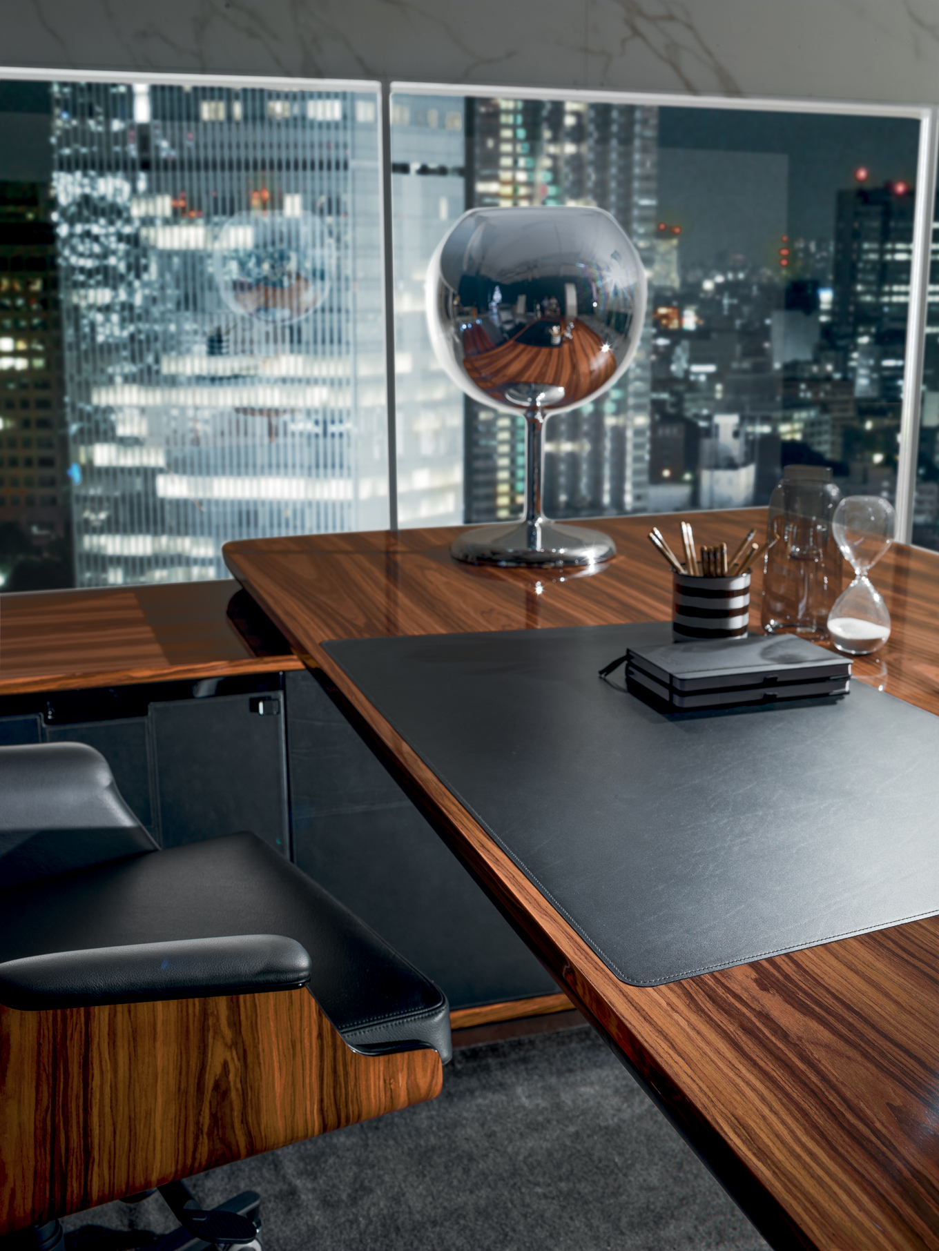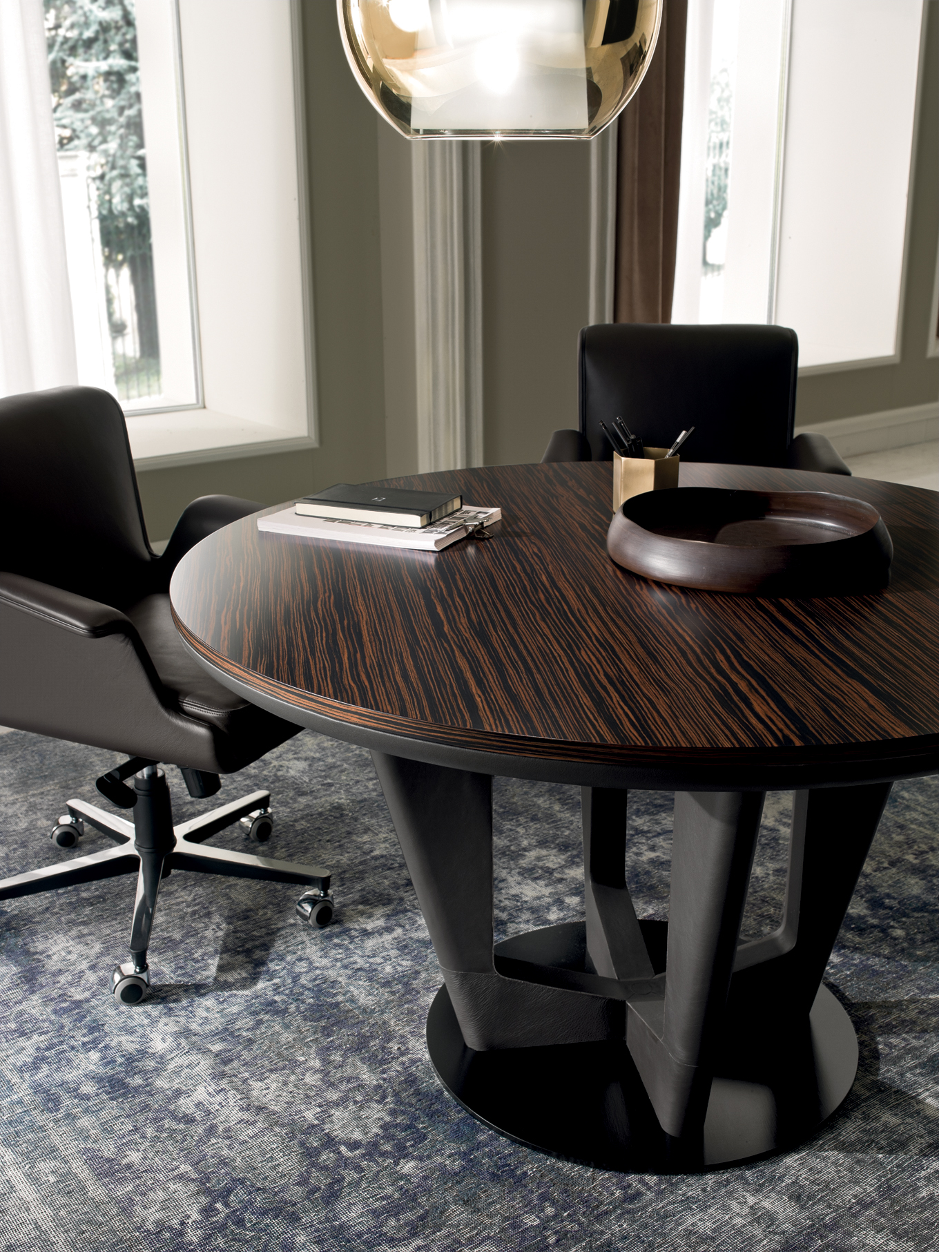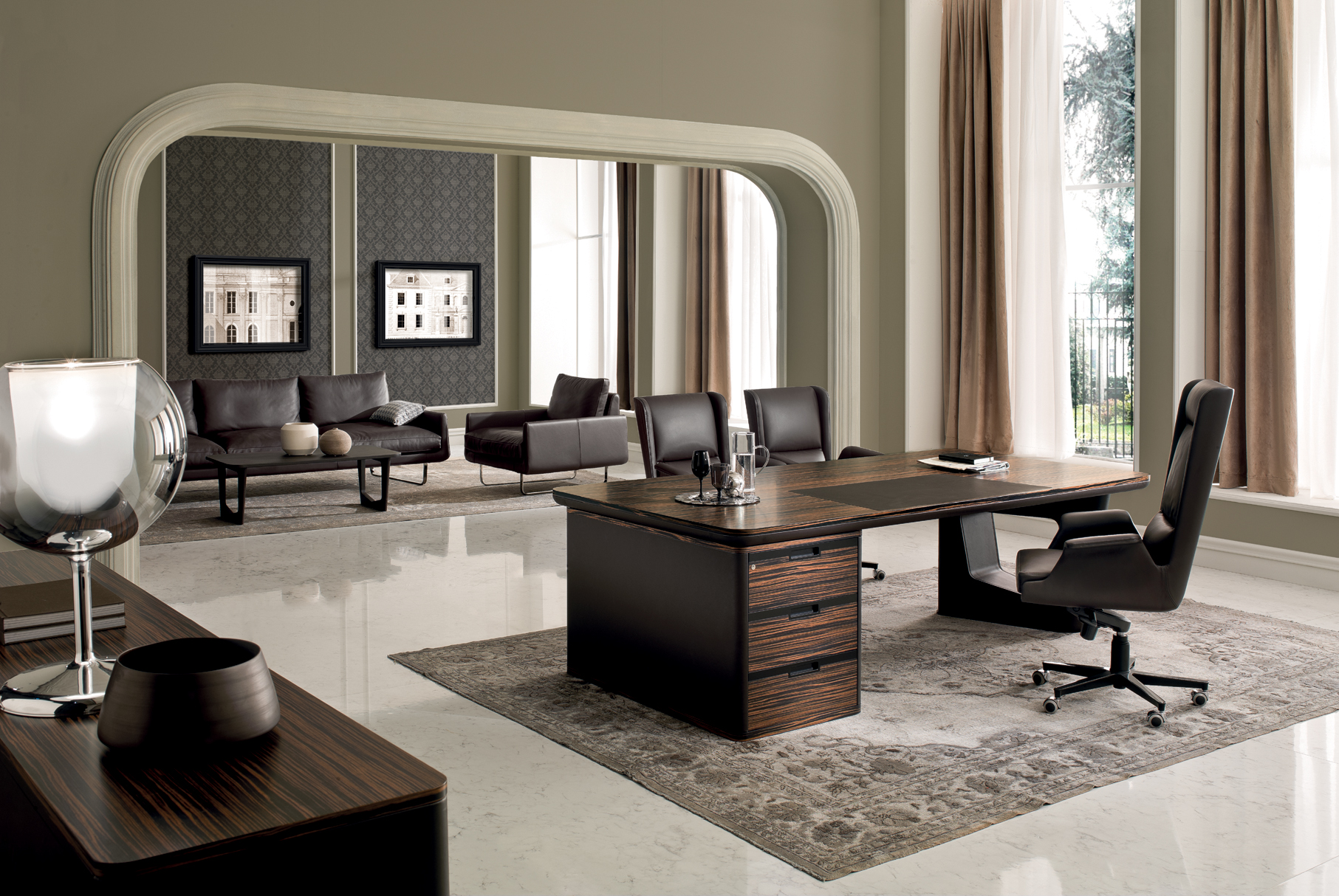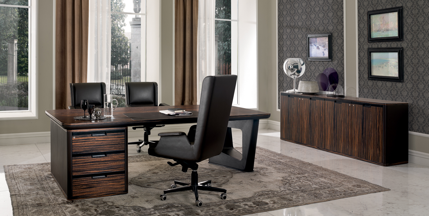 AVATAR ist in mehreren Kombinationen erhältlich, die zwei Arten von Materialien verwenden: – Sattelleder oder Leder. Das Sattelleder und Leder werden immer auf schwarz melaminbeschichtete Platten, von unterschiedlicher Dicke, entsprechend dem Gebrauch angewendet. – Schwarzes Walnussholz oder ähnliches Ebenholzholz. Diese beiden Wälder sind zu Spanplatten, mit variabler Dicke, entsprechend der Verwendung furniert. Es ist auch das Einlegefurnier mit quadratisch gegenüberliegender Form für die Oberseite des Schreibtisches und für die Türen vorhanden. Auf Wunsch ist das Modell auch in jeder anderen Holzveredelung der Kollektion erhältlich. Die Tops der Schreibtische und der Konferenztische bestehen aus einem schwarzen melaminbeschichteten Panel-Untertisch mit einer Dicke von 40 mm. Mit abgerundeten Kanten mit Sattelleder oder Leder und mit einem Untertisch mit einer Dicke von 20 mm. Das kann mit Sattelleder oder Leder oder furniert bedeckt werden; Im Falle von furniertem Oberteil befindet sich eine zentrale Einlage aus Sattelleder oder Leder. Unter den subtops gibt es verstärken stahlstangen Die Beine bestehen aus zwei symmetrischen Stücken, die aufeinander geklebt sind, aus starrem Polyurethankälte, die in Schimmel geformt und nach Sattelleder oder Leder bezogen ist. Irgendwann kann das dekorative Loch in der Mitte des Beines mit zwei Spanplatten verdeckt werden, die mit Sattelleder oder Leder oder furniert verkleidet sind. An der Unterseite des Beines ist ein Metallblech schwarz lackiert mit unterschiedlicher Abmessung nach dem Schreibtisch oder dem Konferenztisch befestigt. Der runde Konferenztisch hat ein zentrales Bein aus Spanplatten, das mit Sattelleder oder in Leder mit einem runden, schwarz lackierten Blech bedeckt ist Die Bescheidenheit wird mit einer Spanplattenplatte mit einer Dicke von 20 mm hergestellt, die mit einer zentralen Sattelleder oder Leder verkleidet ist. Das Bein, in seiner Funktion der Stützung der Oberseite, kann durch einen Sockelschrank ersetzt werden oder mit einem rückseitigen Sideboard-Schrank, der auf dem subtop lehnt. Der feste Sockel ist komplett mit Sattelleder oder Leder bezogen. Die Fronten des Sockels sowie die versteckte Tür der Besucher-Seite (mit Öffnungs-System Push & Pull) sind furniert oder mit Sattelleder oder Leder bezogen. Die Kanten der Oberseite und der Unterseite des festen Sockels sind immer furniert. Der rückseitige Sideboard-Schrank hat einen Rahmen in schwarzen melaminbeschichteten Platten unterschiedlicher Dicke und kann von beiden Seiten zugänglich sein. Die Oberseite ist immer furniert sowie die Kanten der Basis. Sowohl die Innen- als auch die Außenseite werden mit einer Schliessplatte vervollständigt – mit Sattelleder, Leder oder furniert versehen – und mit zwei Einheiten; Für die beiden externen Geräte sind nur Türen mit Sattelleder, Leder oder furniert (mit dem Push & Pull-Öffnungs-System), während für die beiden internen Einheiten sind auch Schubladen und Dateien mit Sattel Leder, in Leder oder furniert bedeckt. Die Griffe sind mit einer Einlage aus massivem schwarzem Walnussholz verklebt mit zylindrischen Dübeln an die Spanplatte, die die Tür oder die Schublade zusammensetzt. Diese Griffe sind in schwarzem Walnussholz oder schwarz matt lackiert erhältlich. Die Rahmen der niedrigen, mittleren und hohen Schränke werden in schwarzen melaminbeschichteten Platten mit einer Dicke zwischen 8 und 20mm hergestellt. Die Seitenwände sind an Rahmen befestigt und haben eine Dicke von 4 cm in schwarz beschichteten Tafeln, die mit Sattelleder oder Leder bezogen sind. Die Oberseite ist aus einer Platte mit einer Dicke von 20 mm hergestellt. Die Schubladen und Aktenschubladen und die Türen sind in Sattelleder, Leder oder furniert erhältlich. Der offene Schrankrahmen ist immer mit der hinteren Tafel mit Sattelleder oder Leder verkleidet. Die niedrigen Tische sind mit einer Platte von 20 mm Dicke furniert oder mit Sattel Leder oder Leder bedeckt, während die Beine sind immer mit Sattel Leder oder Leder bedeckt.