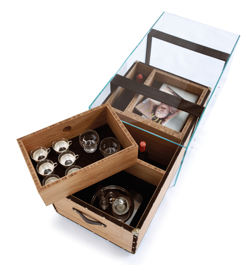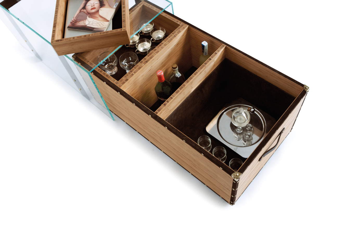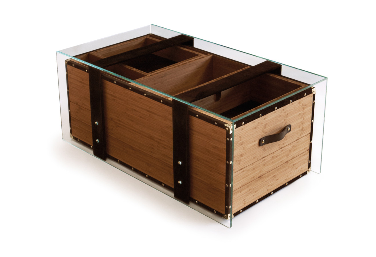 materials: _ Outer layer in extra-clear crystal glass. _ Multi-directional multilayer bamboo structure and tray _ Leather trimmings, interior and handles _ Brass corners and nails