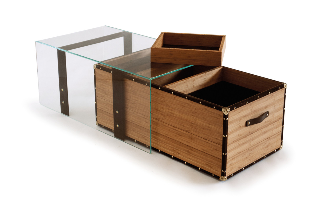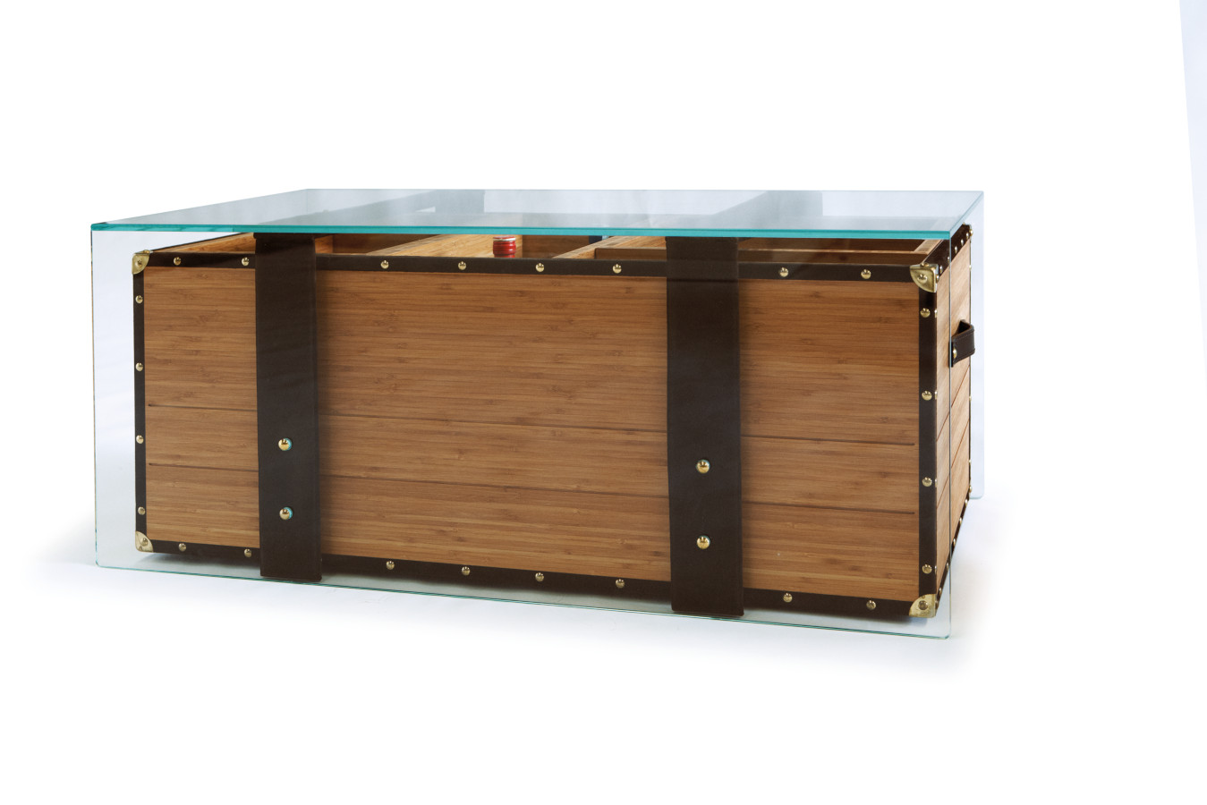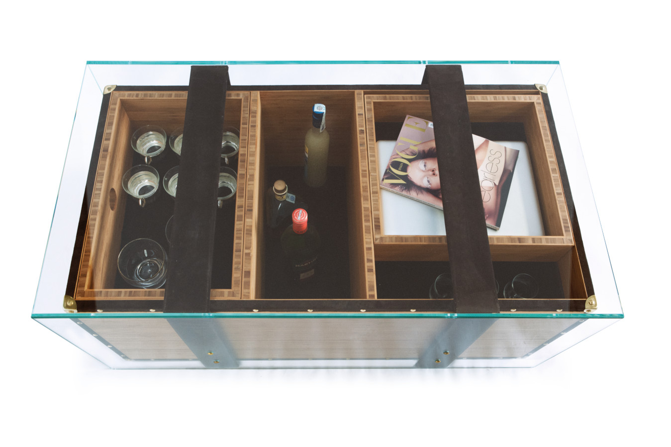 materials: _ Outer layer in extra-clear crystal glass. _ Multi-directional multilayer bamboo structure and tray _ Leather trimmings, interior and handles _ Brass corners and nails