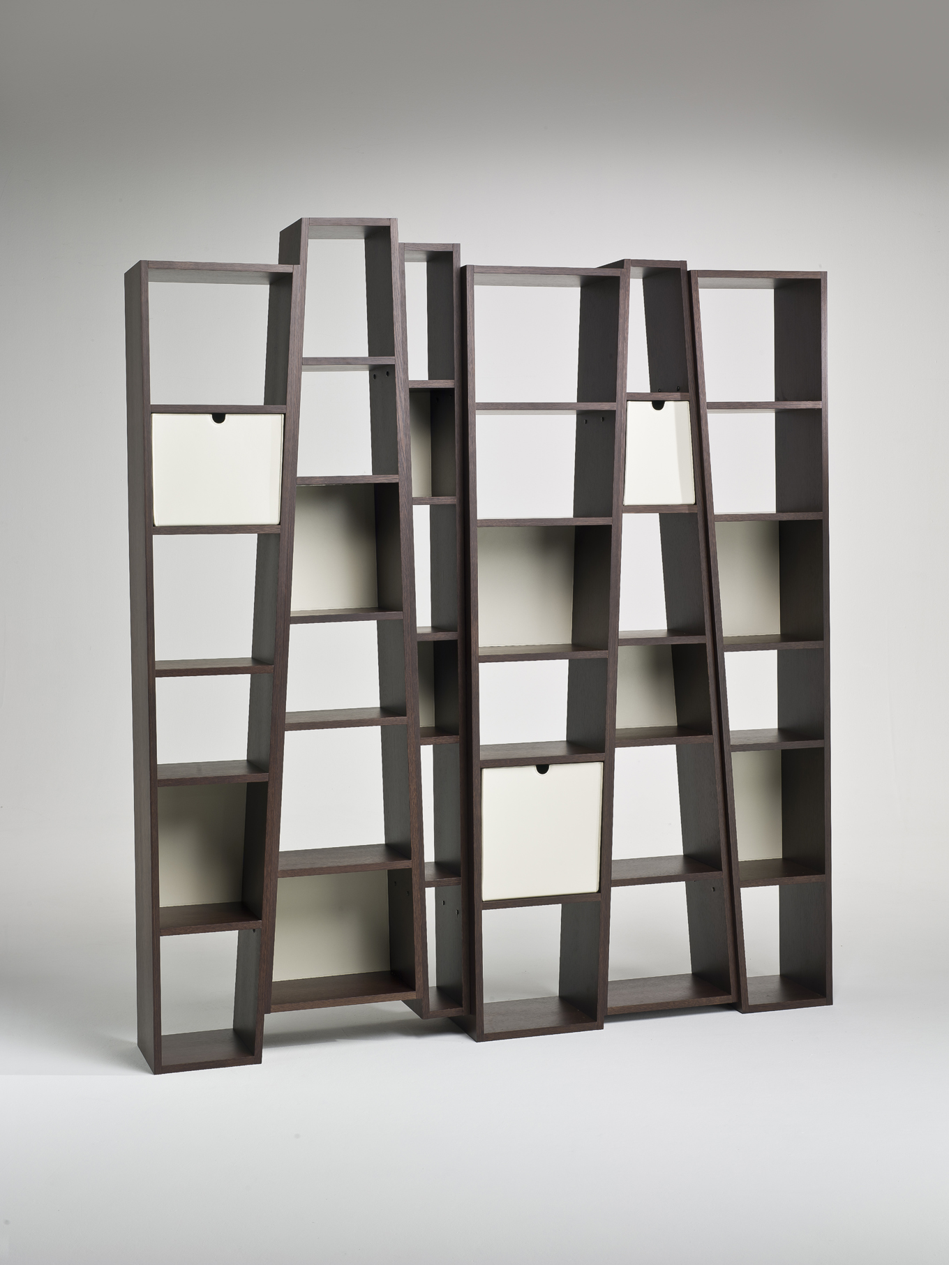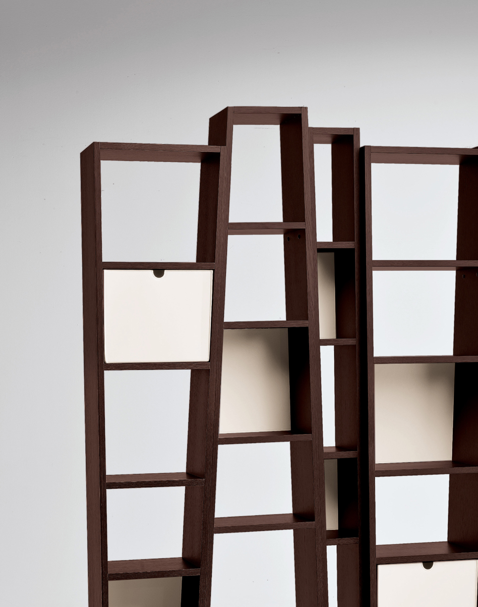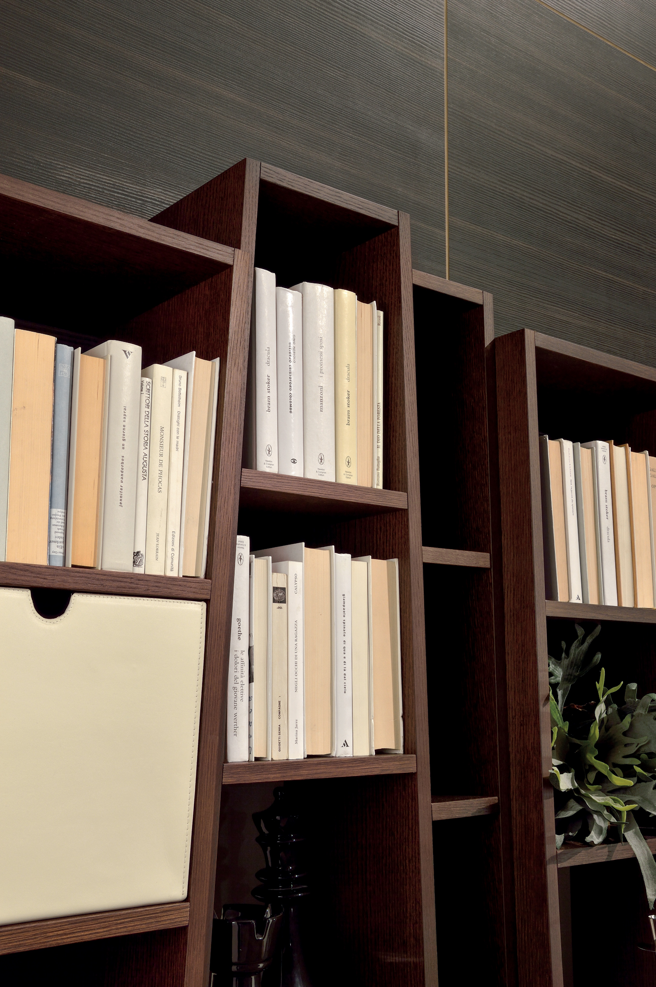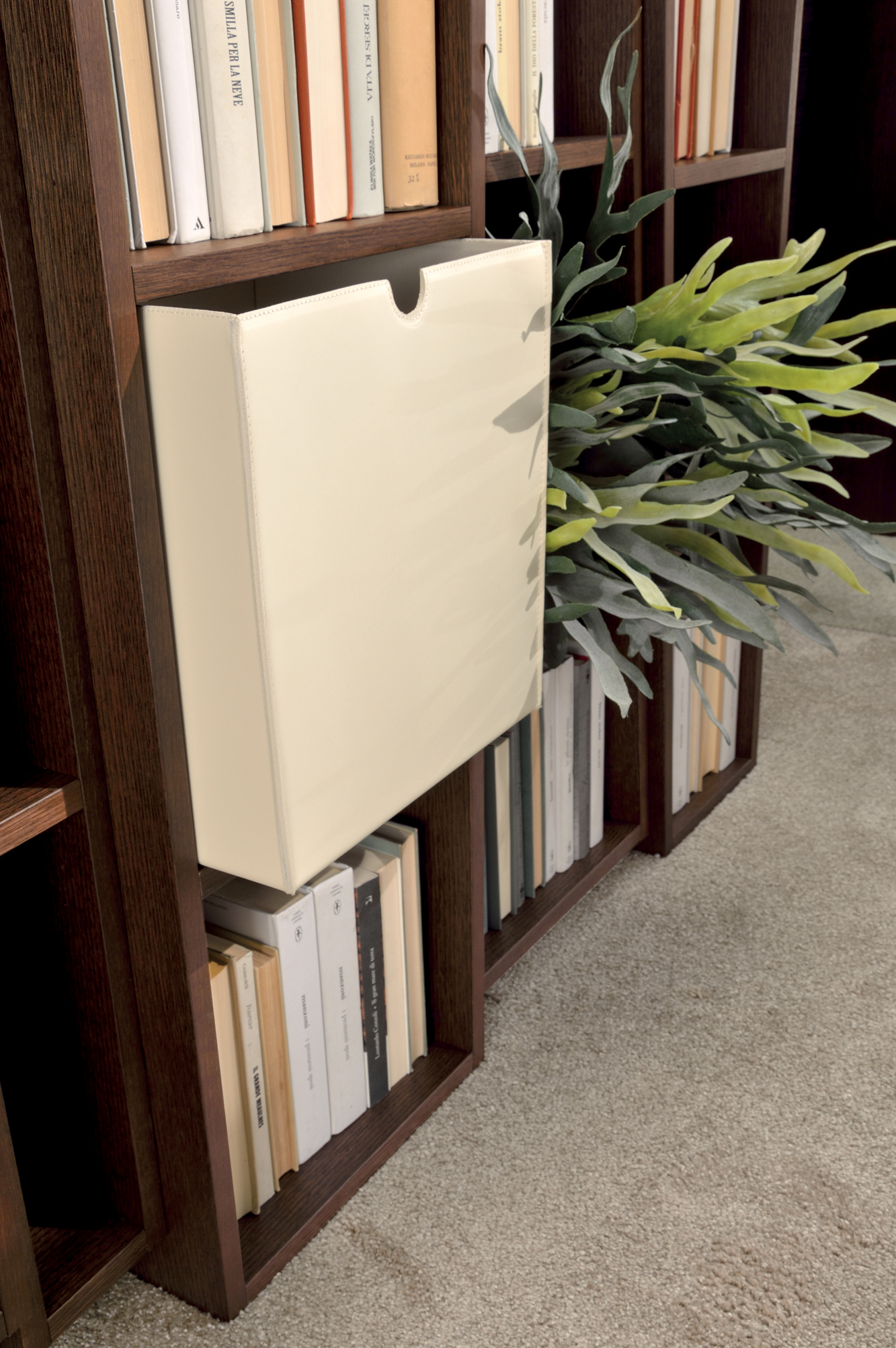 Der Rahmen des Bucherregals wird in Holzstueckchen Panelen in Eiche-Holz furnierte 20 mm staerke gemacht; die vorhandenen Schichten sind: gebleichte Eiche, Eiche faerbte sich dunkel grau oder Eiche gefaerbt in dunkelbraun. Der Ruecken wird in Rindleder bedeckt, die Behaelter sind in Rindleder.