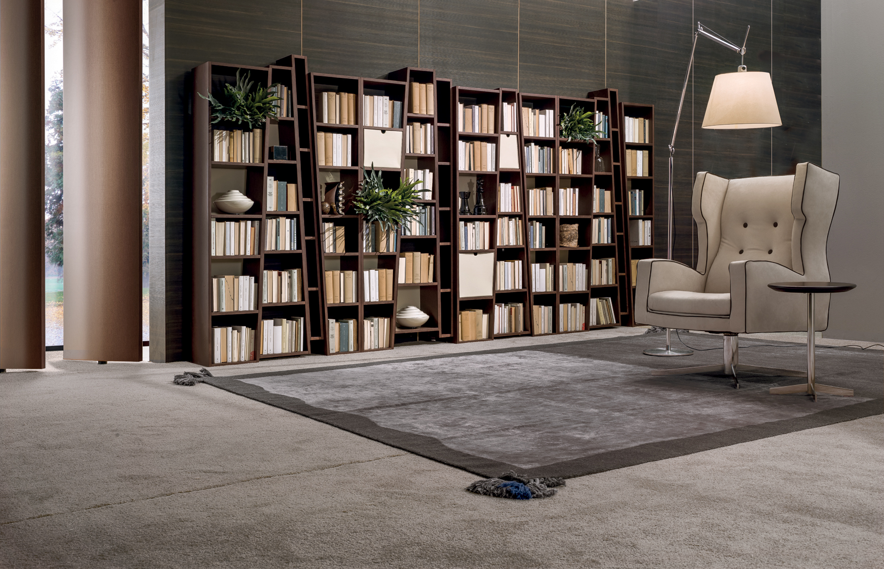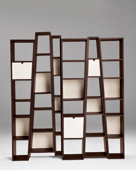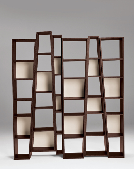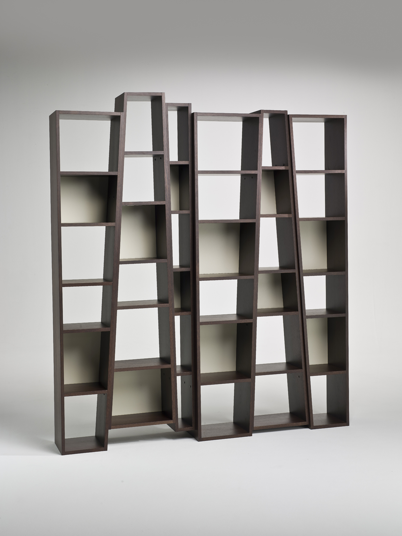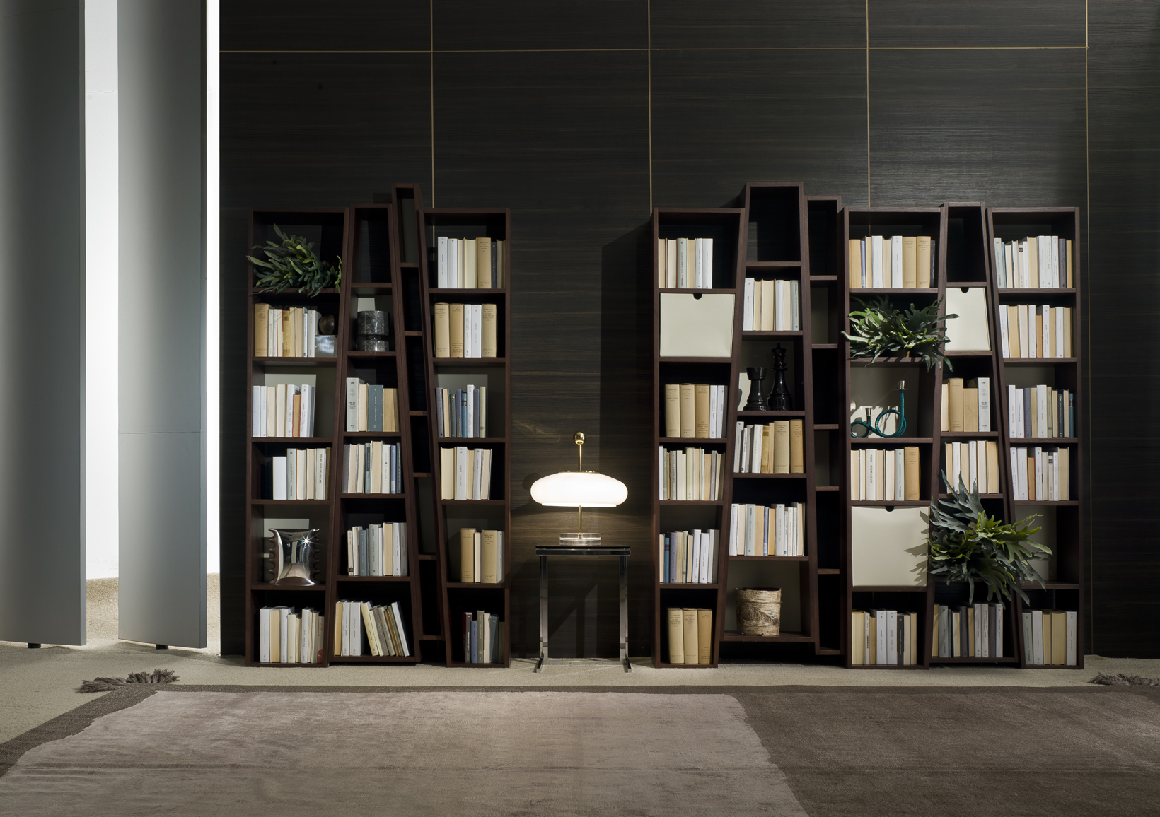 Der Rahmen des Bucherregals wird in Holzstueckchen Panelen in Eiche-Holz furnierte 20 mm staerke gemacht; die vorhandenen Schichten sind: gebleichte Eiche, Eiche faerbte sich dunkel grau oder Eiche gefaerbt in dunkelbraun. Der Ruecken wird in Rindleder bedeckt, die Behaelter sind in Rindleder.