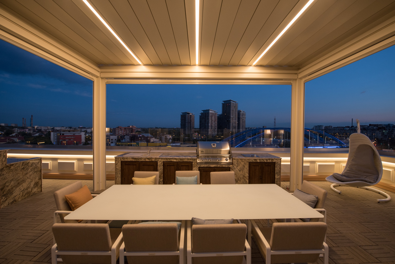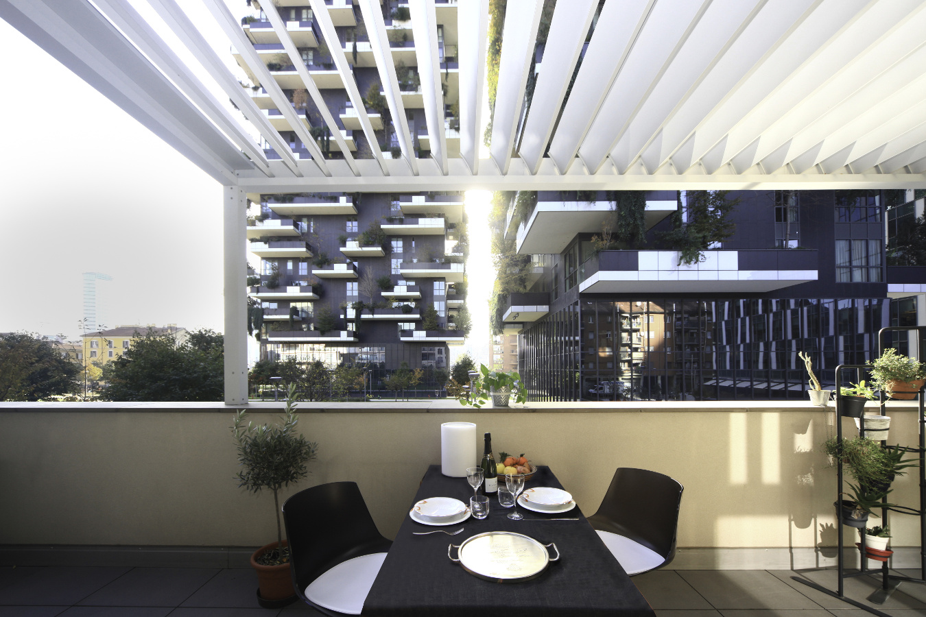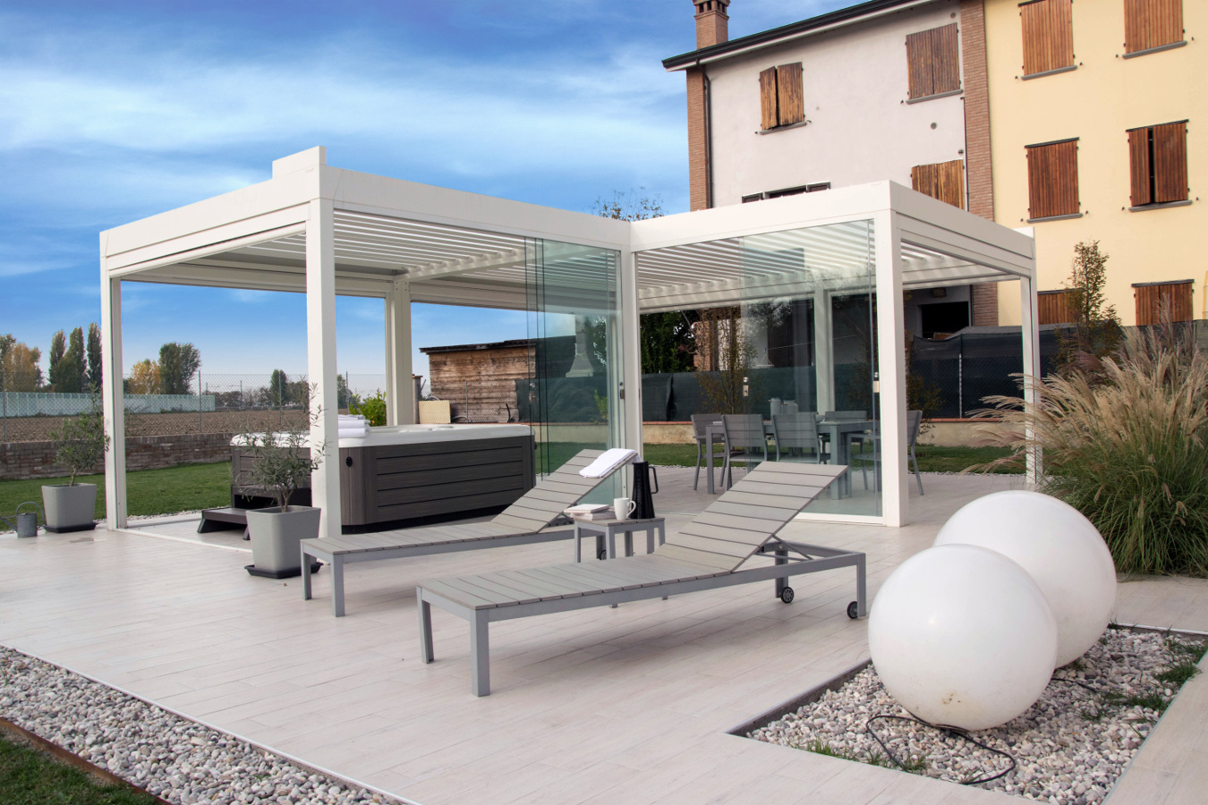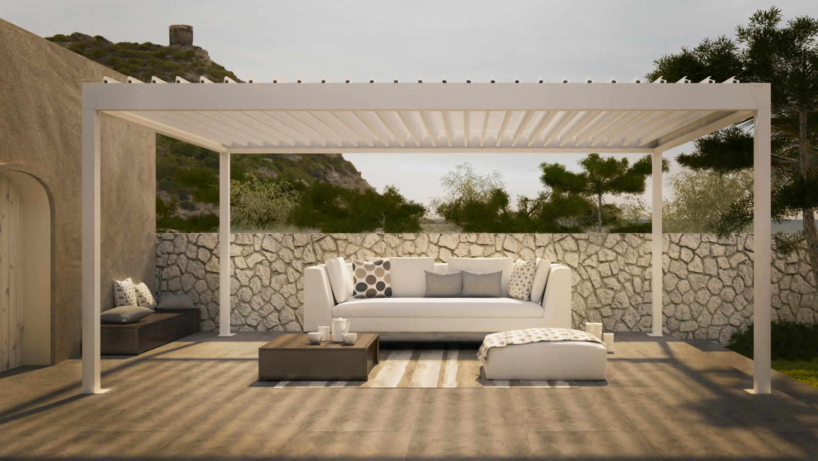 Dank ihres einfachen und innovativen Designs passt sich die bioklimatische Pergola sowohl an die traditionellen als auch an die modernsten oder zeitgenössischen Baustile an. Die Pergola bietet verschiedene Einsatzmöglichkeiten: freistehend mit vier Säulen, an der Fassade befestigt, integrierte Montage in bauseitigen Konstruktionen, ohne Pfosten (Alba Liberty). Alba kann bis zum 600 x 605 cm ohne Zwischenpfosten gekoppelt werden. Der an der Längsseite montierte Motor der Alba ist mit einer Schutzabdeckung versehen, welche die Gesamthöhe der Struktur um 13 cm überschreitet. Falls vollständig geöffnet, haben die Lamellen einen Überstand von 9,5 cm über die Gesamthöhe der Struktur. Um auch abends den Außenbereich genießen zu können, kann man die in den Lamellen integrierte LED Beleuchtung wählen. Diese Beleuchtung ist dimmbar.