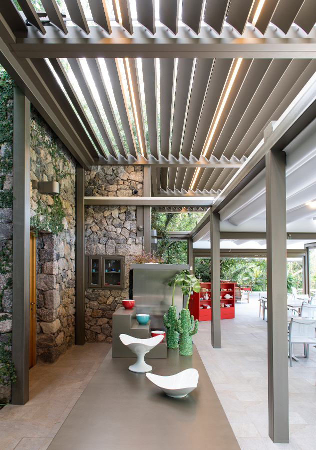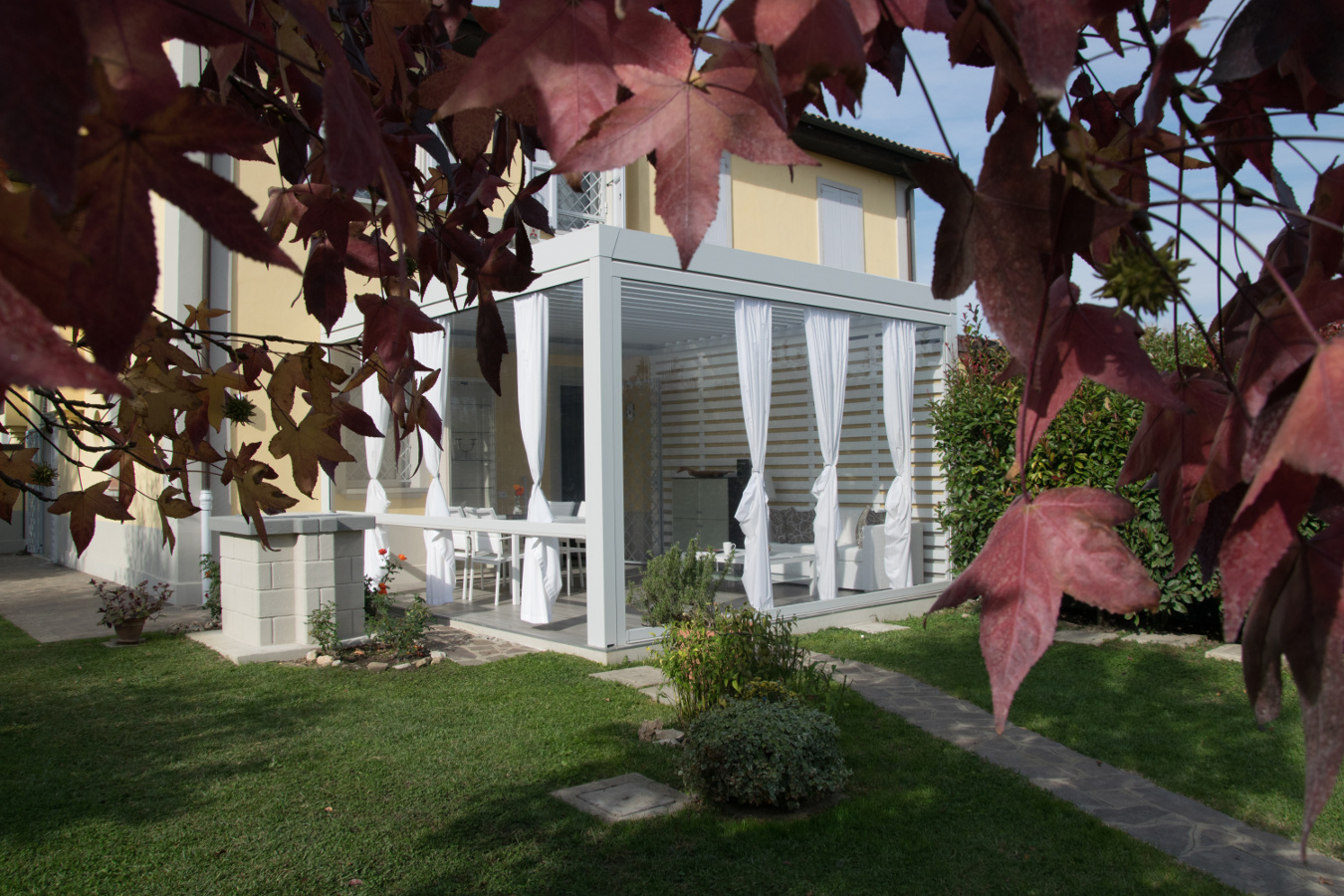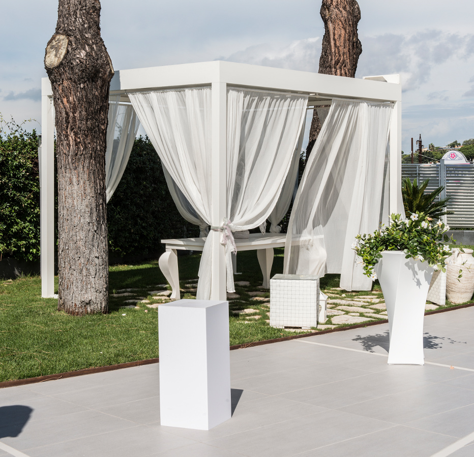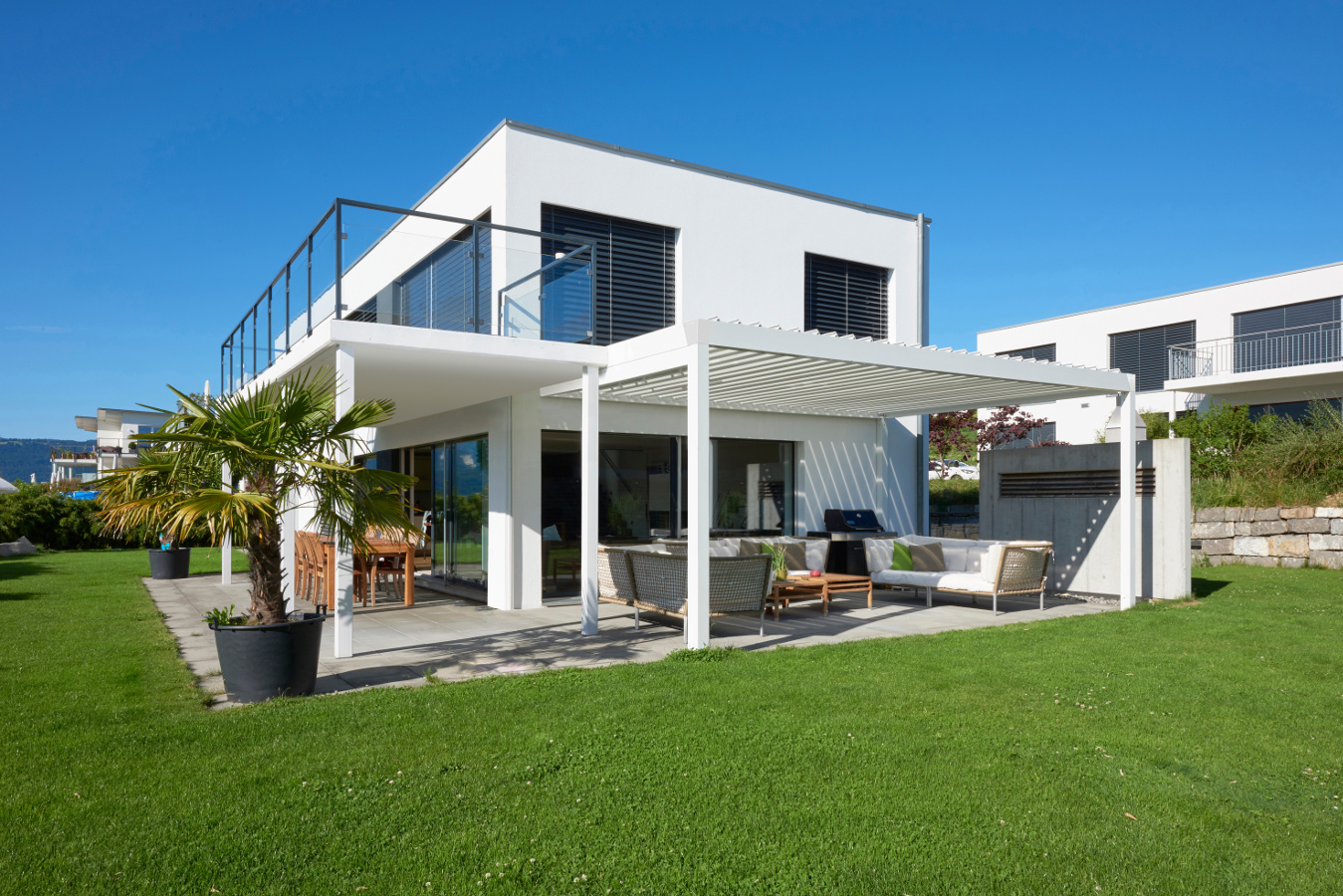 Dank ihres einfachen und innovativen Designs passt sich die bioklimatische Pergola sowohl an die traditionellen als auch an die modernsten oder zeitgenössischen Baustile an. Die Pergola bietet verschiedene Einsatzmöglichkeiten: freistehend mit vier Säulen, an der Fassade befestigt, integrierte Montage in bauseitigen Konstruktionen, ohne Pfosten (Alba Liberty). Alba kann bis zum 600 x 605 cm ohne Zwischenpfosten gekoppelt werden. Der an der Längsseite montierte Motor der Alba ist mit einer Schutzabdeckung versehen, welche die Gesamthöhe der Struktur um 13 cm überschreitet. Falls vollständig geöffnet, haben die Lamellen einen Überstand von 9,5 cm über die Gesamthöhe der Struktur. Um auch abends den Außenbereich genießen zu können, kann man die in den Lamellen integrierte LED Beleuchtung wählen. Diese Beleuchtung ist dimmbar.