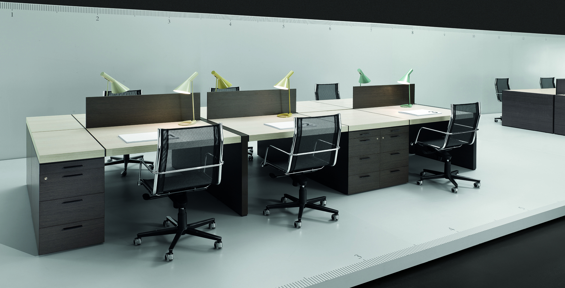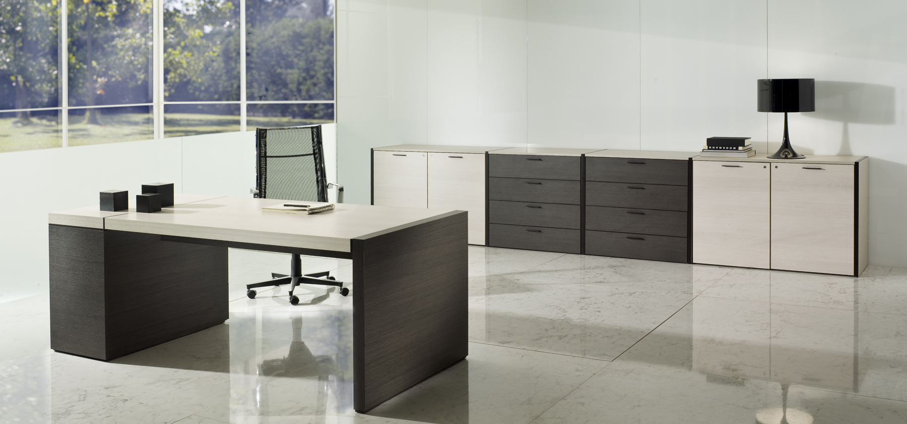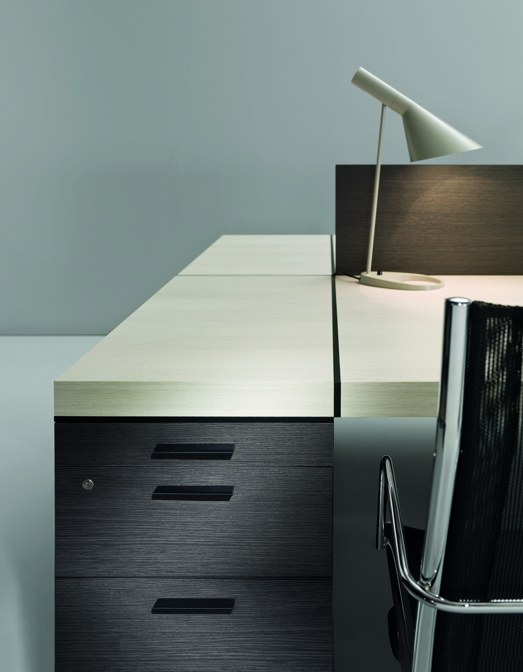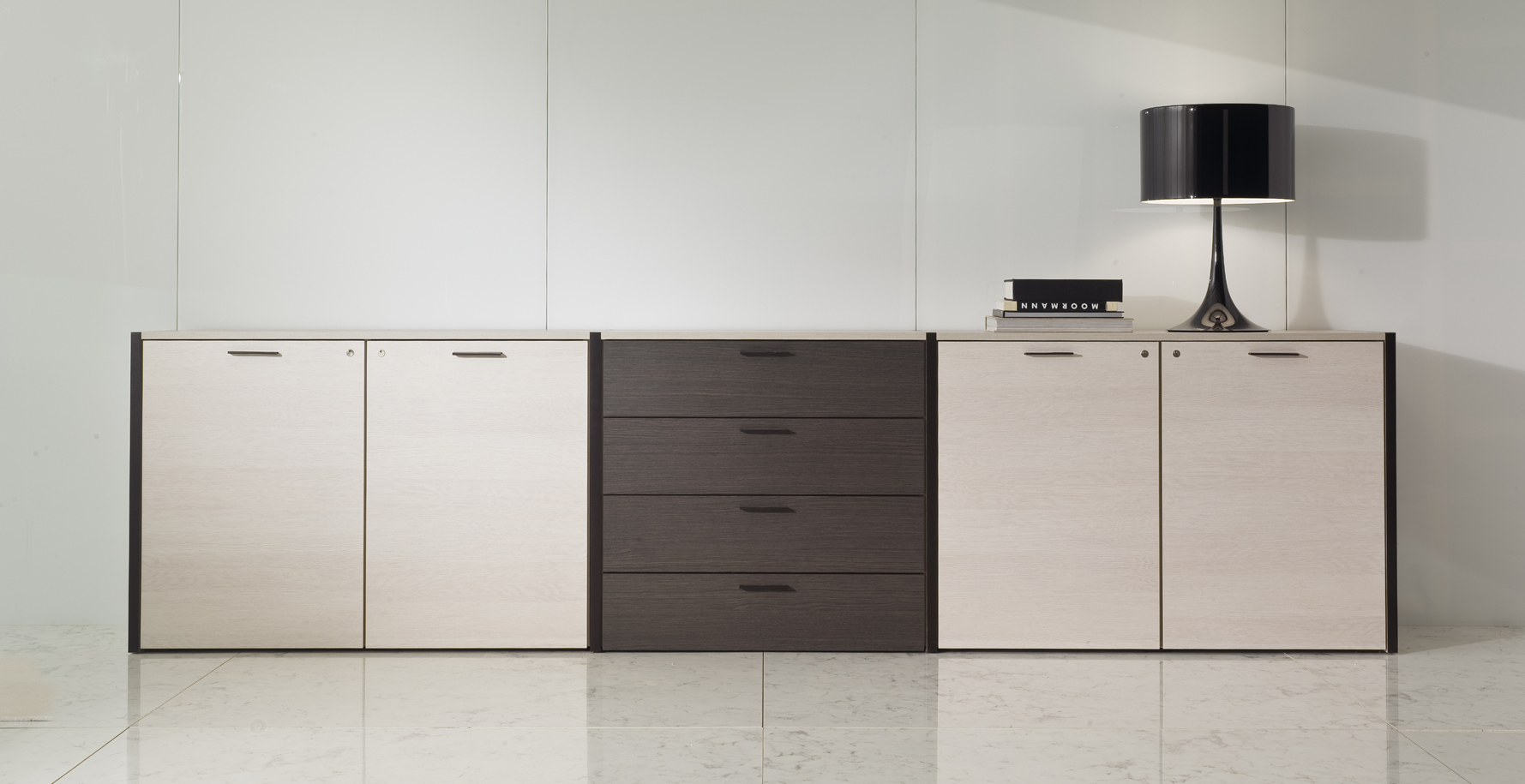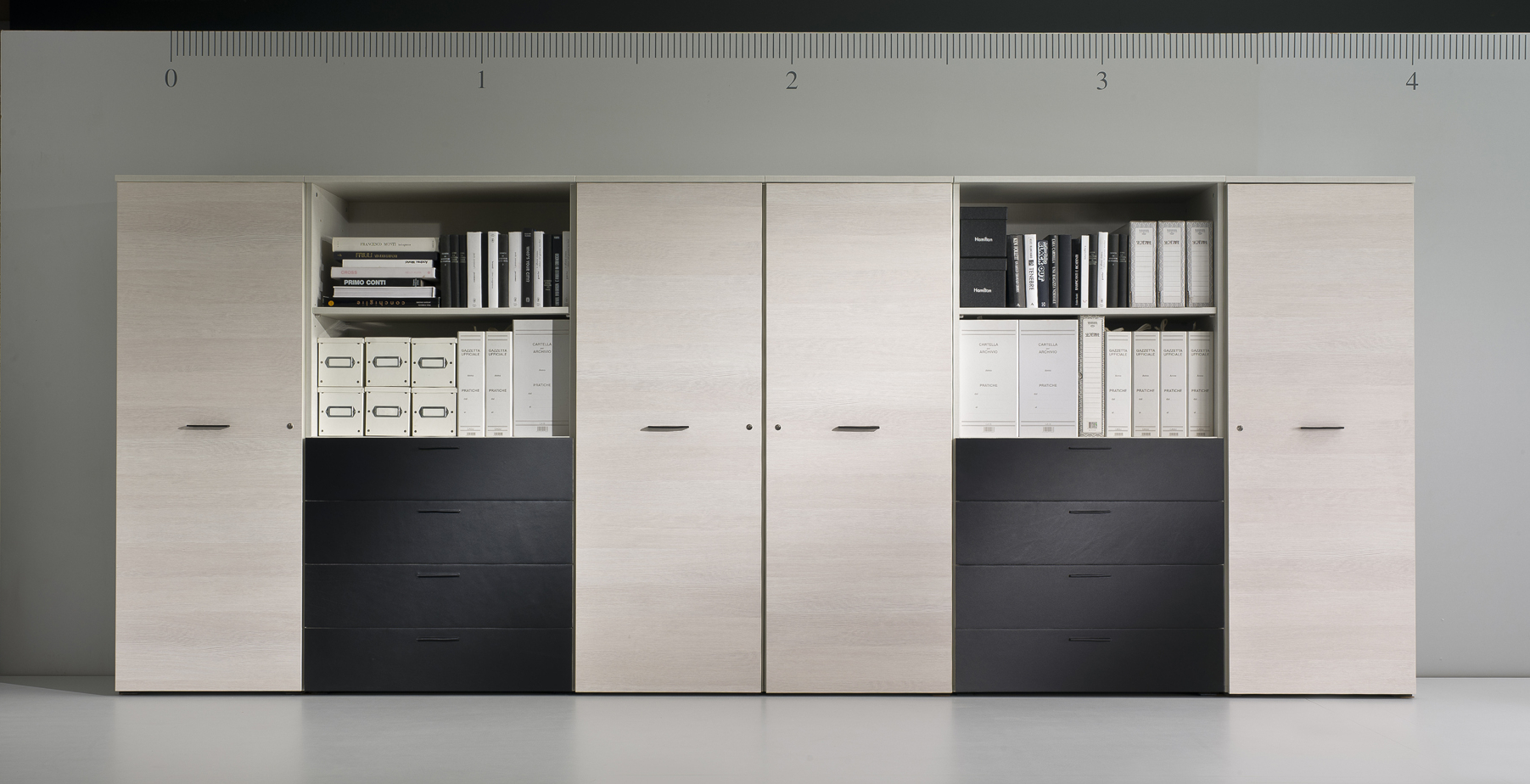 Die Schränke sind in zwei Höhen (790 mm oder 1540 mm) und mit verwendbarer Einheit von zwei verschiedenen Breiten (540 mm und 800 mm) erhältlich. Die Rahmen der niedrigen und hohen Schränke sind immer in Melamin mit Leinen Finishing Dicke 19 mm gemacht; Die obere Oberseite ist auch in Sattelleder, Holz oder in Melamin-weiße Eiche oder graue Eiche, um besser auf das Büro zu passen. Die Fronten der niedrigen und hohen Schränke – Schubladen und Türen in verschiedenen Dimensionen – sind in Sattelleder, in Holz oder in melaminfarbener Eiche, grau Eiche oder Säuregrün erhältlich. Die Griffe sind immer in Sattelleder. Die Innenböden sind immer in Melamin mit Leinenveredelung, während die Schubladen in Buche Sperrholzplatte schwarz matt lackiert mit Stahl Gleitläufer mit gedämpft enden.
