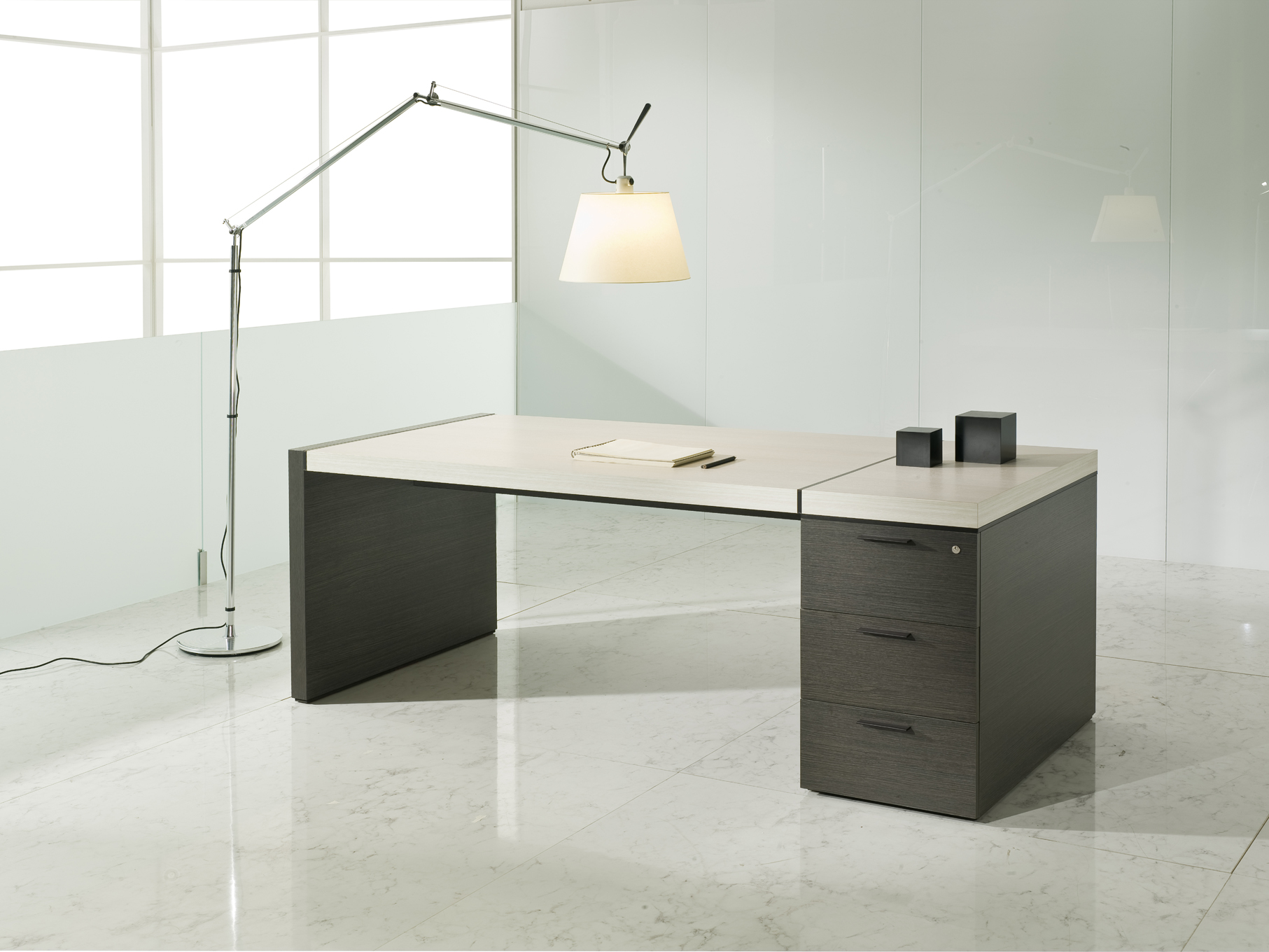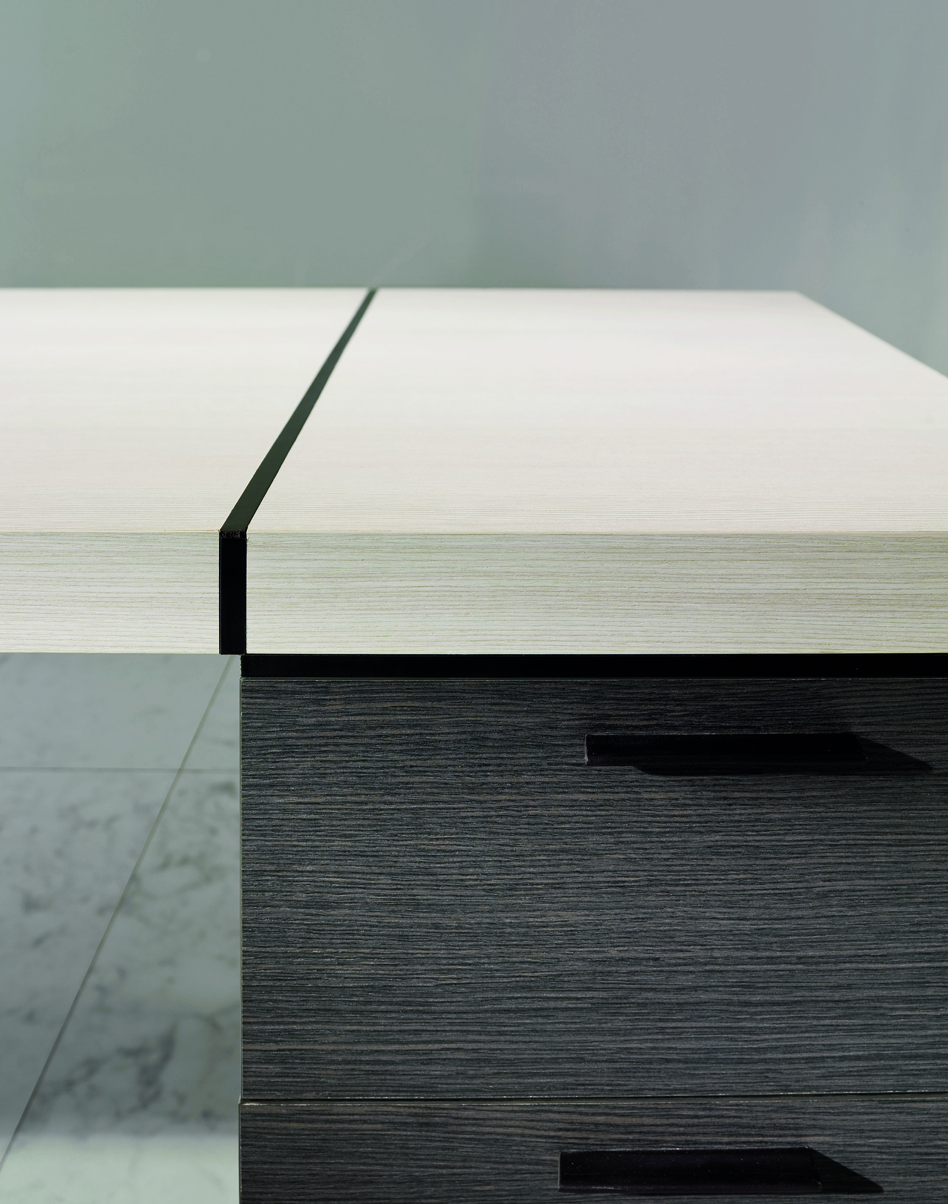 Die Tops und Beine von Schreibtischen und Konferenztisch sind aus Wabenfaserplatten mit Kanten und Querträgern in Buche, Wabenmaterial Dicke 42 mm und zwei Platten jeweils 8 mm auf den 2 Gesichtern in der Veredelung: Sattel Leder, Holz, Melamin weiße Eiche Oder graue Eiche. Für die Holzveredelung sind die Kanten in Holz passend, für die Veredelung im Sattelleder sind die Kanten in ABS gefertigt und mit Sattelleder verkleidet, während im anderen Finish die Kanten in ABS passend sind. Auf den Oberseiten, mit Ausnahme der Sattelleder, gibt es immer einige Riemen in Sattelleder mit einer Tiefe von 10 oder 20 mm.