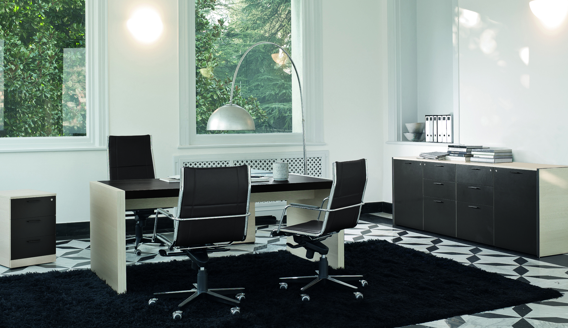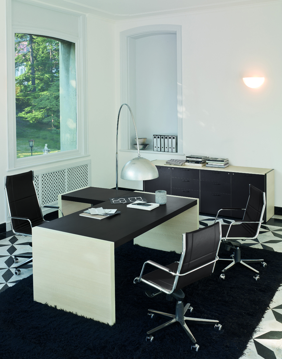 Das feste Sideboard hat einen Rahmen in Holz oder Melamin-Weiß-Eiche oder Grau-Eiche, mit einer internen Einheit für Schubladen oder Tür und zwei offenen Einheiten verwendbar entweder von der internen Seite als von der externen des Schreibtischs. In der Sattellederversion wird die Polsterung des Rahmens des Sideboards nur auf den Außenflächen hergestellt. Es gibt auch eine ergänzende Oberseite für das Sideboard, um die gleiche Höhe für das Sideboard und den Schreibtisch zu haben; Es ist in allen Finishing verfügbar. Die interne Einheit kann mit einer Tür oder Schubladen in allen Finishing zur Verfügung gestellt werden.