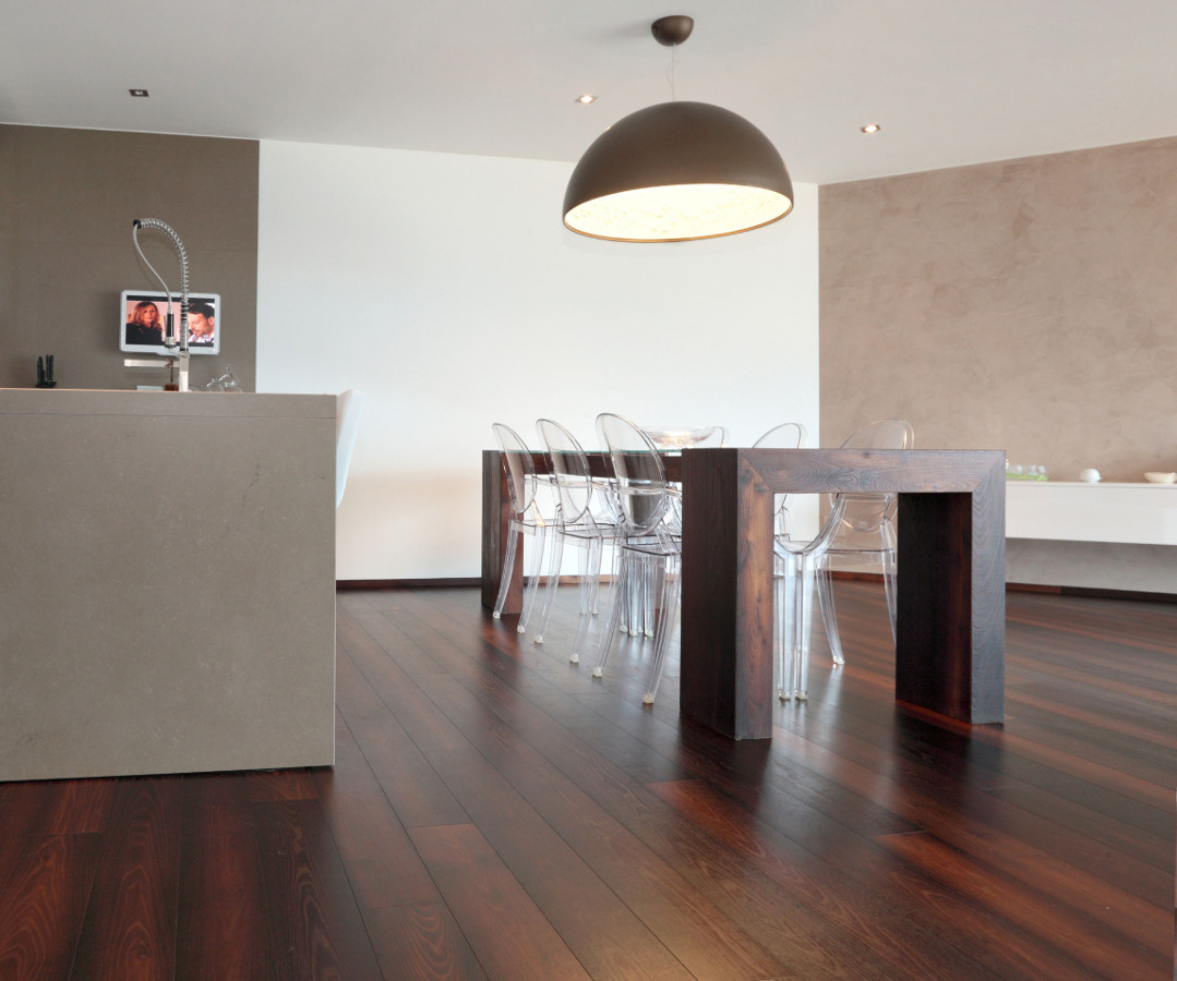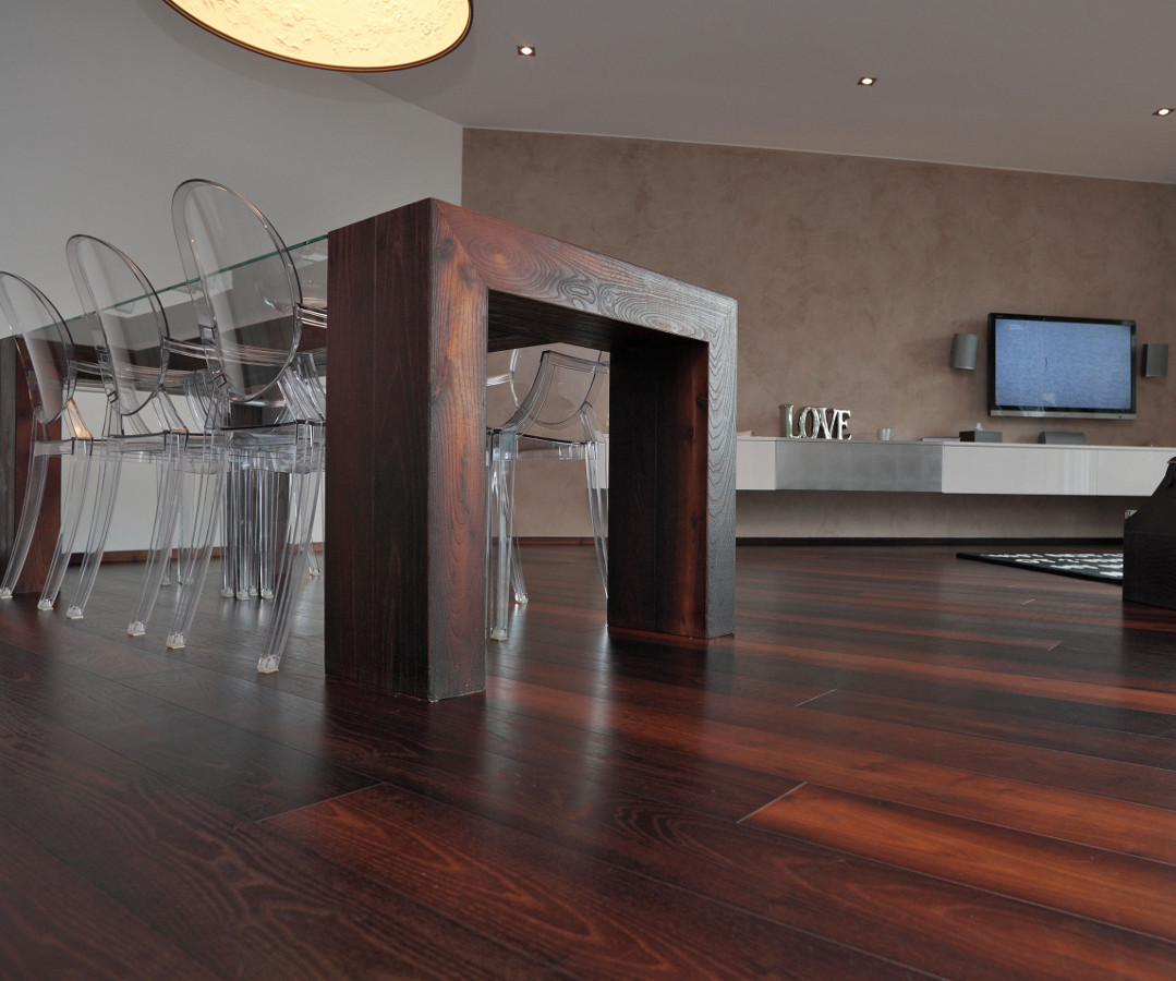 Die Kombination der Behandlung mit Bio Plus und Thermowood macht die Luci di Fiemme Böden einzigartig in Schönheit und Haltbarkeit. Sie sind besonders für feuchte oder stark strapazierte Räume geeignet, wie Küchen, Bäder, Showrooms oder Büros sowie auch bei Fußbodenheizung.