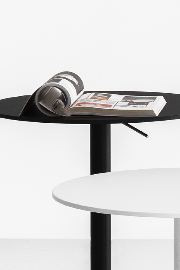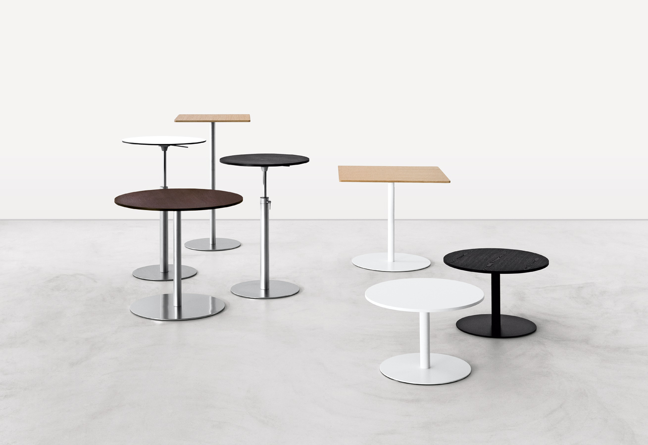 Tisch verfügbar in drei verschiedenen Höhen oder mit höhenverstellbarer Säule und quadratischer oder runder Tischplatte in verschiedenen Größen und Ausführungen.