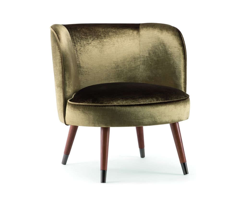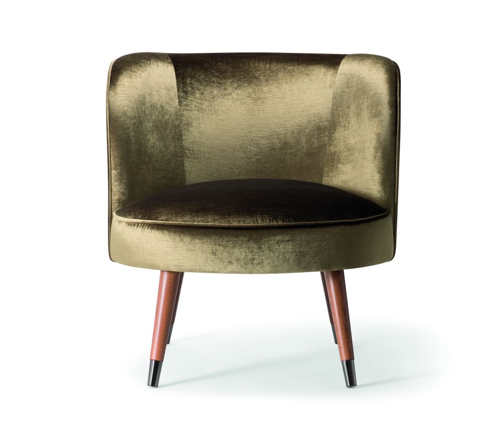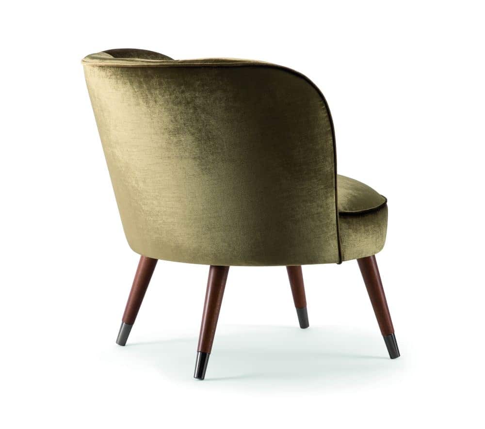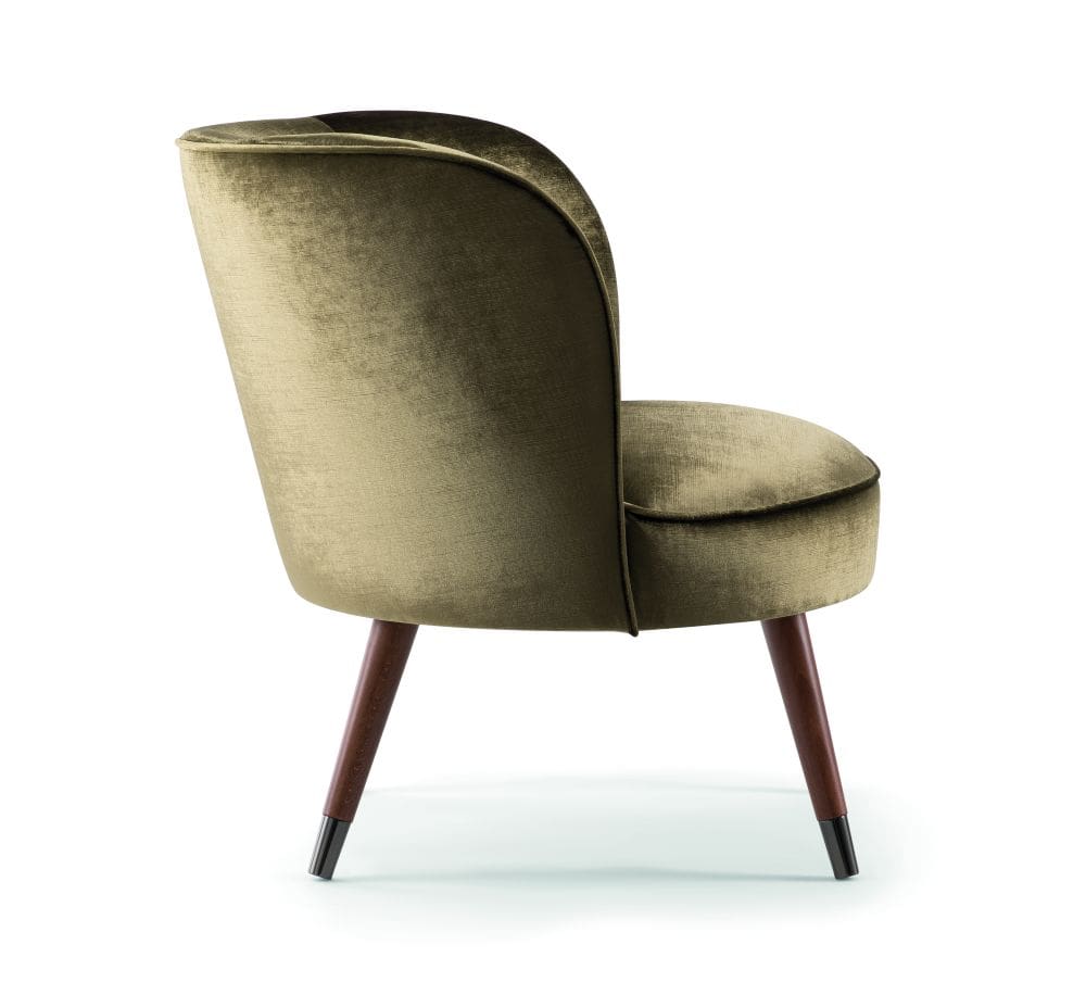 Renommierte italienische Qualität kommt in einem internationalen, modernen Design zum Ausdruck, das aus kurvigen Linien und weichen Situationen besteht. Das einfache runde Design schafft einen plüschigen und luxuriösen Sitz, der reichlich Komfort und Unterstützung für diejenigen bietet, die eine Weile faulenzen möchten. Die massiven Holzbeine, die von den Metallschalen verziert werden, machen das Sofa noch stilvoller. Das Candy-Design ist ideal für Hotelzimmer, Empfangsbereiche und Lounges und kann mit einer Auswahl an Holzbeizen für die konischen Beine und Polsterungen für die Sitzfläche an Ihre Designwünsche angepasst werden.