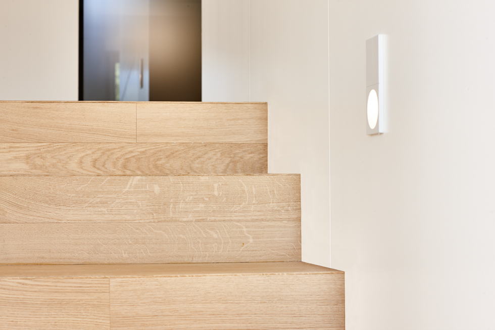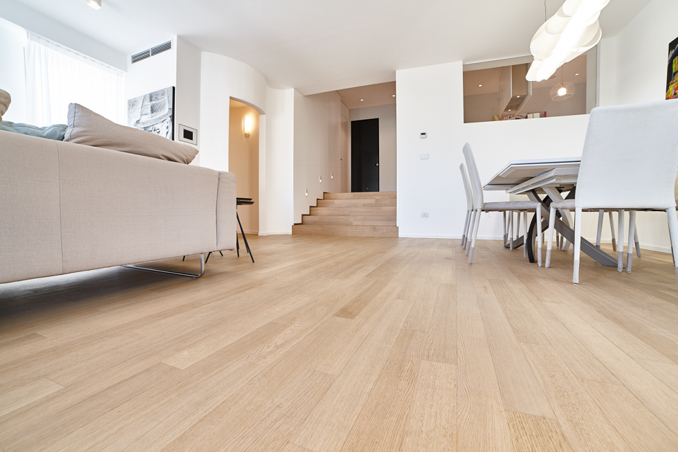 2-lagiger Holzboden mit 4 mm Edelholz und Träger aus Birkensperrholz. Gebürstet, abgeschrägt, auf Wasserbasis / natürlich geölt.