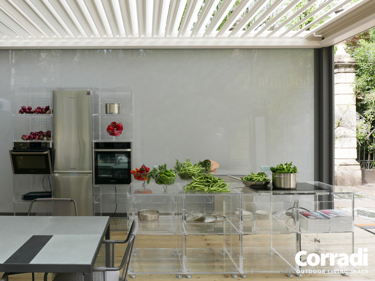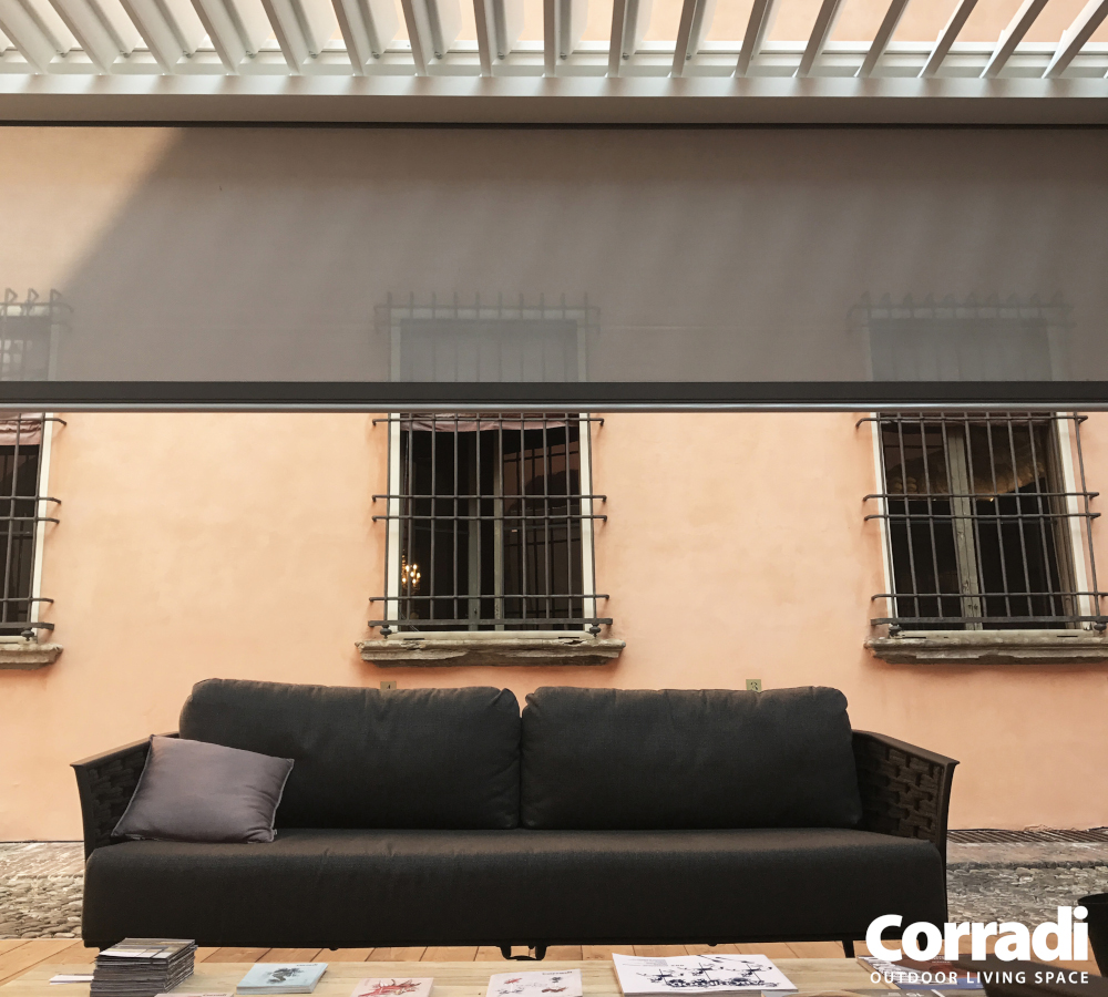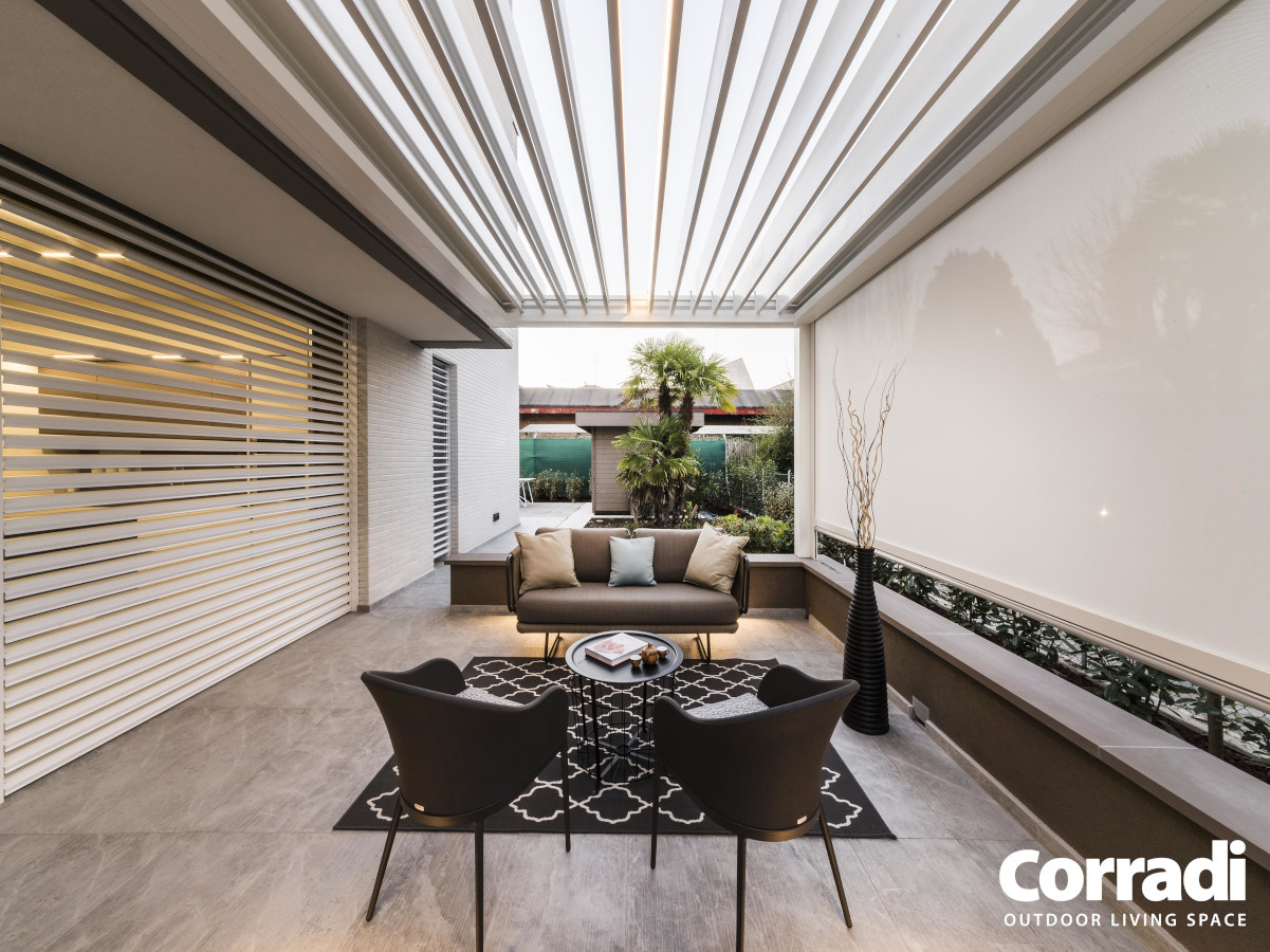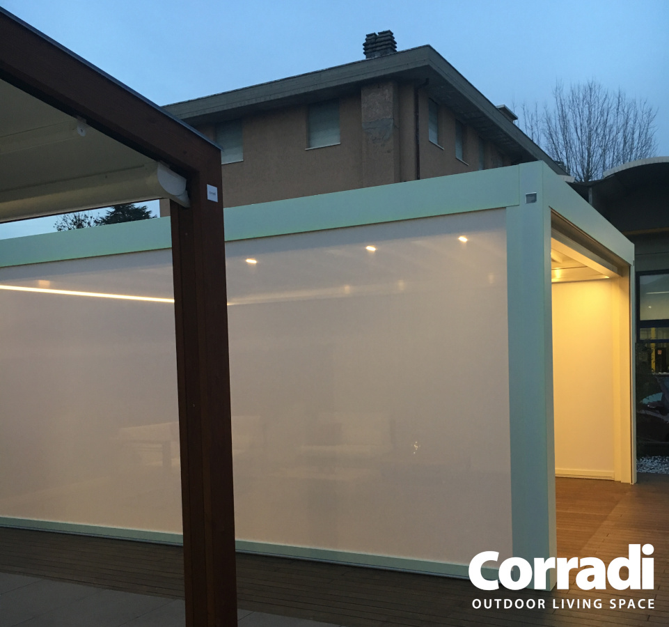 Über die Farbe trifft die Funktionalität auf Ästhetik und Outdoor-Bereiche färben sich in einzigartige Stimmungen, die nur ein bis ins letzte Detail entwickeltes Ambiente zu vermitteln vermag. In Abhängigkeit vom gewählten Material besteht die Möglichkeit, auf eine der Farben der Corradi-Farbpaletten zurückzugreifen wie elegantes Champagne oder die raffinierte Kombination von Silber und Puderoder – warum nicht – sogar ein köstliches Himbeer, das auch in kalten Monaten ein warmes Frühlingsgefühl versprüht. Die Luftdurchlässigkeit von Diffusa ist sehr hoch, sogar höher als die von Ermetika® Cristal XL. Und wer großflächige Anlagen schützen möchte, findet in der Version Extra Large von Diffuso eine besonders interessante Performance.