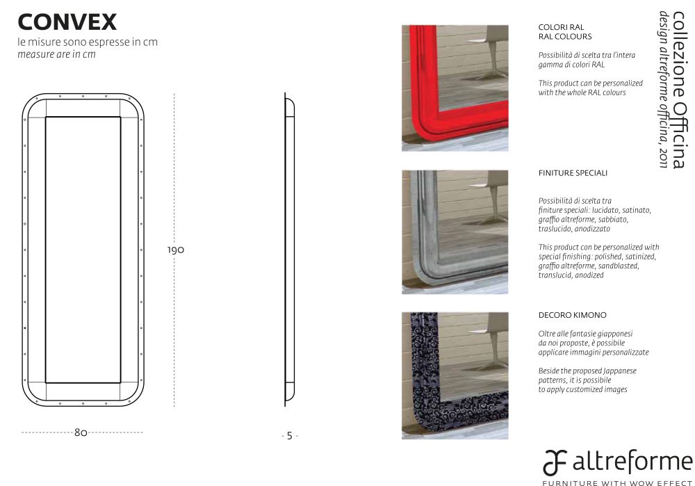 Design: altreforme officina Ein weicher, geschwungener Bilderrahmen stammt aus den neuesten Technologien und einem konsolidierten Know-How, um moderne Räume mit Eleganz auszustatten. Convex ist ein vertikaler Spiegel, der mit verschiedenen Farben und Mustern angepasst werden kann. Convex stellt eine Brücke zwischen zwei nur scheinbar weite Welten dar: Reine Technologie und Stil.