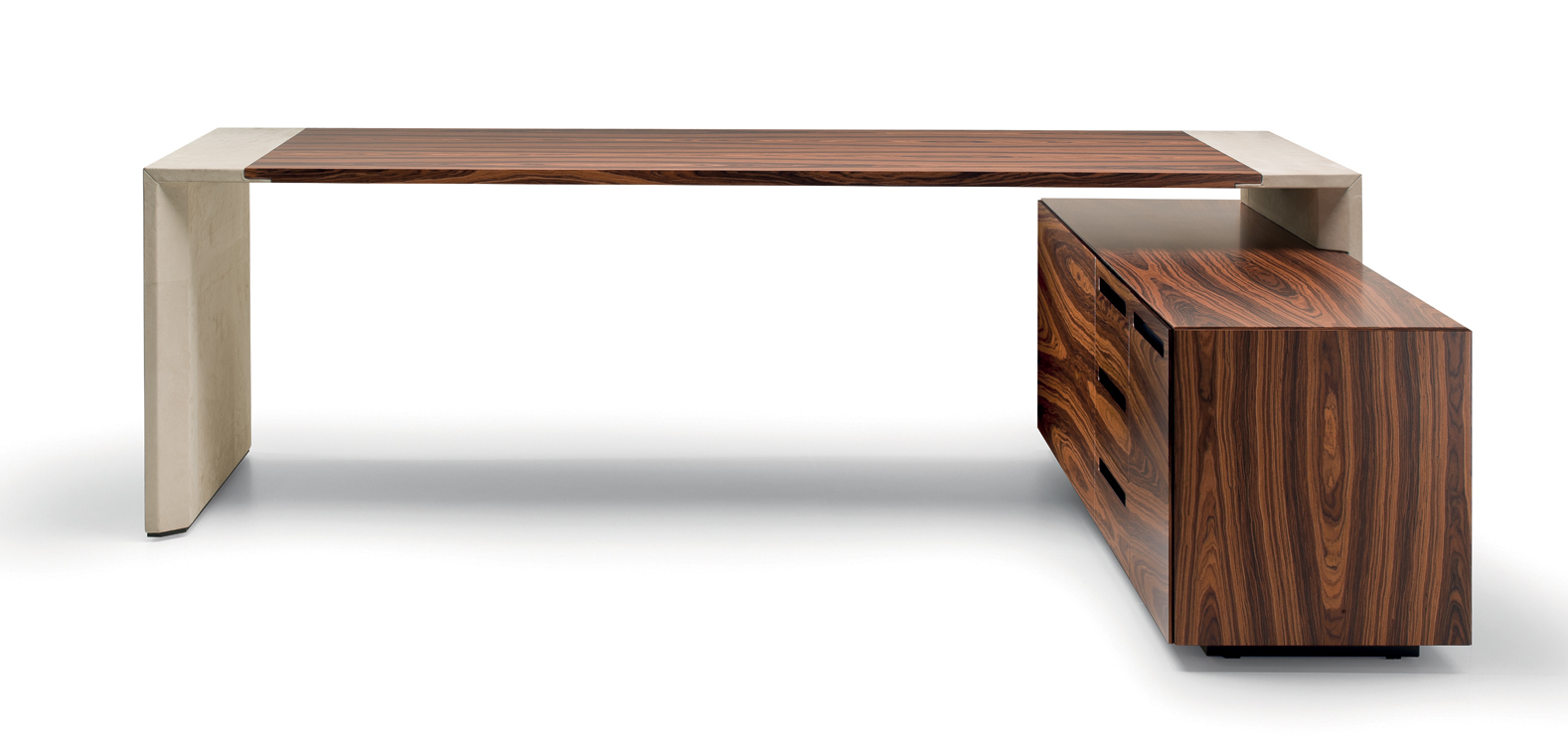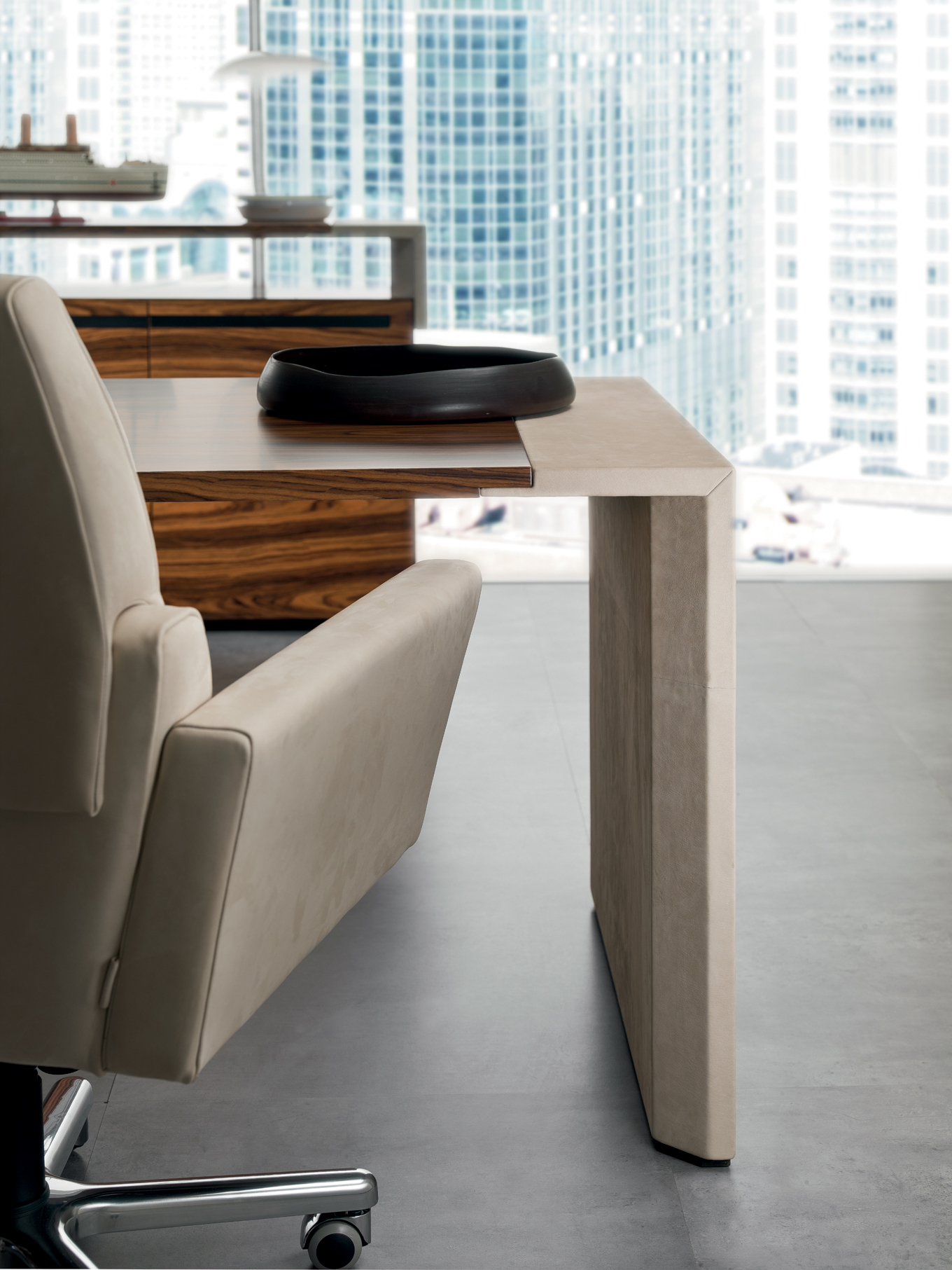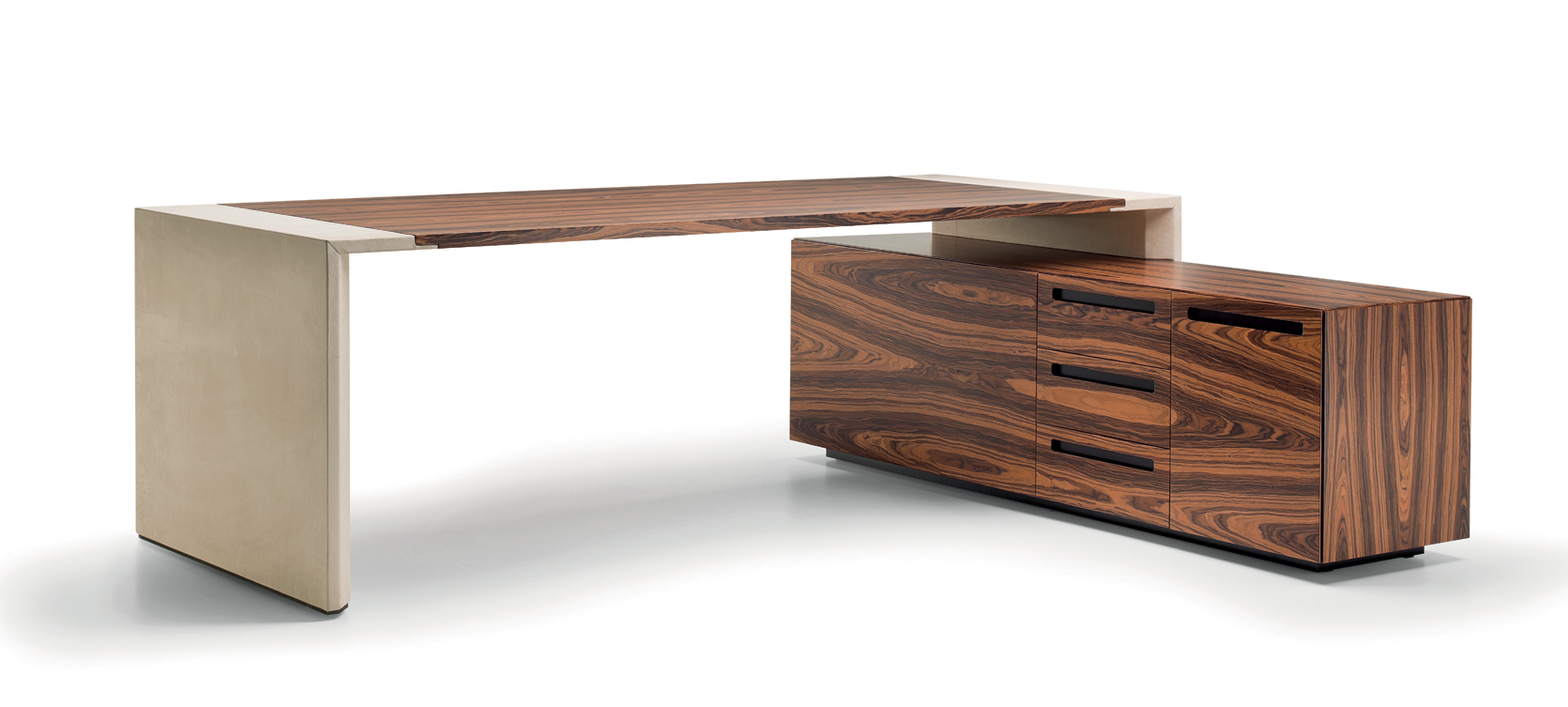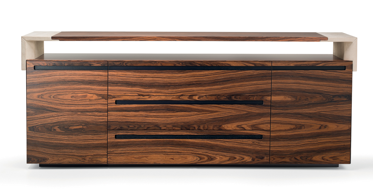 Das CROSSING-Modell ist in einer begrenzten Anzahl von Kombinationen erhältlich, die zwei Arten von Materialien verwenden: – Sattelleder oder Leder. Das Sattelleder und Leder werden immer auf schwarz melaminbeschichtete Platten, von unterschiedlicher Dicke, entsprechend dem Gebrauch angewendet. – Ähnliche Palisander furniert auf Spanplatten, von variabler Dicke, in Übereinstimmung mit der Verwendung. Dies ist das einzige Holz für das Modell. Die Oberseiten der Schreibtische der Konferenztische und der niedrigen Couchtische werden mit einer 30-mm-Dicke mit Sattelleder oder Leder bezogen oder furniert. Unter den Oberseiten gibt es Bewehrungsstahlstäbe. Die Beine und die seitliche Stütze zum Sockel sind mit 3 verschiedenen Spanplatten mit einer Gesamtdicke von 8 cm verbunden. Und die senkrechten Kanten auf der Innenseite abgerundet haben. Auf dem Oberteil wird ein Aluminiumblech am Bein oder am Träger befestigt, um eine stärkere Stabilität der Oberseite zu verleihen. Sowohl das Bein als auch die Seitenstütze sind komplett mit Sattelleder oder Leder bezogen. Die Bescheidenheit wird mit einer Spanplatte aus 20 mm Dicke furniert oder mit Sattelleder oder Leder bezogen. Das Bein, in seiner Funktion der Unterstützung der Oberseite, kann durch einen Sockelschrank ersetzt werden oder mit einem Rücksitzschrank, das auf einer Stütze lehnt. Der feste Sockel sowie der Sockel auf Rollen und der feste Rücksitz-Sideboard-Schrank sind nur furniert erhältlich und werden mit einem speziellen Finishing-Detail der Tafeln hergestellt, die bei 45 ° geschnitten sind. Die Schubladen und die Türen immer mit einem Schnitt bei 45 ° sind auch nur furniert erhältlich. Es ist auch eine Rückkehr, die von einem Topfurnier befestigt ist, der an der Oberseite des Schreibtisches befestigt ist, mit einem Metallblech unterhalb und auf der anderen Seite, die an einem Bein ähnlich dem des Schreibtischs befestigt ist. Der Unterschrank ist nur in einer Dimension mit 4 Einheiten, mit 4 Türen oder mit zwei Seitentüren und 3 großen Zentralschubladen erhältlich; Alle von ihnen sind nur furniert. Der Schrank sowie Türen und Schubladen haben eine spezielle Finishing-Details des Schnittes bei 45 °. Die Griffe werden durch eine Nut in die Tür oder die Schublade dargestellt, die durch ein Fräsen in eine Einlage aus massivem Holz, die in die Spanplatte eingelegt ist, vor dem Verbinden hergestellt wird. Der Unterschrank kann auch ein zusätzliches Oberteil mit seitlich mit Sattelleder oder Leder bedeckten Seiten und mit dem zentralen Element furniert oder mit Sattelleder oder Leder bezogen werden.