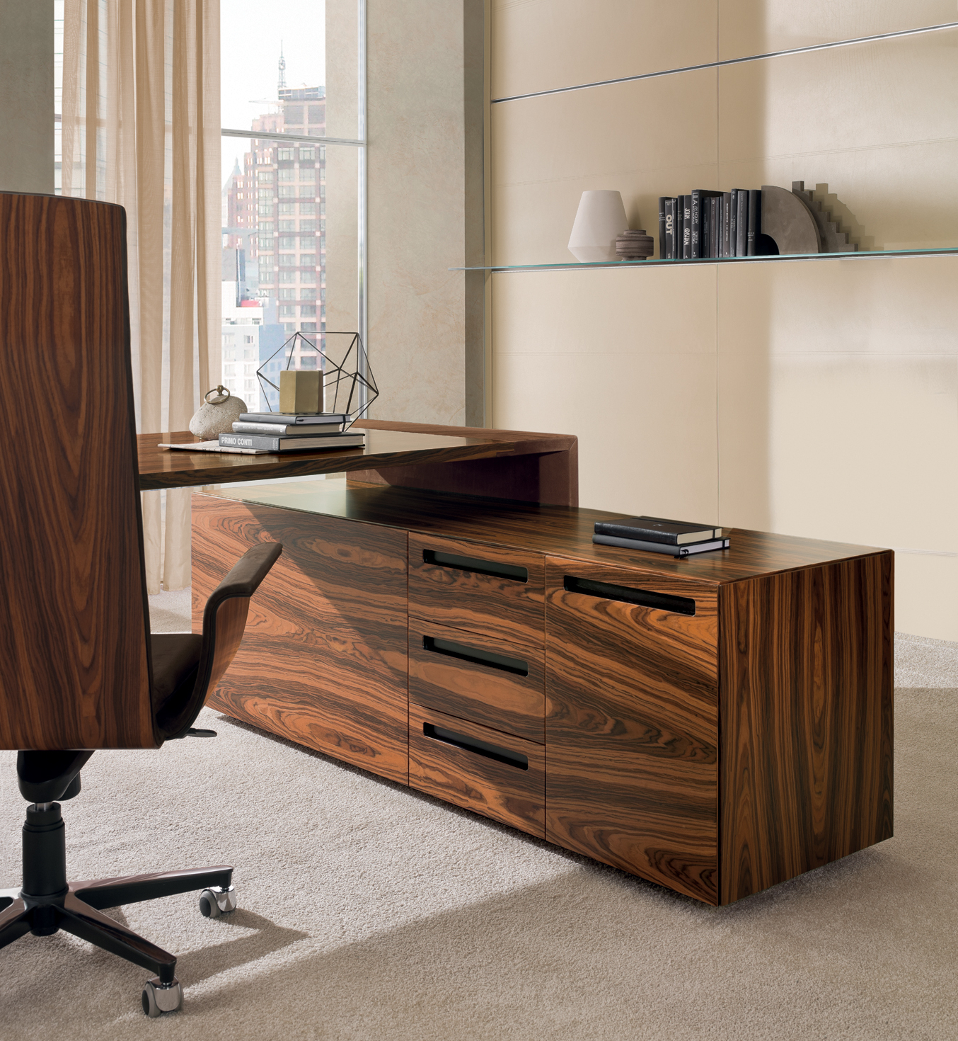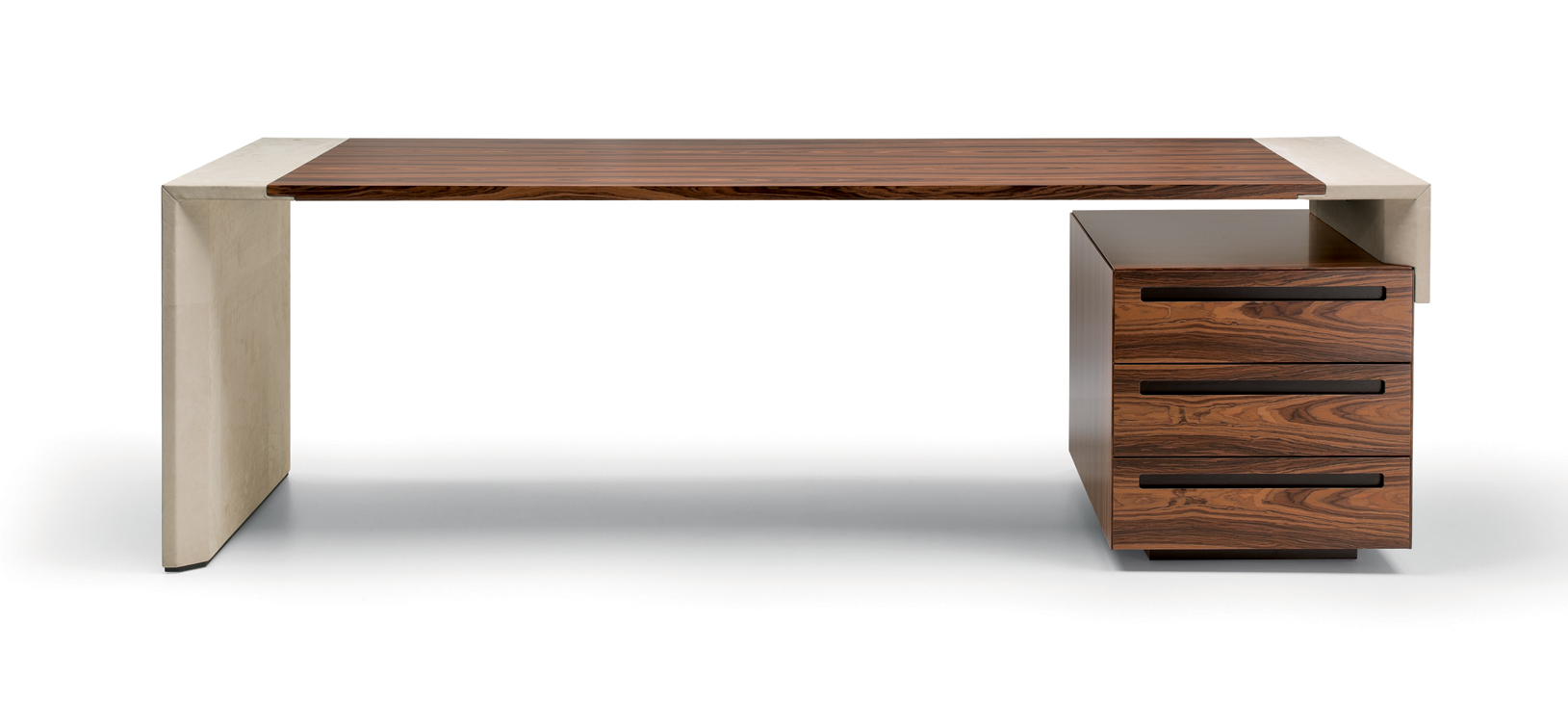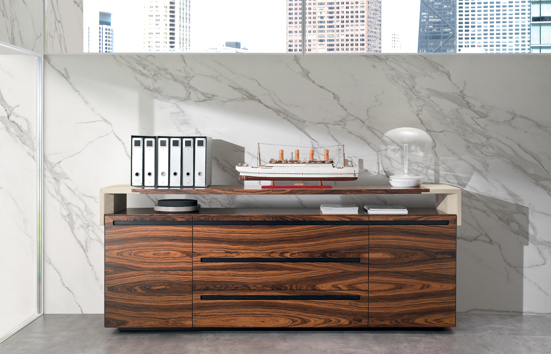 Das CROSSING-Modell ist in einer begrenzten Anzahl von Kombinationen erhältlich, die zwei Arten von Materialien verwenden: – Sattelleder oder Leder. Das Sattelleder und Leder werden immer auf schwarz melaminbeschichtete Platten, von unterschiedlicher Dicke, entsprechend dem Gebrauch angewendet. – Ähnliche Palisander furniert auf Spanplatten, von variabler Dicke, in Übereinstimmung mit der Verwendung. Dies ist das einzige Holz für das Modell. Die Oberseiten der Schreibtische der Konferenztische und der niedrigen Couchtische werden mit einer 30-mm-Dicke mit Sattelleder oder Leder bezogen oder furniert. Unter den Oberseiten gibt es Bewehrungsstahlstäbe. Die Beine und die seitliche Stütze zum Sockel sind mit 3 verschiedenen Spanplatten mit einer Gesamtdicke von 8 cm verbunden. Und die senkrechten Kanten auf der Innenseite abgerundet haben. Auf dem Oberteil wird ein Aluminiumblech am Bein oder am Träger befestigt, um eine stärkere Stabilität der Oberseite zu verleihen. Sowohl das Bein als auch die Seitenstütze sind komplett mit Sattelleder oder Leder bezogen. Die Bescheidenheit wird mit einer Spanplatte aus 20 mm Dicke furniert oder mit Sattelleder oder Leder bezogen. Das Bein, in seiner Funktion der Unterstützung der Oberseite, kann durch einen Sockelschrank ersetzt werden oder mit einem Rücksitzschrank, das auf einer Stütze lehnt. Der feste Sockel sowie der Sockel auf Rollen und der feste Rücksitz-Sideboard-Schrank sind nur furniert erhältlich und werden mit einem speziellen Finishing-Detail der Tafeln hergestellt, die bei 45 ° geschnitten sind. Die Schubladen und die Türen immer mit einem Schnitt bei 45 ° sind auch nur furniert erhältlich. Es ist auch eine Rückkehr, die von einem Topfurnier befestigt ist, der an der Oberseite des Schreibtisches befestigt ist, mit einem Metallblech unterhalb und auf der anderen Seite, die an einem Bein ähnlich dem des Schreibtischs befestigt ist. Der Unterschrank ist nur in einer Dimension mit 4 Einheiten, mit 4 Türen oder mit zwei Seitentüren und 3 großen Zentralschubladen erhältlich; Alle von ihnen sind nur furniert. Der Schrank sowie Türen und Schubladen haben eine spezielle Finishing-Details des Schnittes bei 45 °. Die Griffe werden durch eine Nut in die Tür oder die Schublade dargestellt, die durch ein Fräsen in eine Einlage aus massivem Holz, die in die Spanplatte eingelegt ist, vor dem Verbinden hergestellt wird. Der Unterschrank kann auch ein zusätzliches Oberteil mit seitlich mit Sattelleder oder Leder bedeckten Seiten und mit dem zentralen Element furniert oder mit Sattelleder oder Leder bezogen werden.