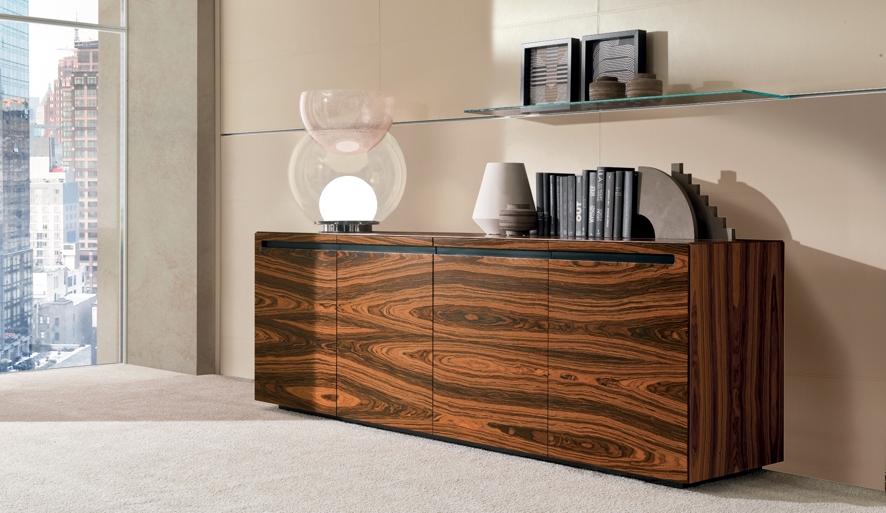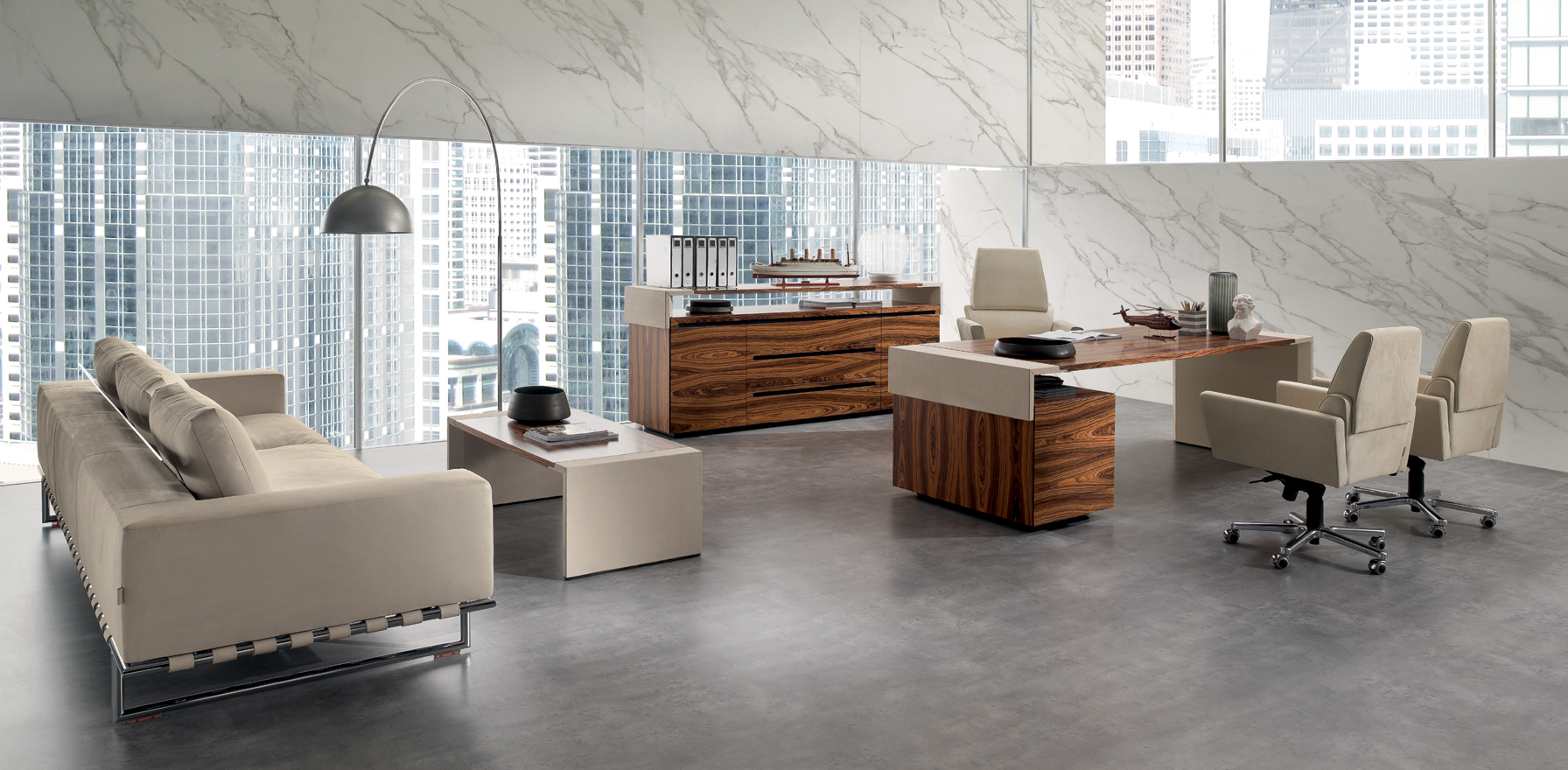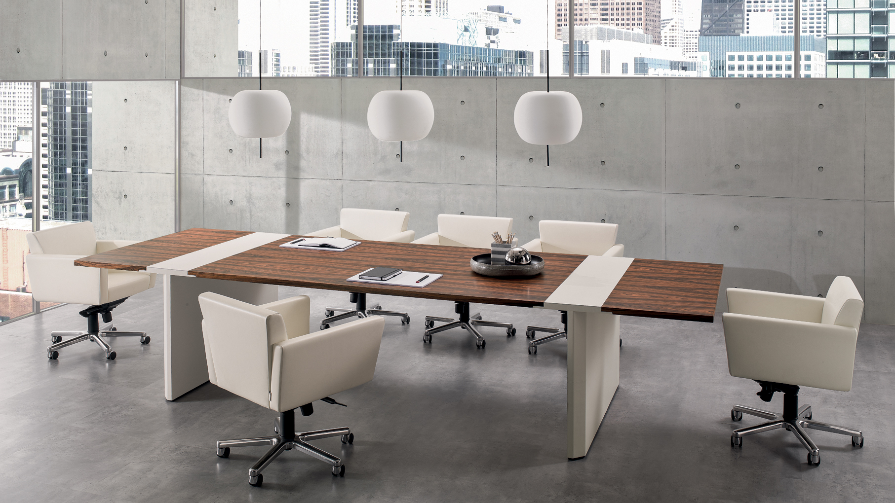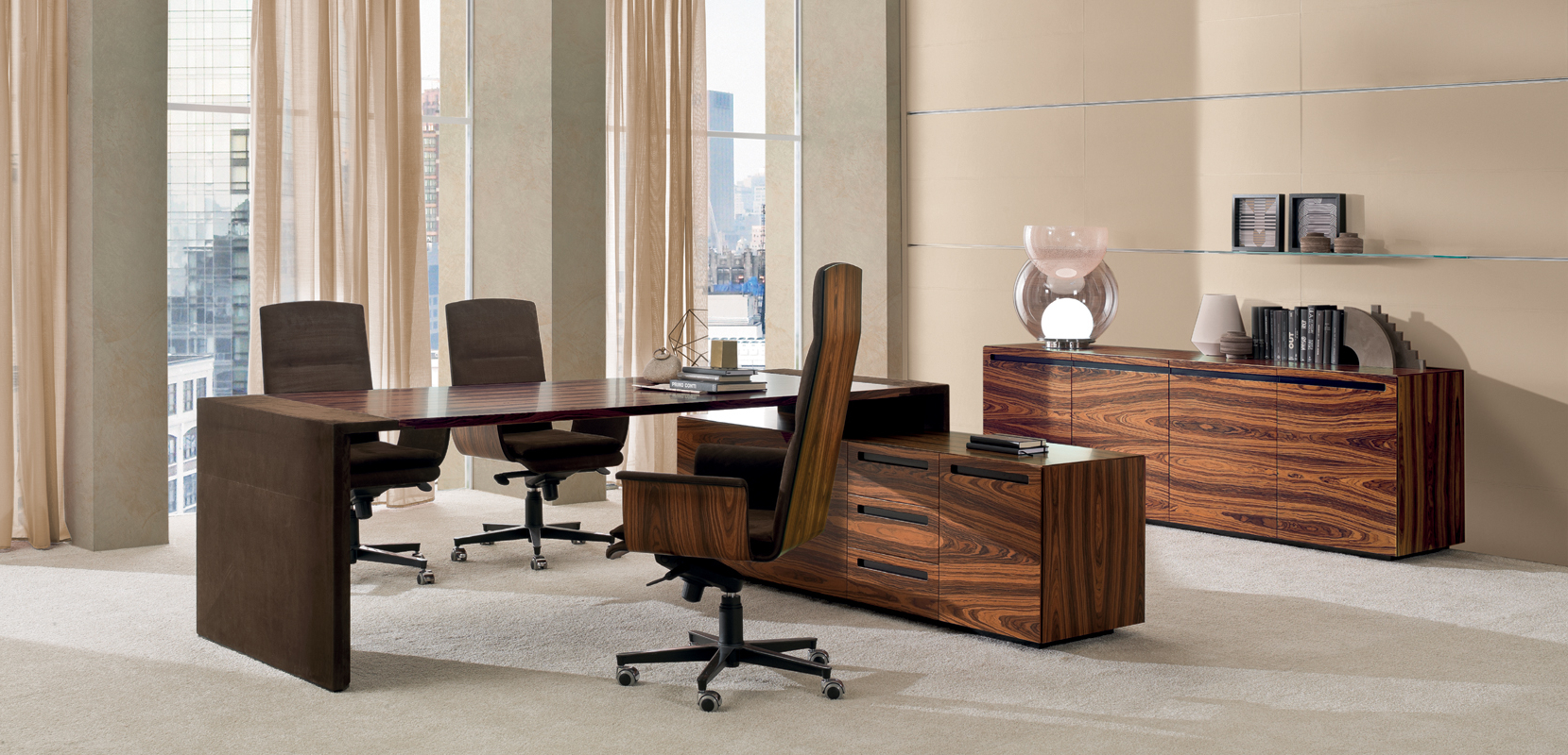 Das CROSSING-Modell ist in einer begrenzten Anzahl von Kombinationen erhältlich, die zwei Arten von Materialien verwenden: – Sattelleder oder Leder. Das Sattelleder und Leder werden immer auf schwarz melaminbeschichtete Platten, von unterschiedlicher Dicke, entsprechend dem Gebrauch angewendet. – Ähnliche Palisander furniert auf Spanplatten, von variabler Dicke, in Übereinstimmung mit der Verwendung. Dies ist das einzige Holz für das Modell. Die Oberseiten der Schreibtische der Konferenztische und der niedrigen Couchtische werden mit einer 30-mm-Dicke mit Sattelleder oder Leder bezogen oder furniert. Unter den Oberseiten gibt es Bewehrungsstahlstäbe. Die Beine und die seitliche Stütze zum Sockel sind mit 3 verschiedenen Spanplatten mit einer Gesamtdicke von 8 cm verbunden. Und die senkrechten Kanten auf der Innenseite abgerundet haben. Auf dem Oberteil wird ein Aluminiumblech am Bein oder am Träger befestigt, um eine stärkere Stabilität der Oberseite zu verleihen. Sowohl das Bein als auch die Seitenstütze sind komplett mit Sattelleder oder Leder bezogen. Die Bescheidenheit wird mit einer Spanplatte aus 20 mm Dicke furniert oder mit Sattelleder oder Leder bezogen. Das Bein, in seiner Funktion der Unterstützung der Oberseite, kann durch einen Sockelschrank ersetzt werden oder mit einem Rücksitzschrank, das auf einer Stütze lehnt. Der feste Sockel sowie der Sockel auf Rollen und der feste Rücksitz-Sideboard-Schrank sind nur furniert erhältlich und werden mit einem speziellen Finishing-Detail der Tafeln hergestellt, die bei 45 ° geschnitten sind. Die Schubladen und die Türen immer mit einem Schnitt bei 45 ° sind auch nur furniert erhältlich. Es ist auch eine Rückkehr, die von einem Topfurnier befestigt ist, der an der Oberseite des Schreibtisches befestigt ist, mit einem Metallblech unterhalb und auf der anderen Seite, die an einem Bein ähnlich dem des Schreibtischs befestigt ist. Der Unterschrank ist nur in einer Dimension mit 4 Einheiten, mit 4 Türen oder mit zwei Seitentüren und 3 großen Zentralschubladen erhältlich; Alle von ihnen sind nur furniert. Der Schrank sowie Türen und Schubladen haben eine spezielle Finishing-Details des Schnittes bei 45 °. Die Griffe werden durch eine Nut in die Tür oder die Schublade dargestellt, die durch ein Fräsen in eine Einlage aus massivem Holz, die in die Spanplatte eingelegt ist, vor dem Verbinden hergestellt wird. Der Unterschrank kann auch ein zusätzliches Oberteil mit seitlich mit Sattelleder oder Leder bedeckten Seiten und mit dem zentralen Element furniert oder mit Sattelleder oder Leder bezogen werden.