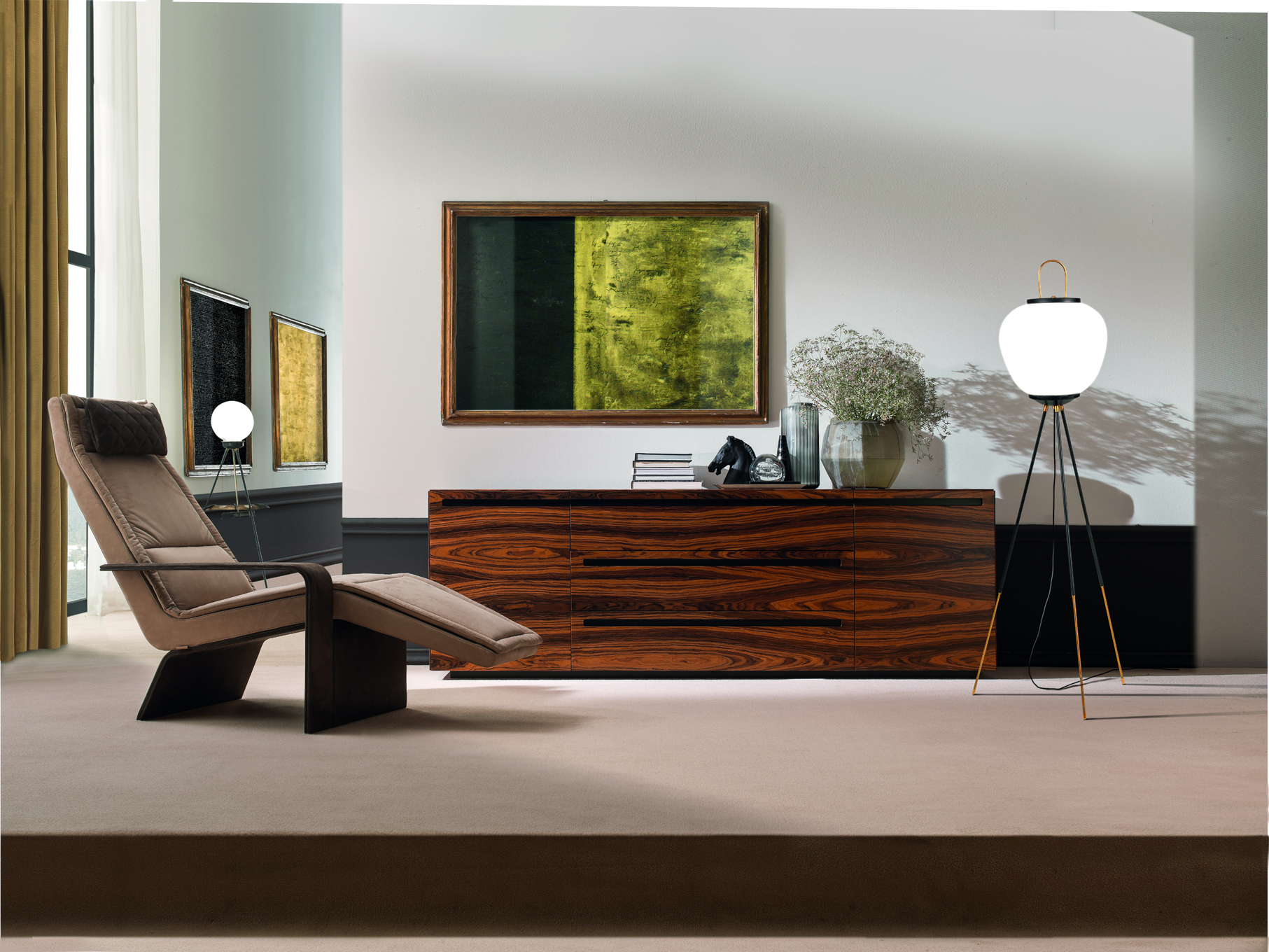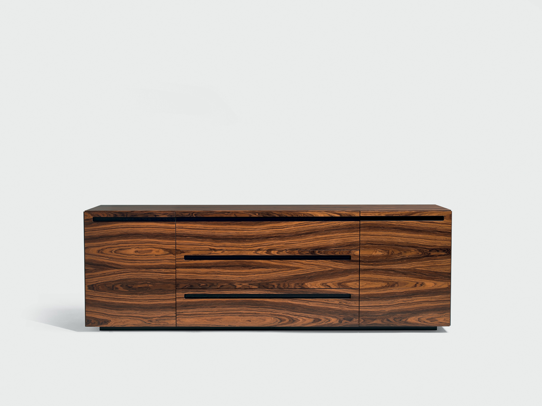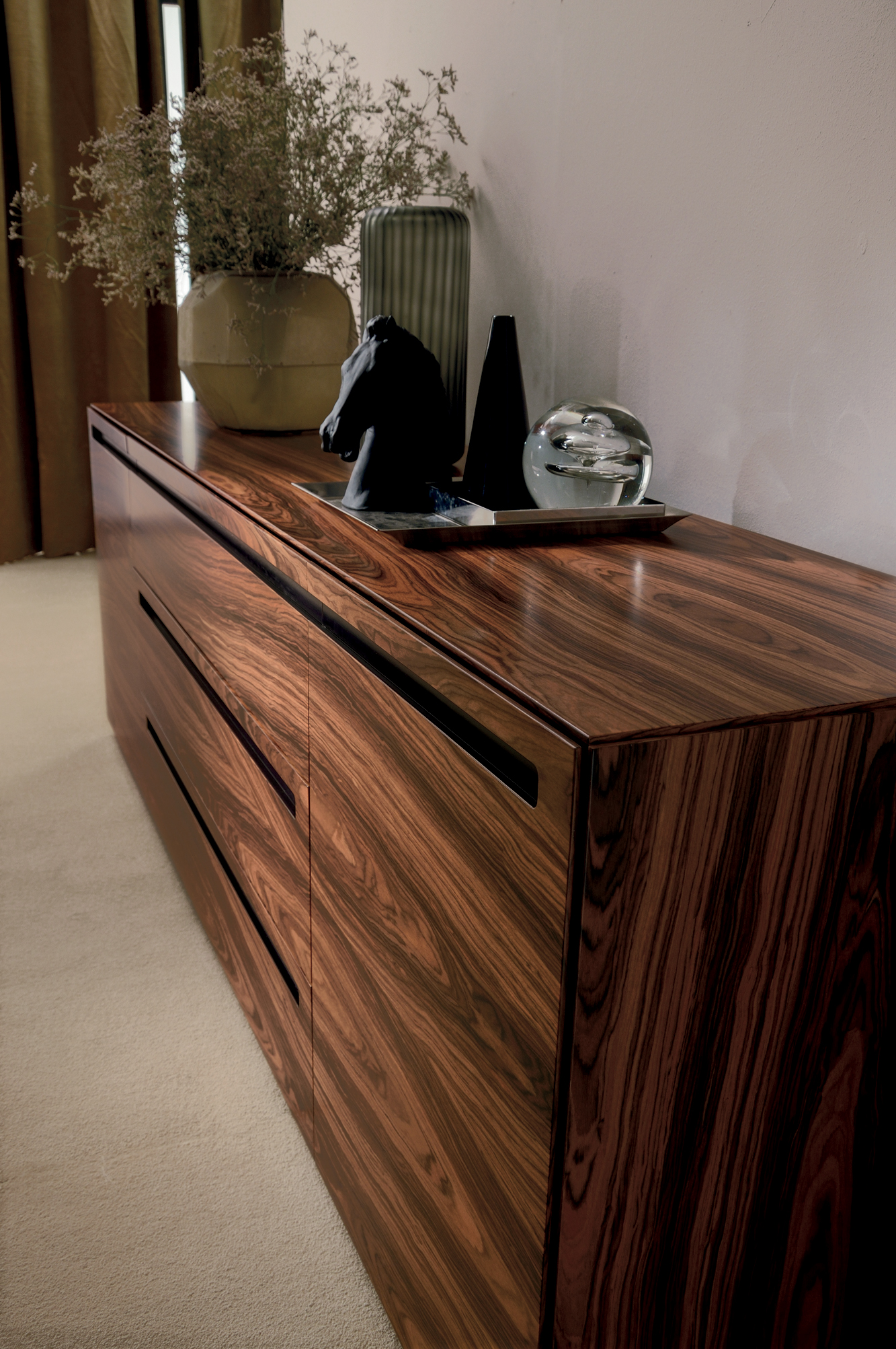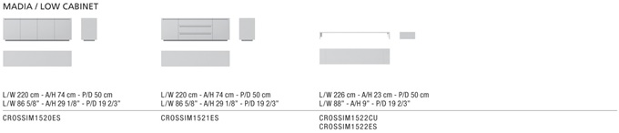 Das Gestell des Möbelstücks Crossing besteht aus Spanplatten, welche komplett mit palisanderähnlichem Holz furniert sind. Der Schrank ist mit vier Türen oder mit zwei seitlichen Türen und drei zentrierten Schubladen erhältlich. Die Oberseite ist auch komplett in weichem oder hartem Leder erhältlich oder mit einem Mittelstück mit palisanderähnlichem Holz furniert und mit den stützenden Seiten in weichem oder hartem Leder bezogen.
