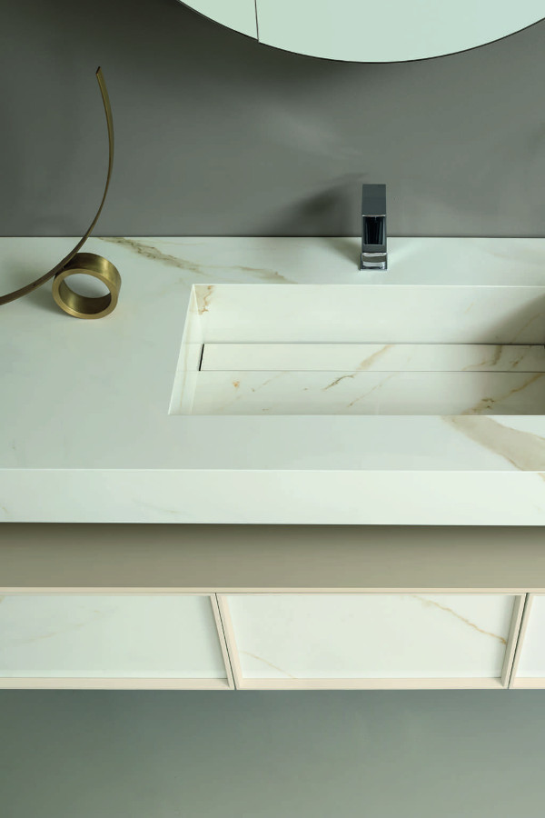 Die Design-Idee, auf der die Kollektion basiert, ist die Realisierung einer Front mit Rahmen: der Rahmen ist in zwei furnierten Ausführungen erhältlich, Noce Chiaro und Eucalipto, zusätzlich zu den matten lackierten Ausführungen in jeder Farbe, und kann mit dem Frontpaneel, in vielen verschiedenen Materialien erhältlich, kombiniert werden: somit Farbkombinationen nach Wunsch realisieren.
