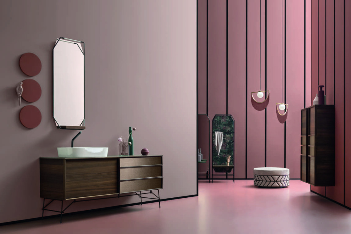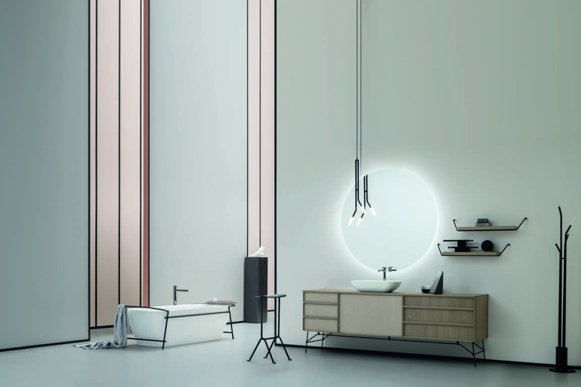 Die Kollektion DES lässt sich nicht nur durch verschiedene Materialien bereichern, sondern auch durch besondere Füße, die an die Möbelvorschläge des frühen 20. Jahrhunderts erinnern und aus schwarz lackiertem Metall bestehen. Dieses schwarze lackierte Metall wird auch in anderen Ergänzungen dieser Kollektion vorgeschlagen, deren Ästhetik einen wichtigen Einrichtungswert schafft: die besonderen Hochschränke, die ausgestatteten Paravents, die Mehrzwecken Kleiderständer, die Spiegel mit integrierter Beleuchtung, die freistehende Badewanne, die Couchtische und die Sessel.