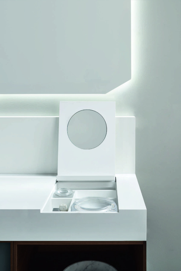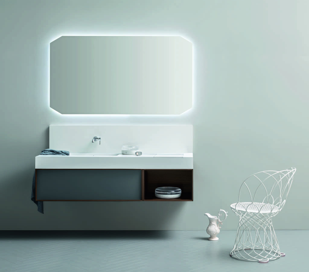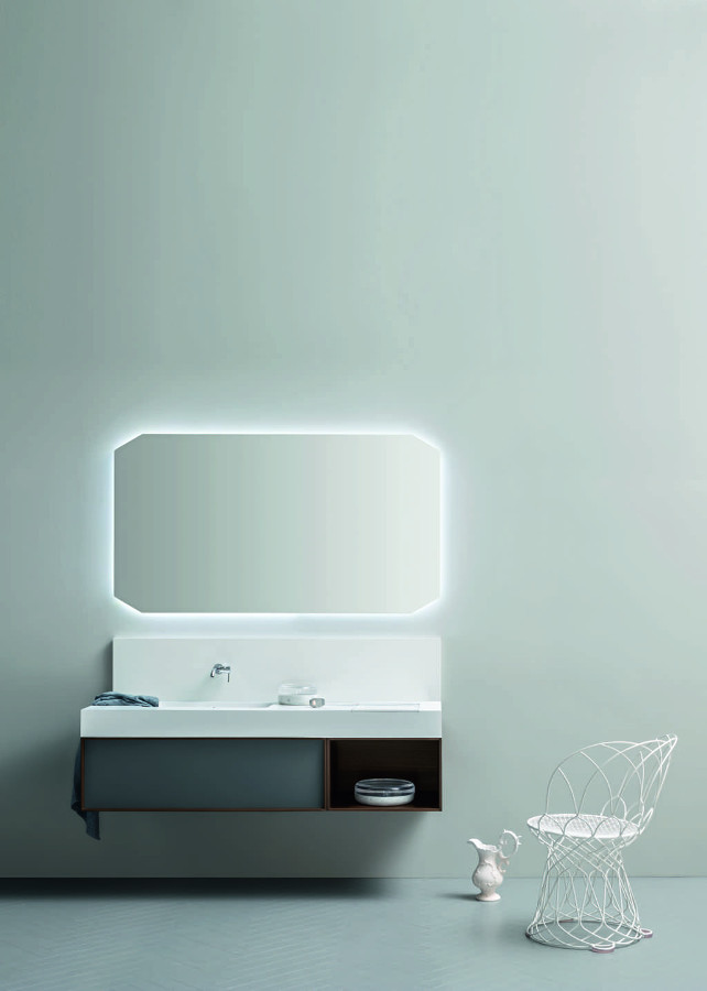 Die Kollektion DES lässt sich nicht nur durch verschiedene Materialien bereichern, sondern auch durch besondere Füße, die an die Möbelvorschläge des frühen 20. Jahrhunderts erinnern und aus schwarz lackiertem Metall bestehen. Dieses schwarze lackierte Metall wird auch in anderen Ergänzungen dieser Kollektion vorgeschlagen, deren Ästhetik einen wichtigen Einrichtungswert schafft: die besonderen Hochschränke, die ausgestatteten Paravents, die Mehrzwecken Kleiderständer, die Spiegel mit integrierter Beleuchtung, die freistehende Badewanne, die Couchtische und die Sessel.