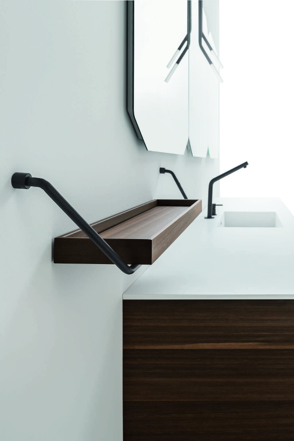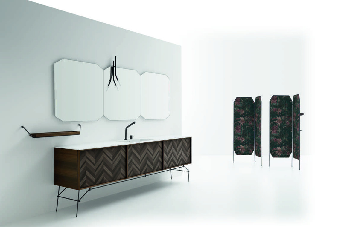 Die Kollektion DES lässt sich nicht nur durch verschiedene Materialien bereichern, sondern auch durch besondere Füße, die an die Möbelvorschläge des frühen 20. Jahrhunderts erinnern und aus schwarz lackiertem Metall bestehen. Dieses schwarze lackierte Metall wird auch in anderen Ergänzungen dieser Kollektion vorgeschlagen, deren Ästhetik einen wichtigen Einrichtungswert schafft: die besonderen Hochschränke, die ausgestatteten Paravents, die Mehrzwecken Kleiderständer, die Spiegel mit integrierter Beleuchtung, die freistehende Badewanne, die Couchtische und die Sessel.