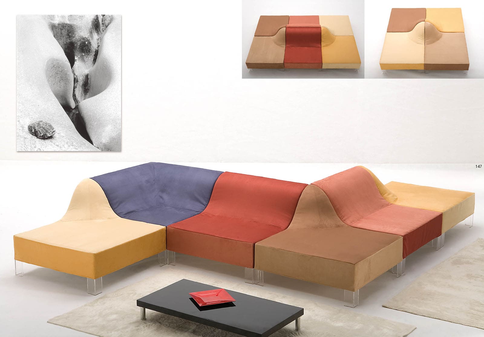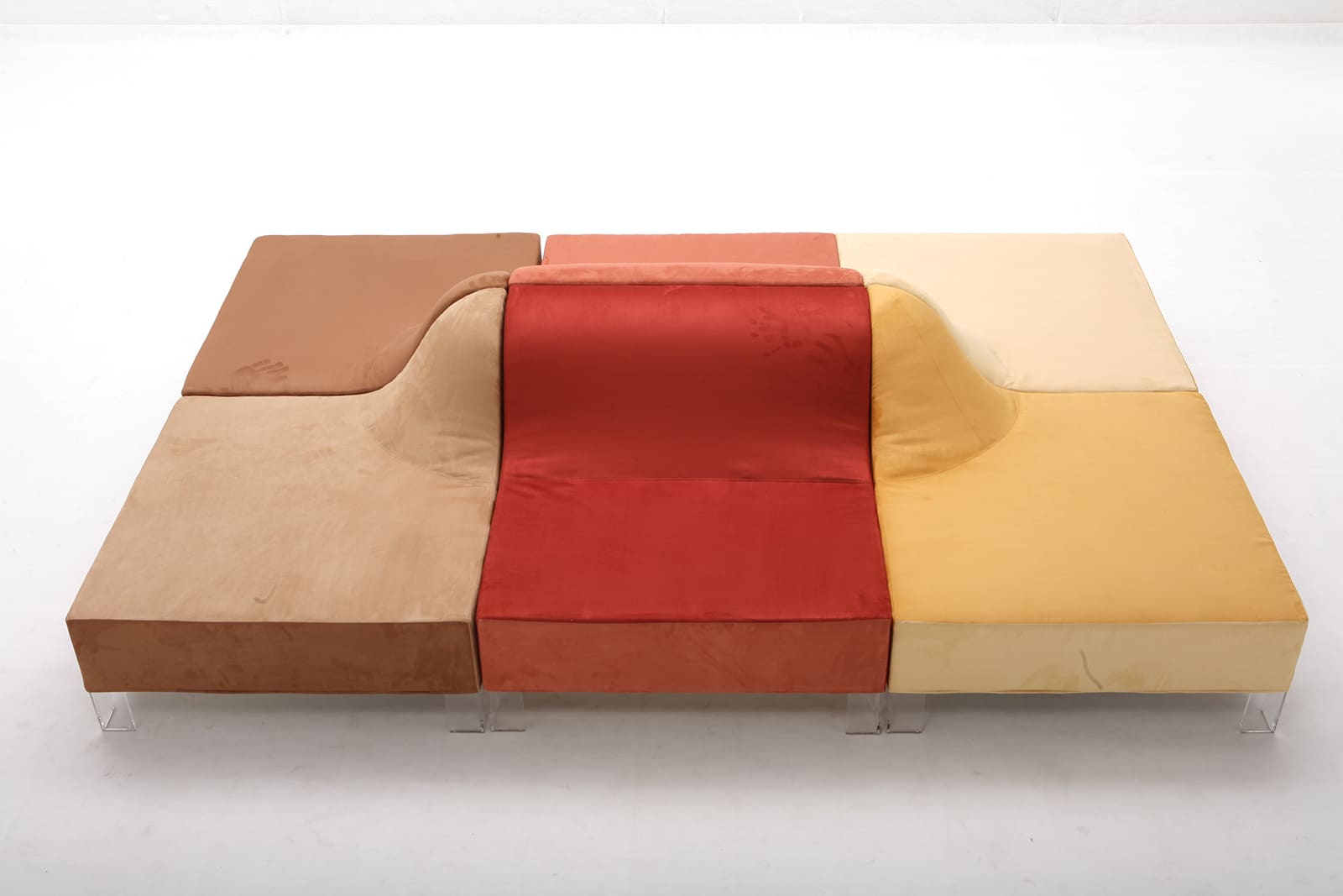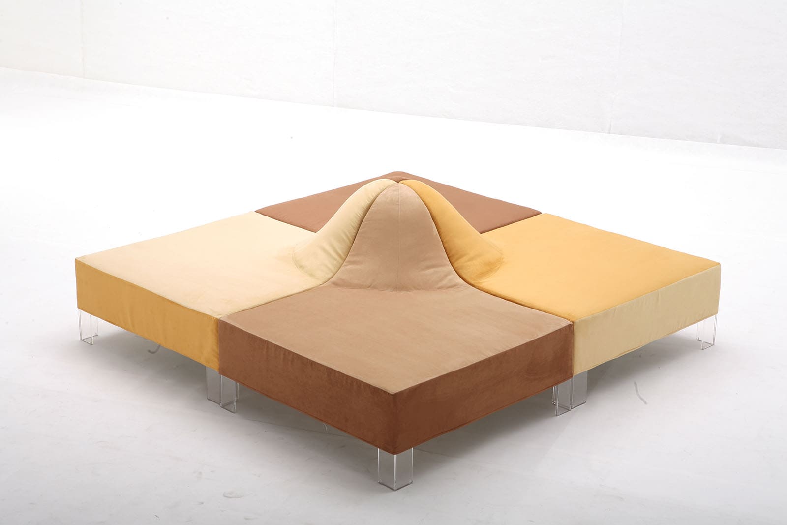 Eine Wohlfühloase, die uns willkommen heißt und uns nach einem anstrengenden Tag in ihren Sanddünen wiegt. Diese modularen Elemente, die aus Giovannettis Forschung und Experimentierlust hervorgegangen sind, stellen ein Programm dar, das sich selbst zusammensetzt und sich an die Bedürfnisse des Raums anpasst, in den es eingefügt wird.