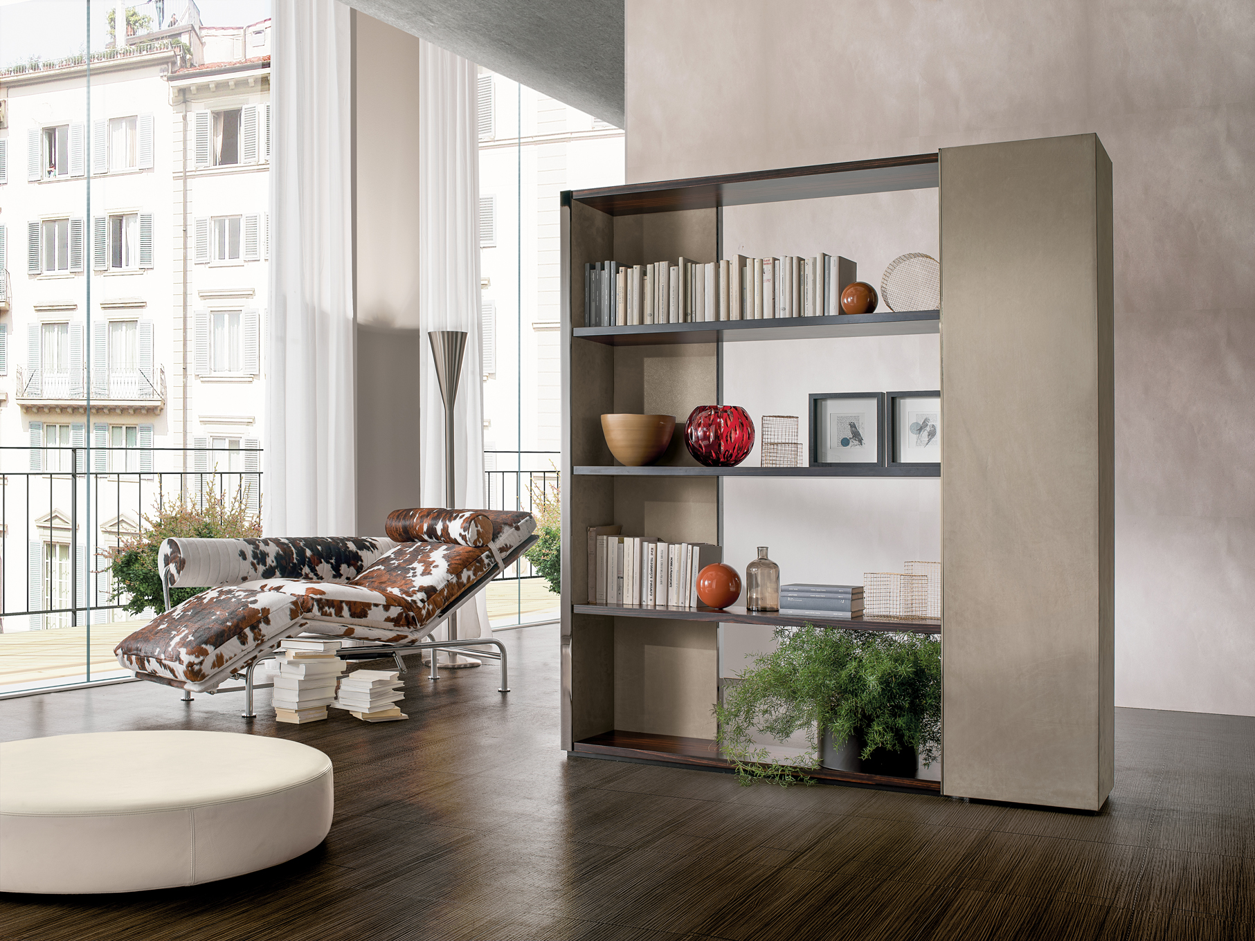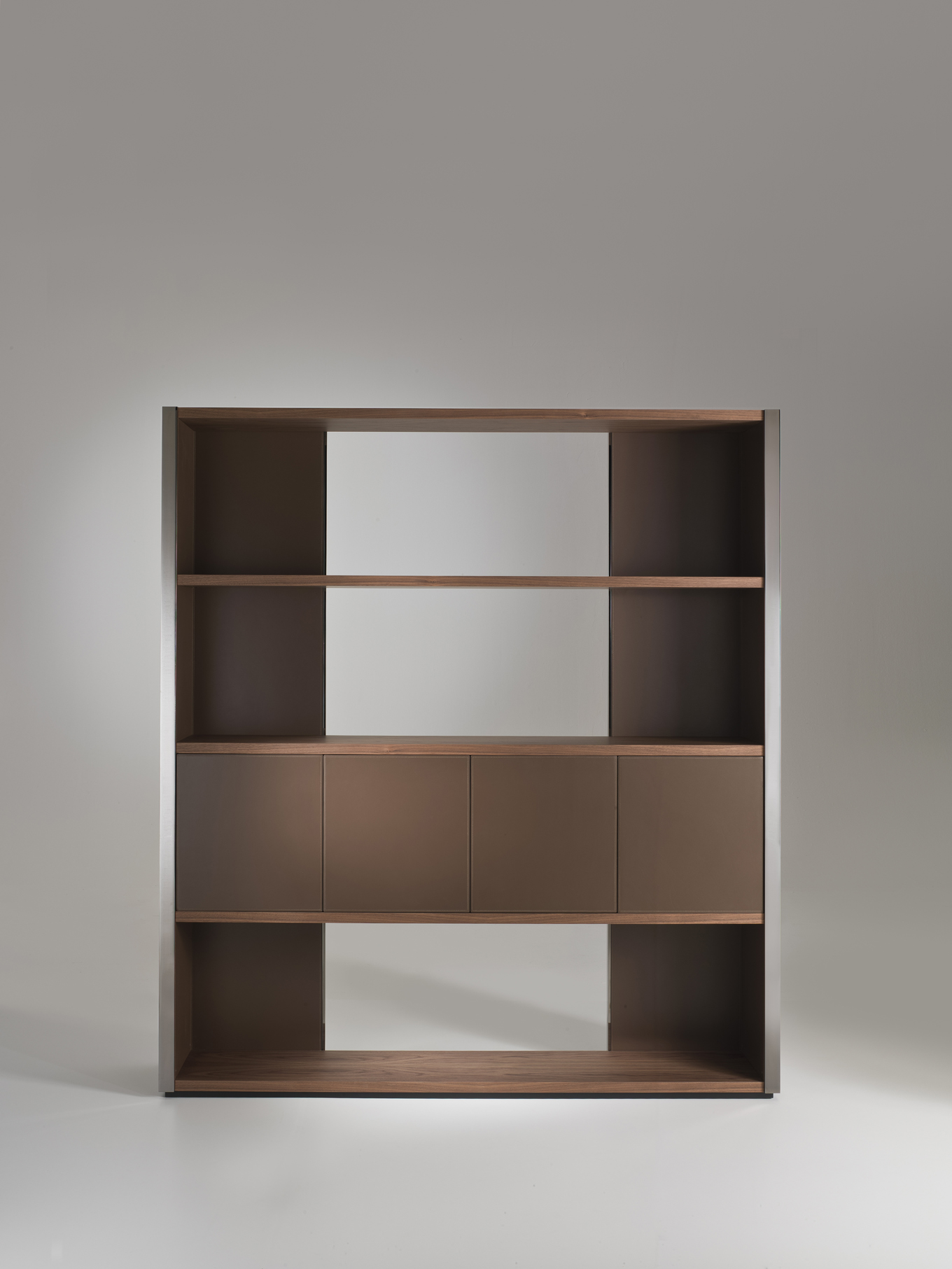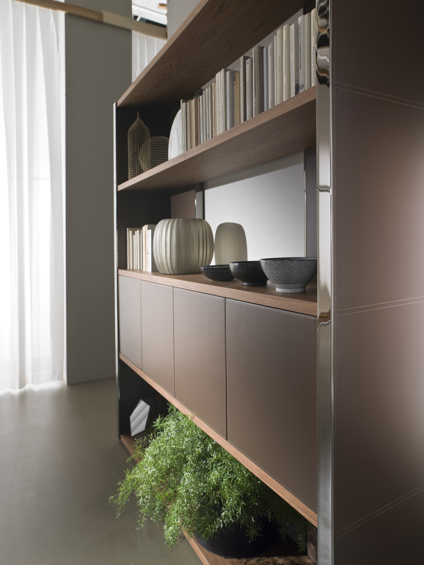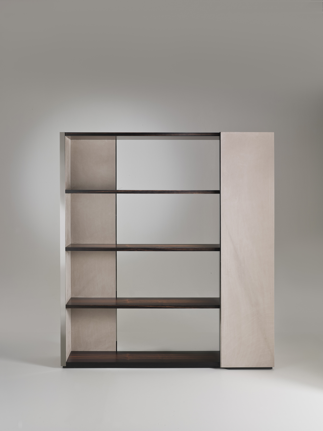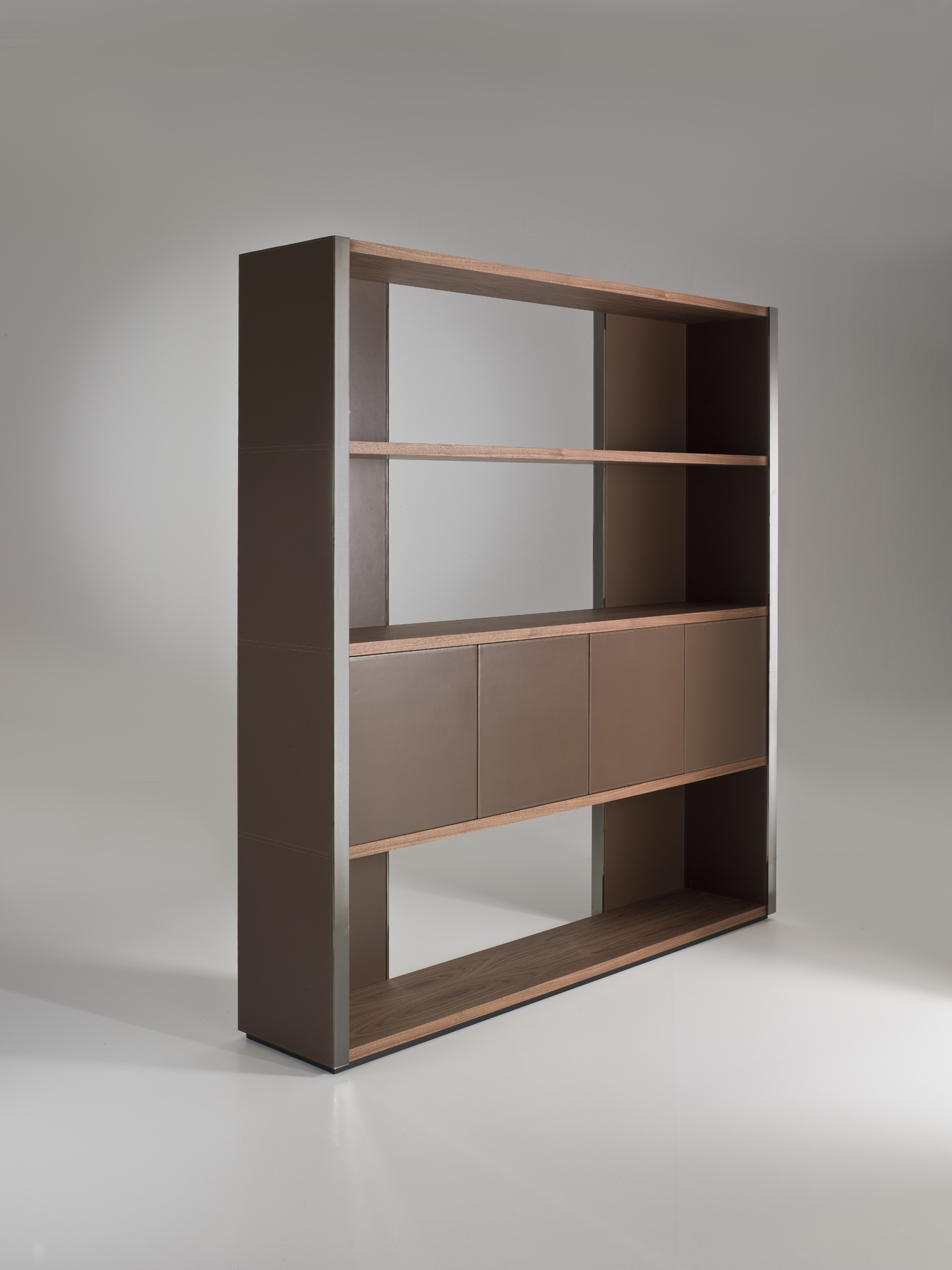 Die Vertikalrahmen sind in schwarz Melaminharzbeschichtete Platten 40 mm. Dicke in Rindleder oder Leder. Die horizontale Regalboden sind in Spanplatten 30 mm. Dicke, waehrend die optionalen Tueren und Rueckwande eine Dicke von 20 mm. Die vertikalen Profile sind in schwarz verchromtem Stahl.