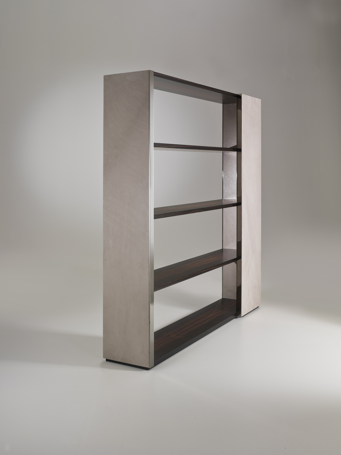 Das Modell ist mit vertikalen Elementen bedeckt in Rindleder oder Leder zur Verfuegung, werden die horizontalen Einlegeboden in Ebenholz Macassar, schwarz Walnussholz oder dunkelbraun Eicheholz furniert, oder auf Anfrage, furniert mit einem anderen Holz der Sammlung.