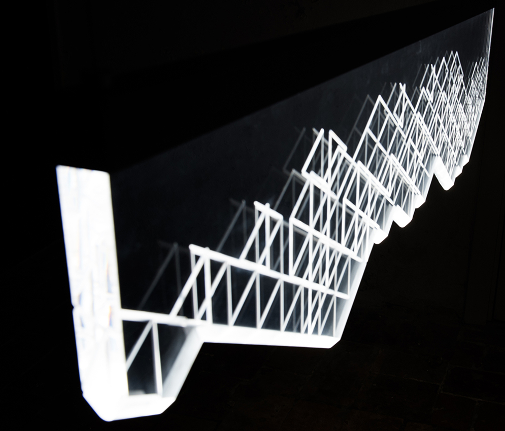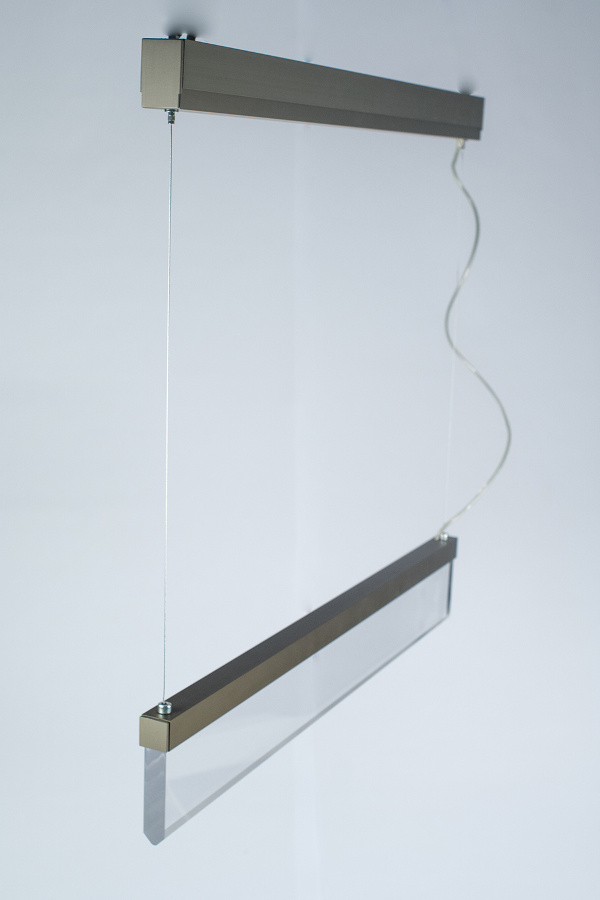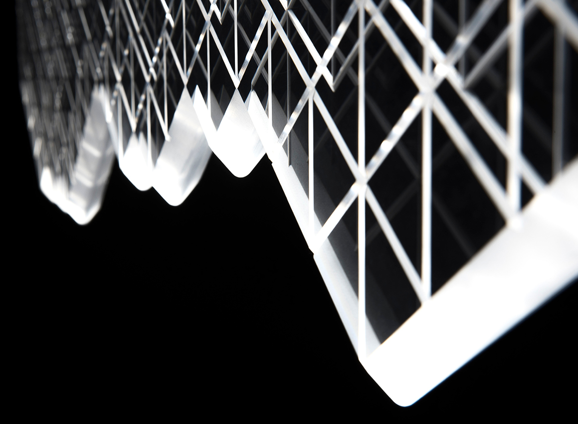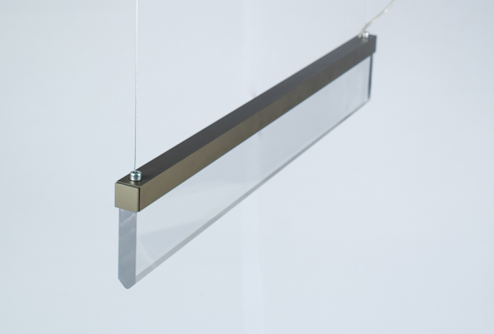 … eine Klinge aus Licht. Aus einem dünnen Metallprofil schaut eine Platte aus Plexiglas hervor, die so ausgelegt ist, dass sie die maximale Lichtmenge in der Umgebung bestmöglich verteilt. Das geometrische Muster, das asymmetrisch auf beiden Seiten der Platte gelegt wird, trägt dazu bei, zusätzlich zum Strahlen einen Tiefeneffekt zu erzeugen. Eine reine leuchtende Essenz …