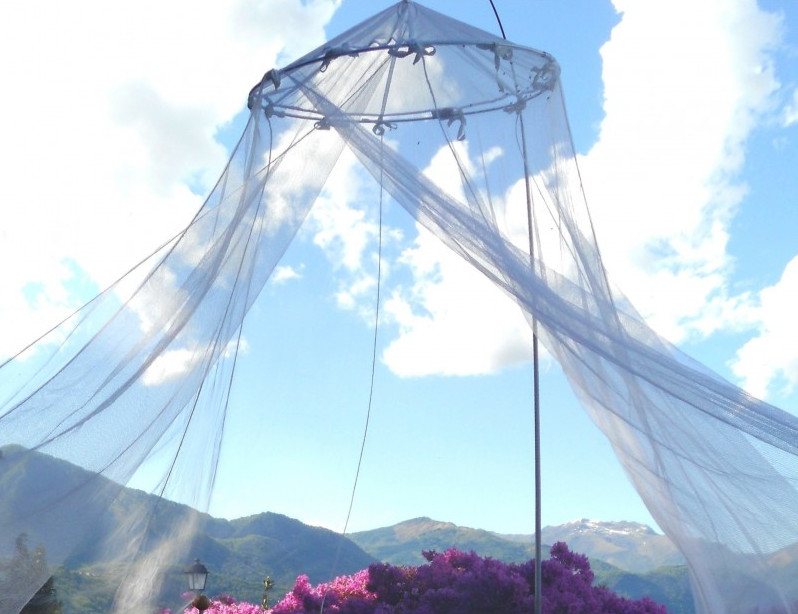 Das Gestell ist flexibel, teleskopisch und leicht. Es lässt sich fest durch einen Pflock am Boden befestigen. Im Falle von graslosen Oberflächen wird zur Befestigung einen Zubehörteil geliefert, um das Gestell mit einem Sonnenschirmständer zu verbinden. Das Netz ist kegelförmig und weit; durch vier Aluminium-Stangen kann es weiter ausgebreitet werden, um einen behaglichen inneren Raum zu erhalten. Der Kit passt in einen vertikalen, umhängbaren Sack und ist leicht zu tragen.