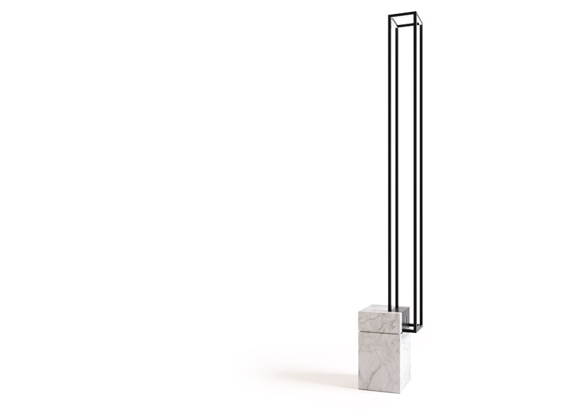 Lampe mit LED-Technologie aus emailliertem Metallrohr und weißem Carrara-Marmor als Sockel.