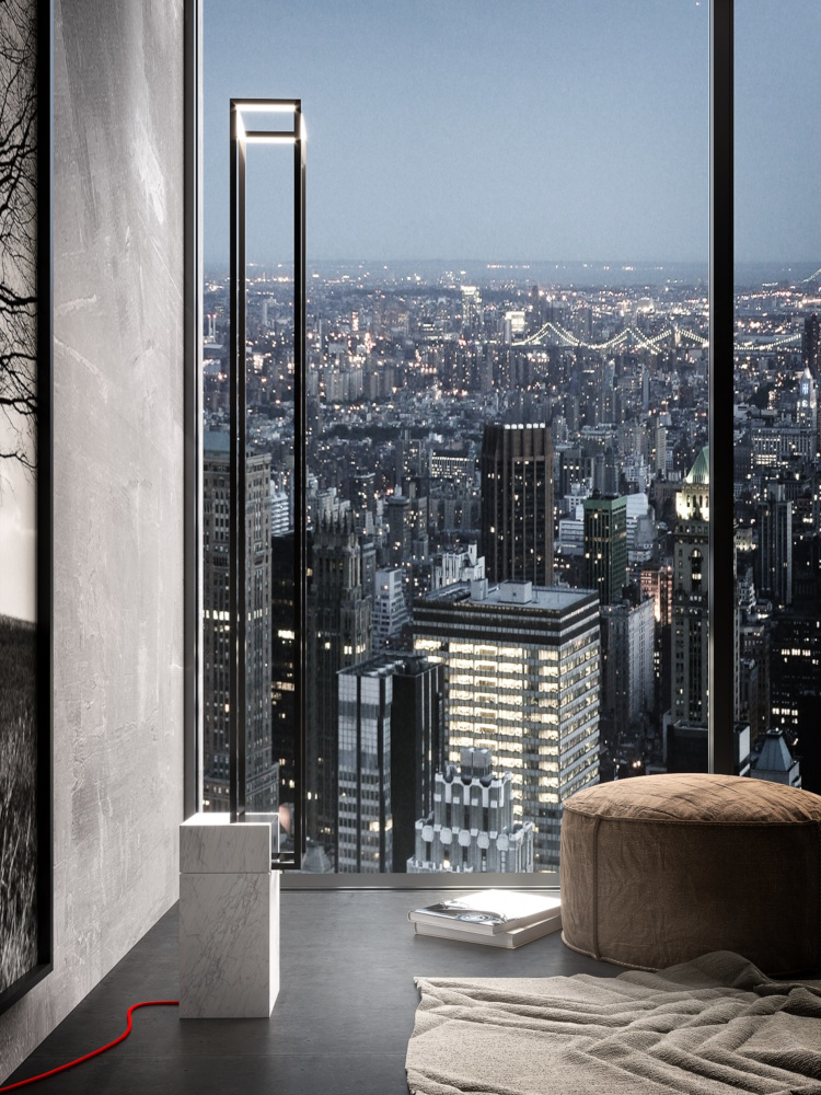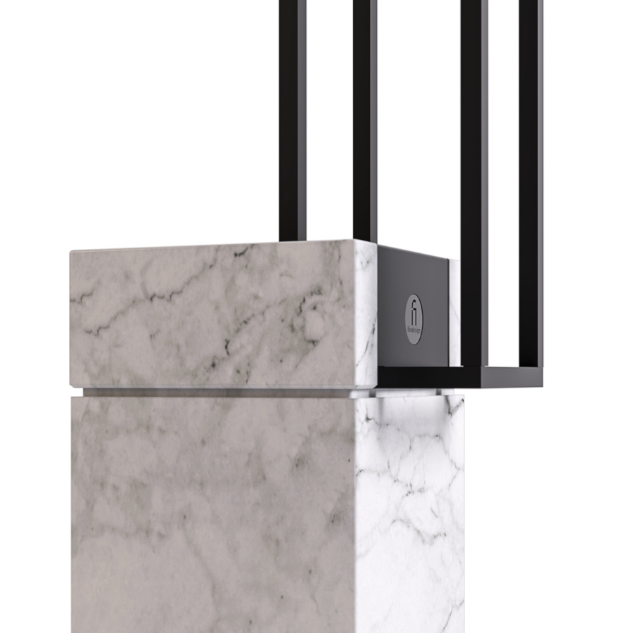 Filostone ist eine Stehleuchte mit 300 Lumen Lichtstärke, 3000 Kelvin Farbtemperatur und nur 6 Watt Verbrauch. Der Marmorsockel hat ein Gewicht von ca. 25 kg. Das Metallprofil ist im Gegensatz zum weißen Carrara-Marmor undurchsichtig schwarz.