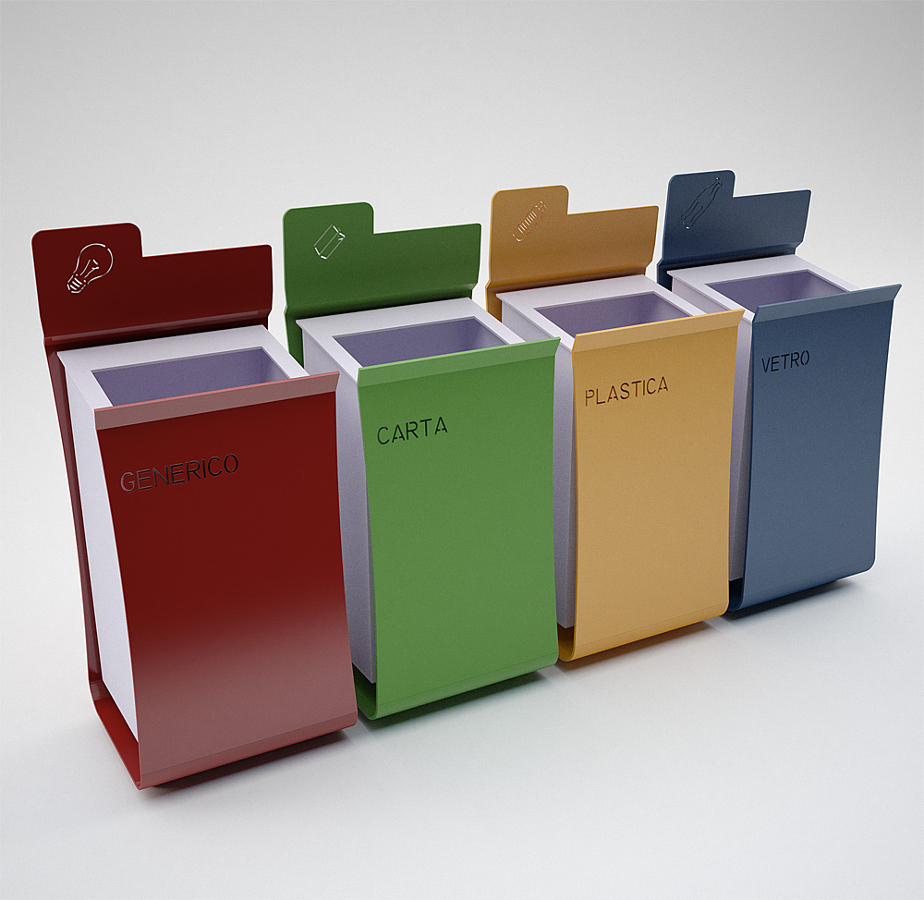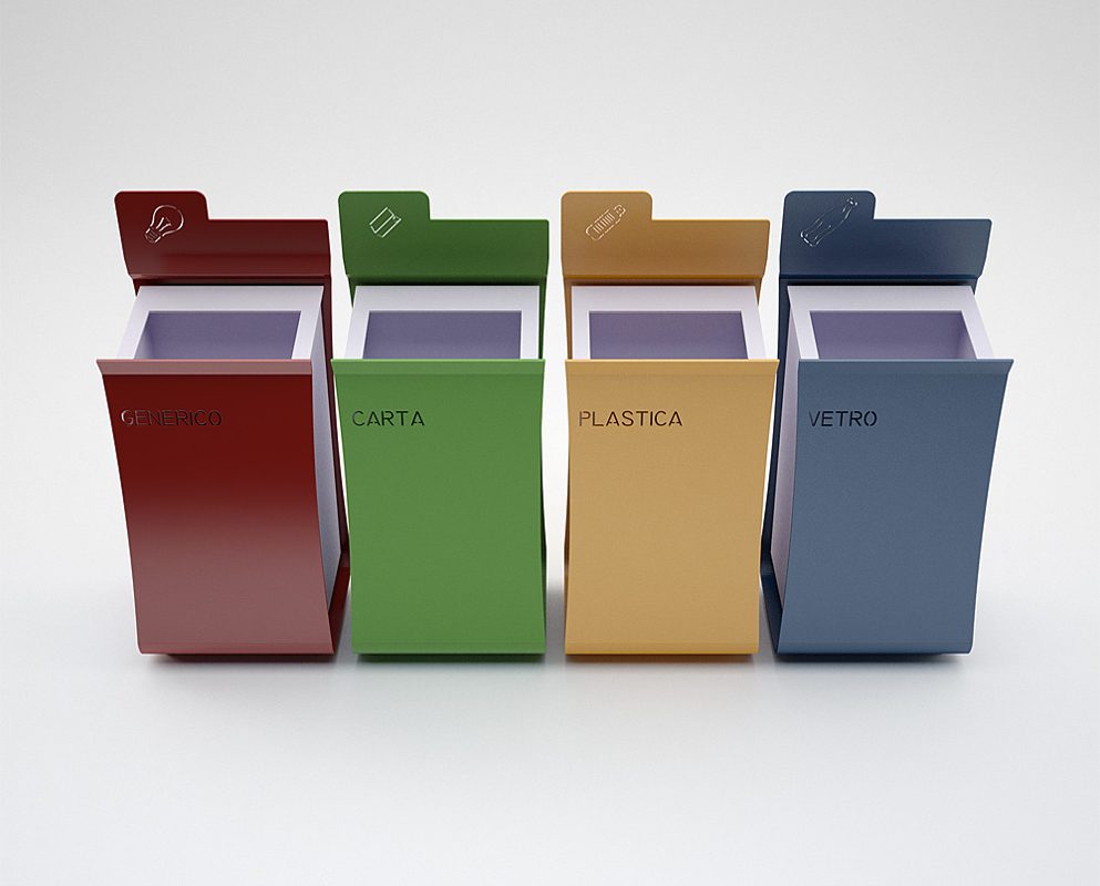 COMPOSITION: – composed of a single plate laser cut and bent, on the top there is one hole for the insertion of trash . – Bin for Trash Laser cutting and bent , welded on the supporting structure, contrasting color. – Inner vessel steel sheet, bent. – Superior square laser cutting ring for put off the trash bag.