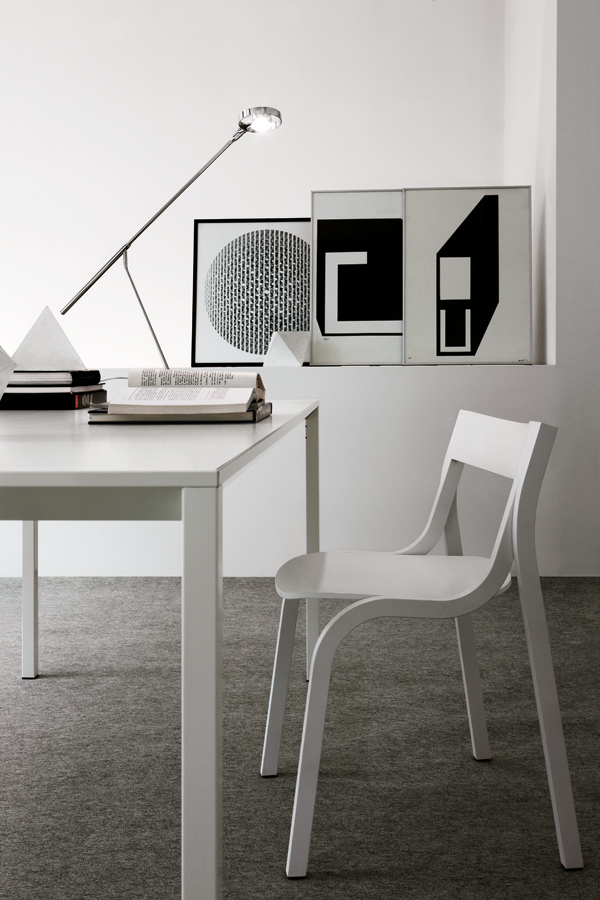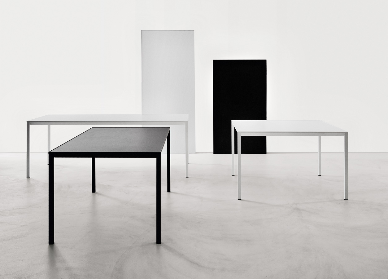 Tisch mit Gestell aus pulverlackiertem Aluminium, schwarz oder weiß, in verschiedenen Größen zum Gebrauch in Wohnräumen oder im Objektbereich.