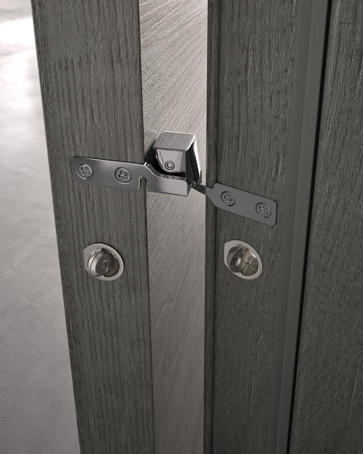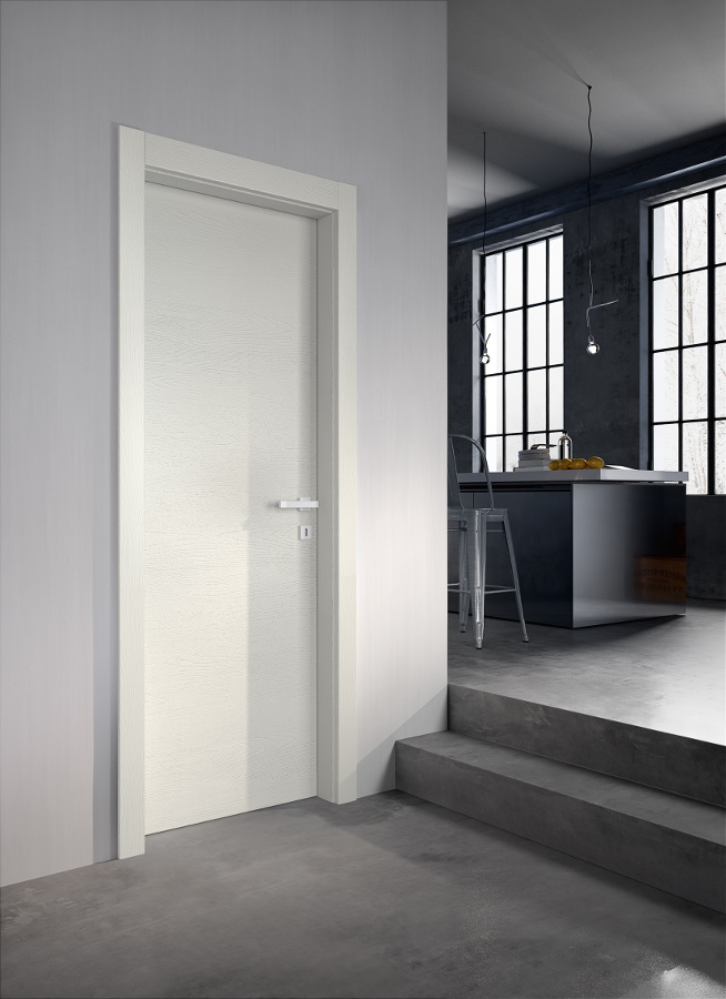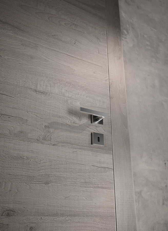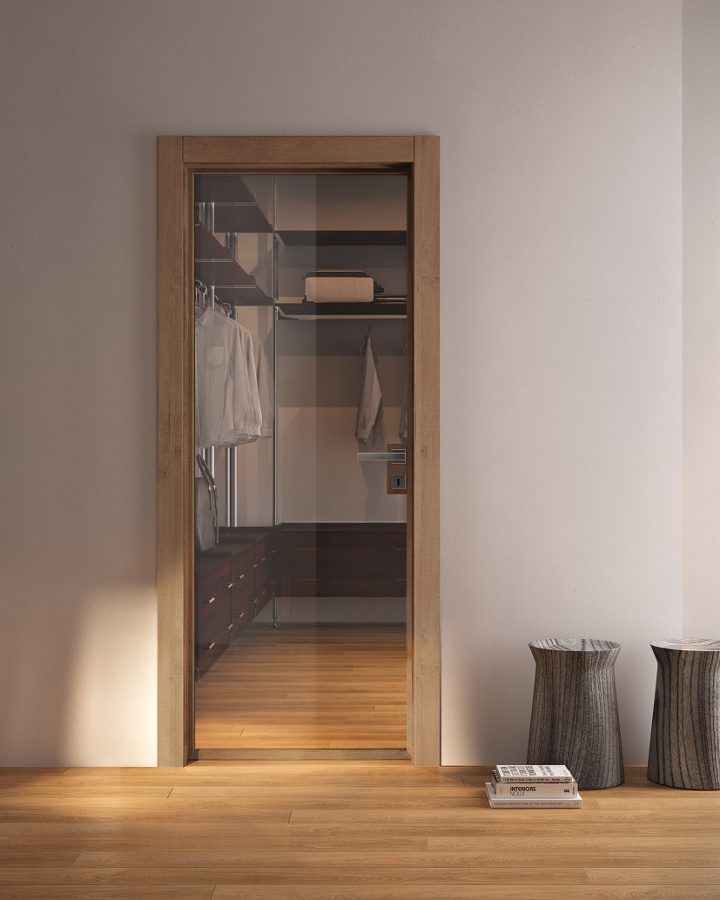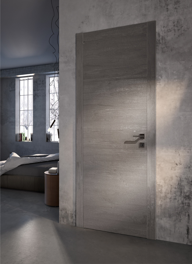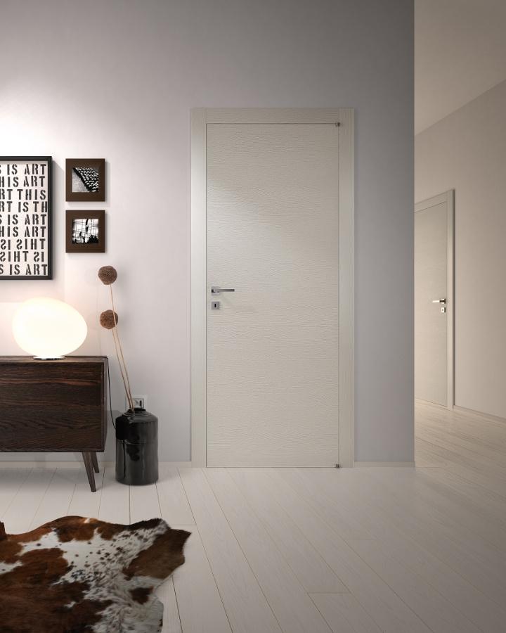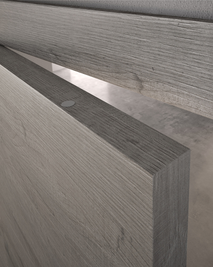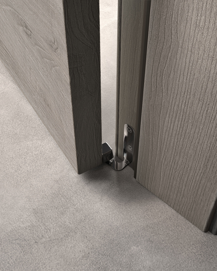 Die komplanare Tür Grain ist ausgestattet mit Magnetverschluss (Standard), Schwingscharnieren (als Option auch die Ausführung mit versenkten Scharnieren erhältlich) und wird je nach Stil und Einrichtung in glatter Ausführung und aus Glas mit Minimalprofil angeboten.