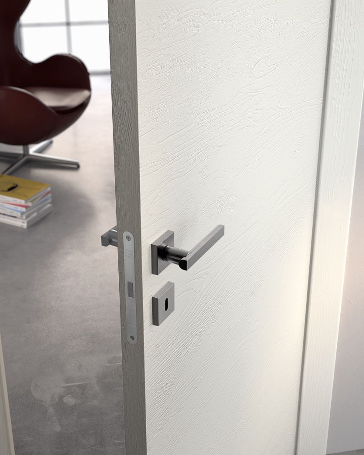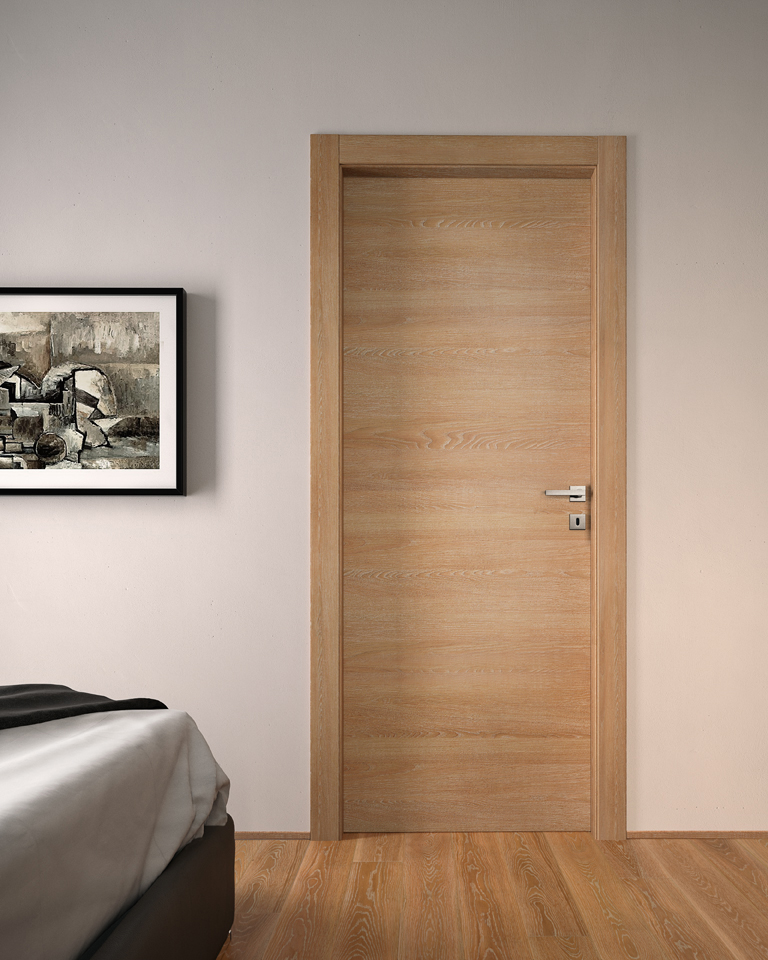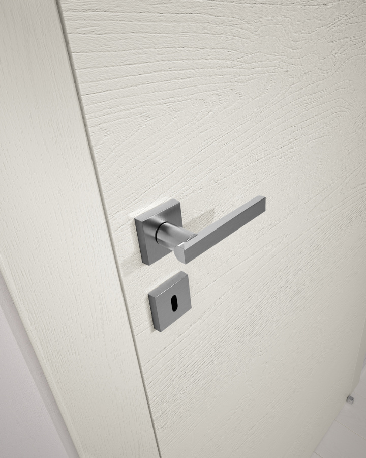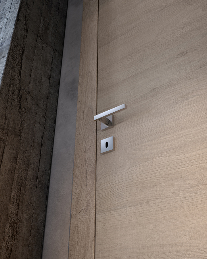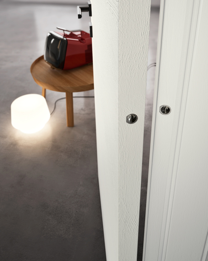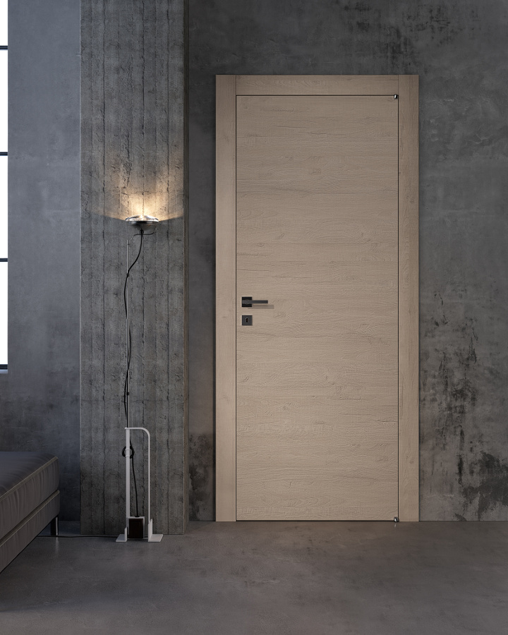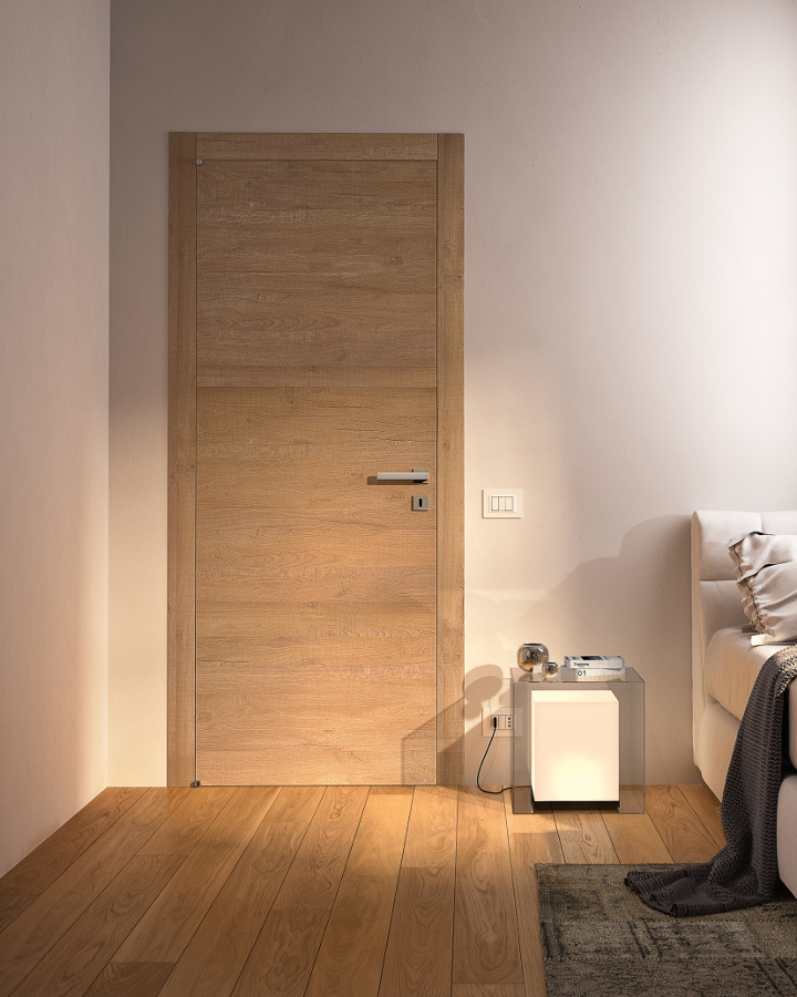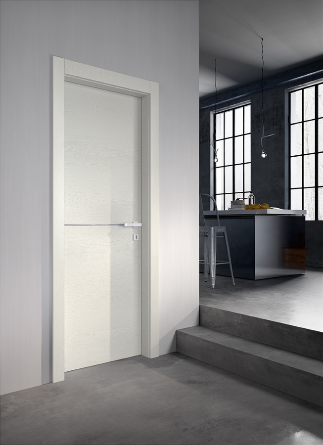 Die komplanare Tür Grain ist ausgestattet mit Magnetverschluss (Standard), Schwingscharnieren (als Option auch die Ausführung mit versenkten Scharnieren erhältlich) und wird je nach Stil und Einrichtung in glatter Ausführung und aus Glas mit Minimalprofil angeboten.