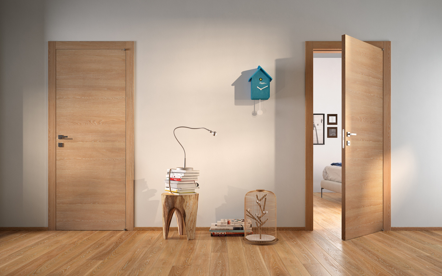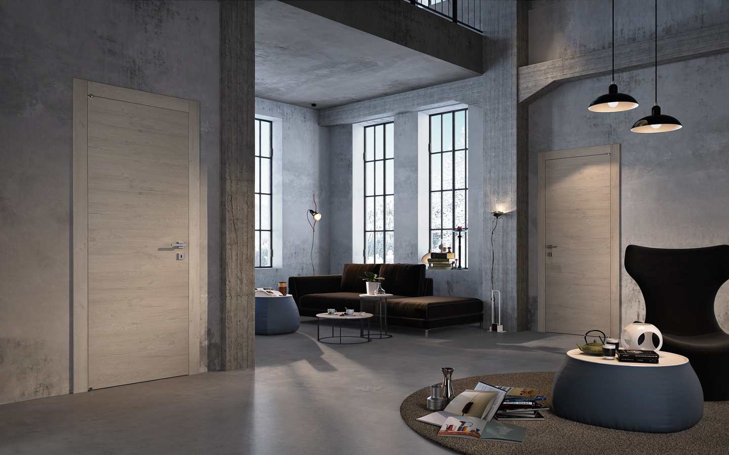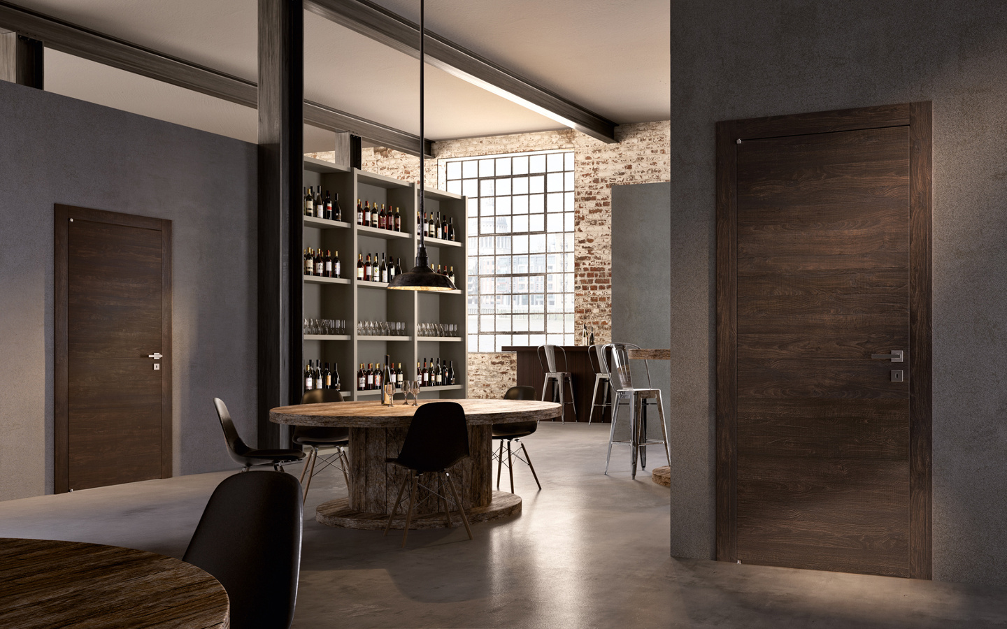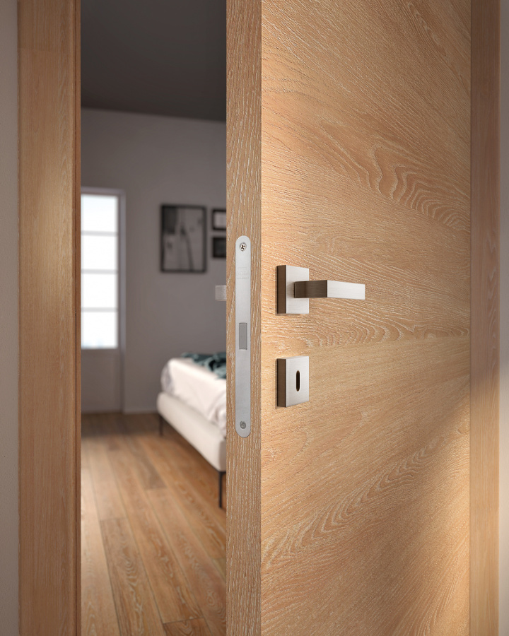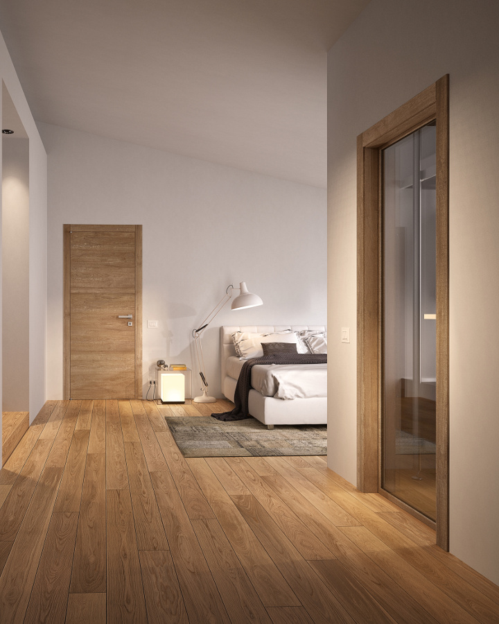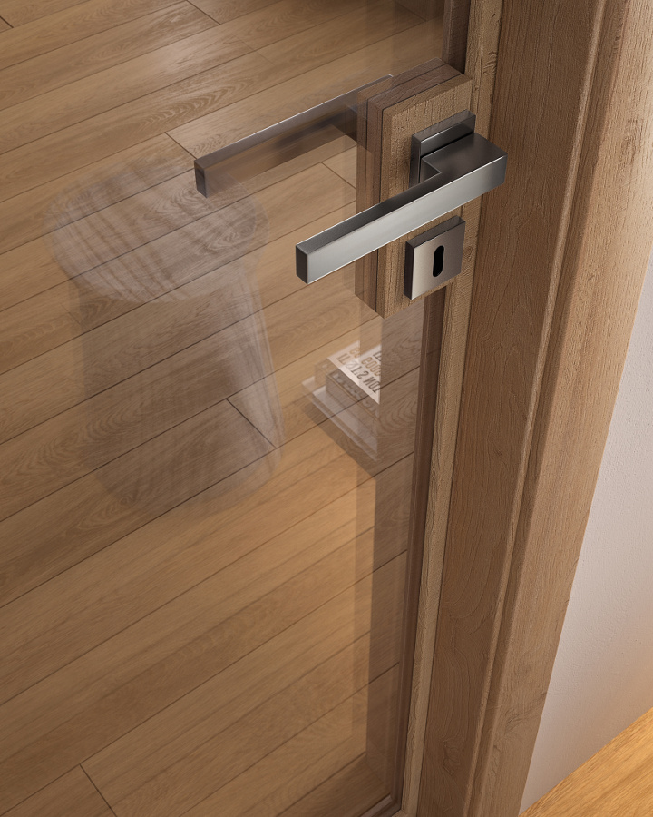 Die komplanare Tür Grain ist ausgestattet mit Magnetverschluss (Standard), Schwingscharnieren (als Option auch die Ausführung mit versenkten Scharnieren erhältlich) und wird je nach Stil und Einrichtung in glatter Ausführung und aus Glas mit Minimalprofil angeboten.