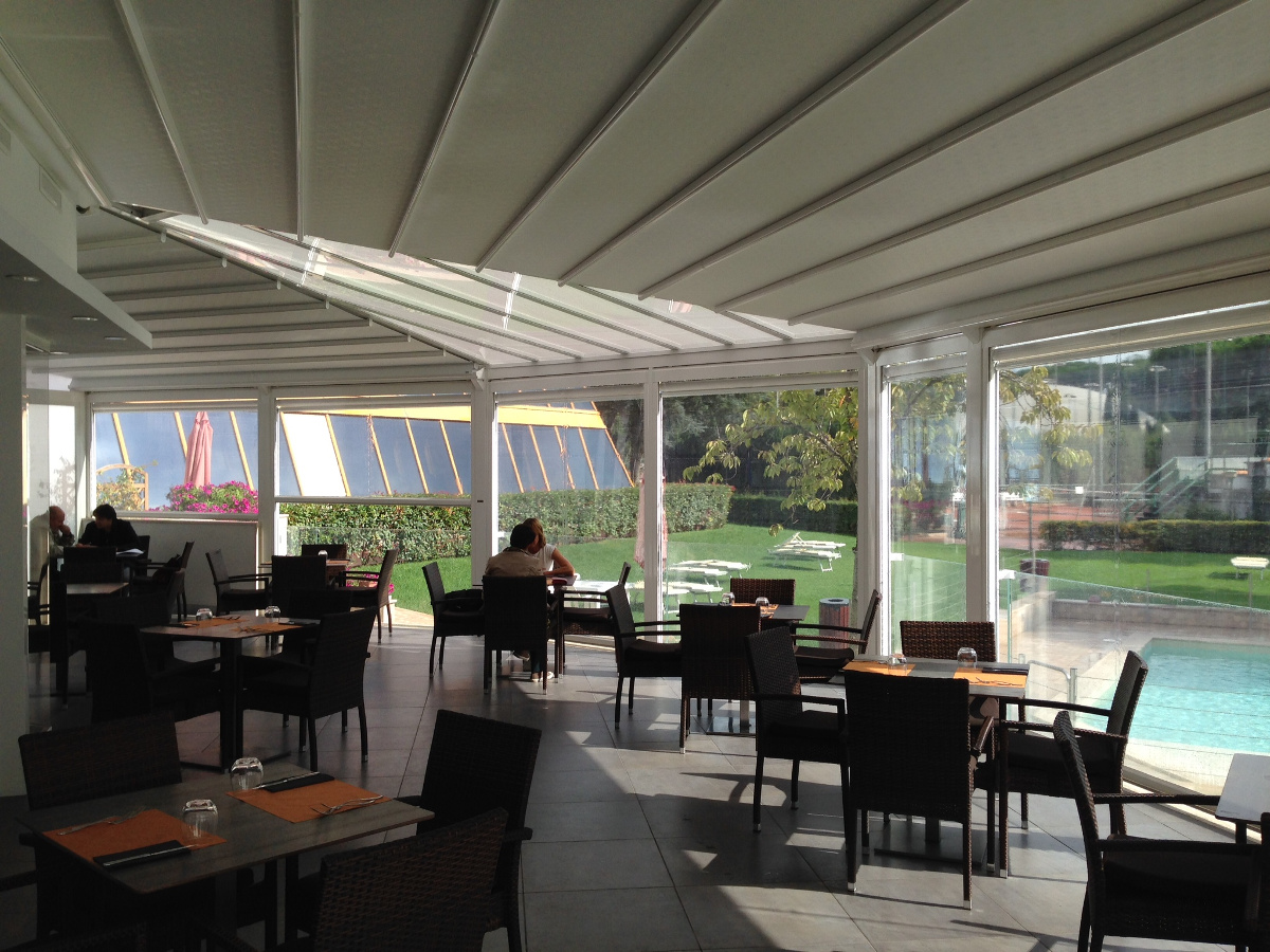 Impact patentiertes wasserdichten Pergoladach Sonnenschutz aus Tuch mit Aufrollverschluss