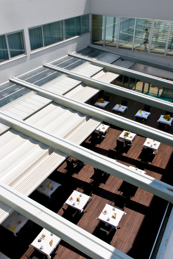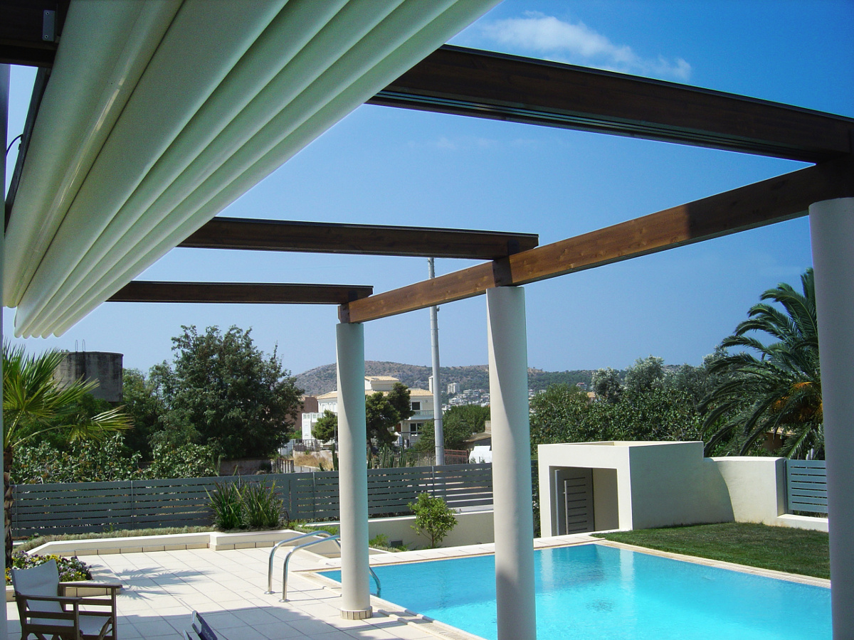 / Impact patentiertes wasserdichten Pergoladach Sonnenschutz aus Tuch mit Aufrollverschluss