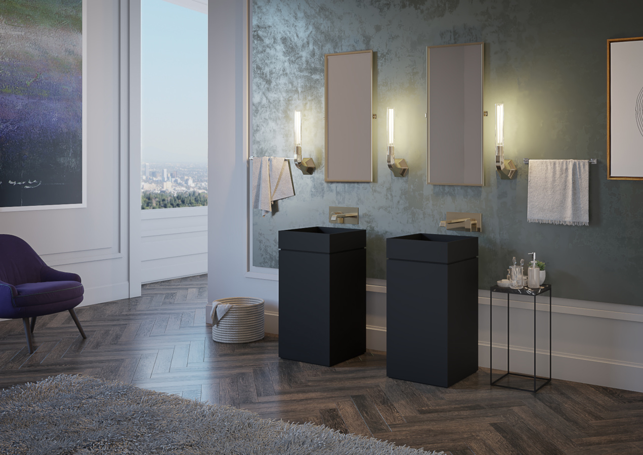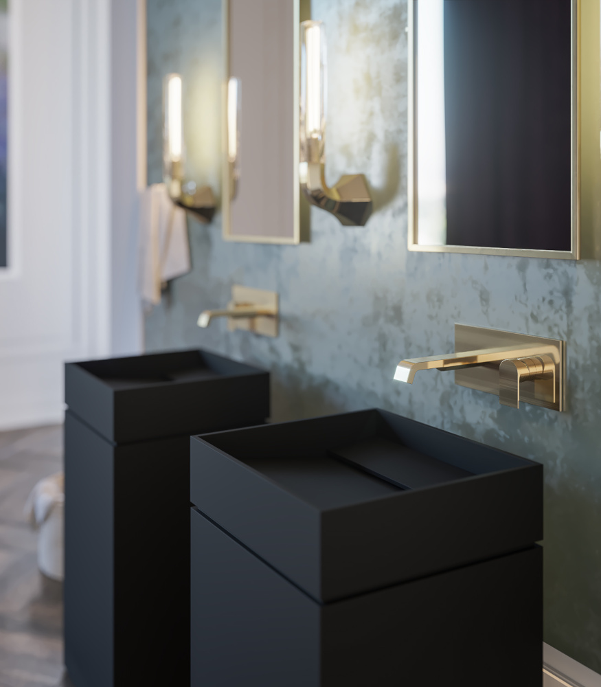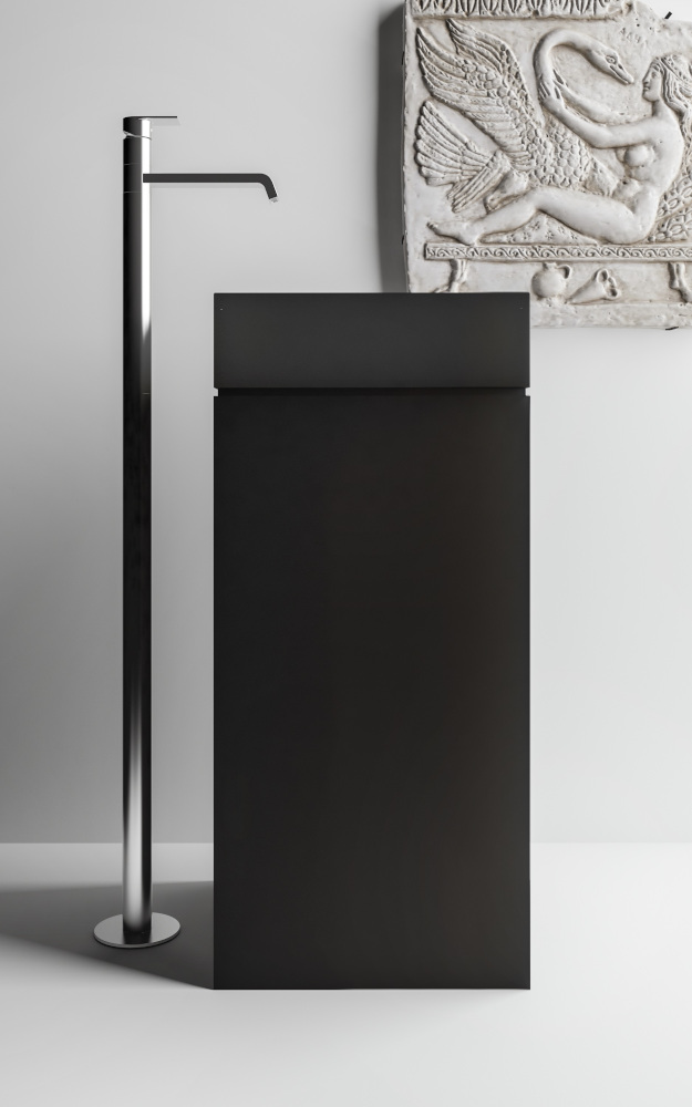 Ein doppelt geneigter Plan schafft einen Schlitz, durch den das Wasser abfließen kann… Das Design möchte an die alten italienischen Steinwaschanlagen erinnern, bei denen das Geräusch des Wassers sanft und kontinuierlich war. Leicht zu inspizieren, wenn nötig.