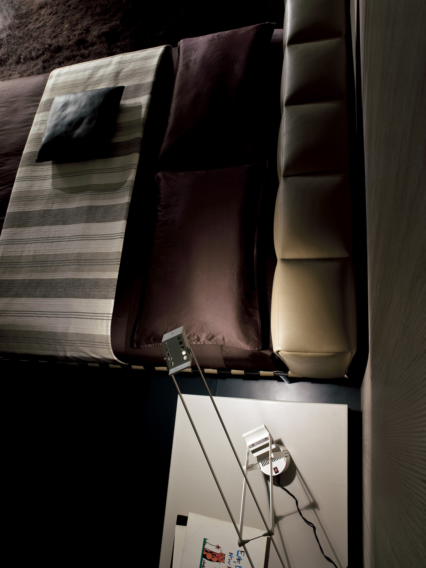 Das Kopfende des Bettes besteht aus veredeltem Paneel, bezogen mit unverformbaren FCKW- freien PUR-Platten mit unterschiedlicher Dichte von 75 kg/m3, ausserdem hat die Rückenfront eine Dichte von 30 kg/m3 . Das Kopfende ist an einem Rohrstahlgestell mit Epoxypulver Lackierung eingesetzt auf dem ein Holzlattenrost liegt. Entlang dieser Struktur sind Rindledergürtel fixiert.