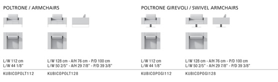 Die tragende Struktur besteht aus massivem Pappelholz und Ulmenholz mit einigen Verbindungselementen aus Pappelsperrholz; das Holz wurde auf “natürliche” Weise für mindestens drei Jahre im Unternehmen auf Stapeln getrocknet. Die verschiedenen Strukturelemente sind mit zylindrischen Stiften verbunden. Die Federung der Sitzfläche besteht aus elastischen Gurten aus Polypropylen und Naturkautschuk in zweifacher Abmessung und Elastizität. Senkrecht zur Länge von Kubico sind parallel nebeneinander Gurte von 9 cm mit einer Elastizität von 20% befestigt; diese werden abwechselnd von Gurten von 5 cm mit einer Elastizität von 80% gekreuzt. Die Polsterung der Struktur besteht aus unverformbaren, FCKW-freien PUR-Platten (mit Dichte 75 kg/m³), und ist überzogen mit Polyesterwatte und Verbundvelours. Die abziehbaren Sitz- und Rückkissen bestehen aus waterlily™ (mit Dichte 45 kg/m³) und sind überzogen mit Polyesterwatte und Verbundvelours; die Rückkissen haben innen eine Esoflex-beilage. Das ist ein Material, das Flexibilität der Länge aber nicht der Höhe von Kissen erlaubt. So haben die Rückkissen die richtige Tragfähigkeit auch mit einem niedrigen Rückenpolster. Die Traeger sind aus einem quadraten Chromstahl-Rohr in drei mögliche Ausführungen: Anstrich in 8 Farbe mit Epoxydpulverbeschichtung; Verchromung; Bronzieren.